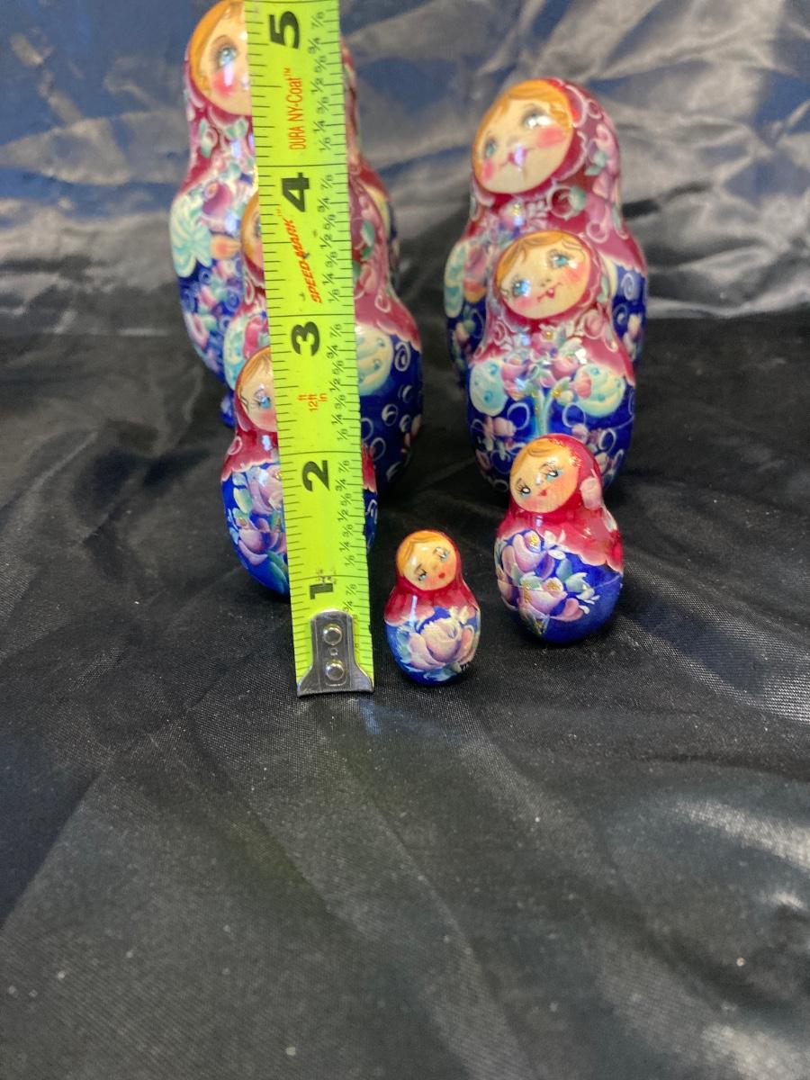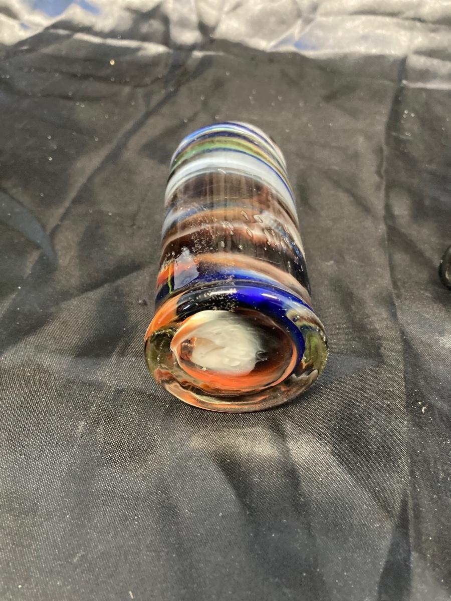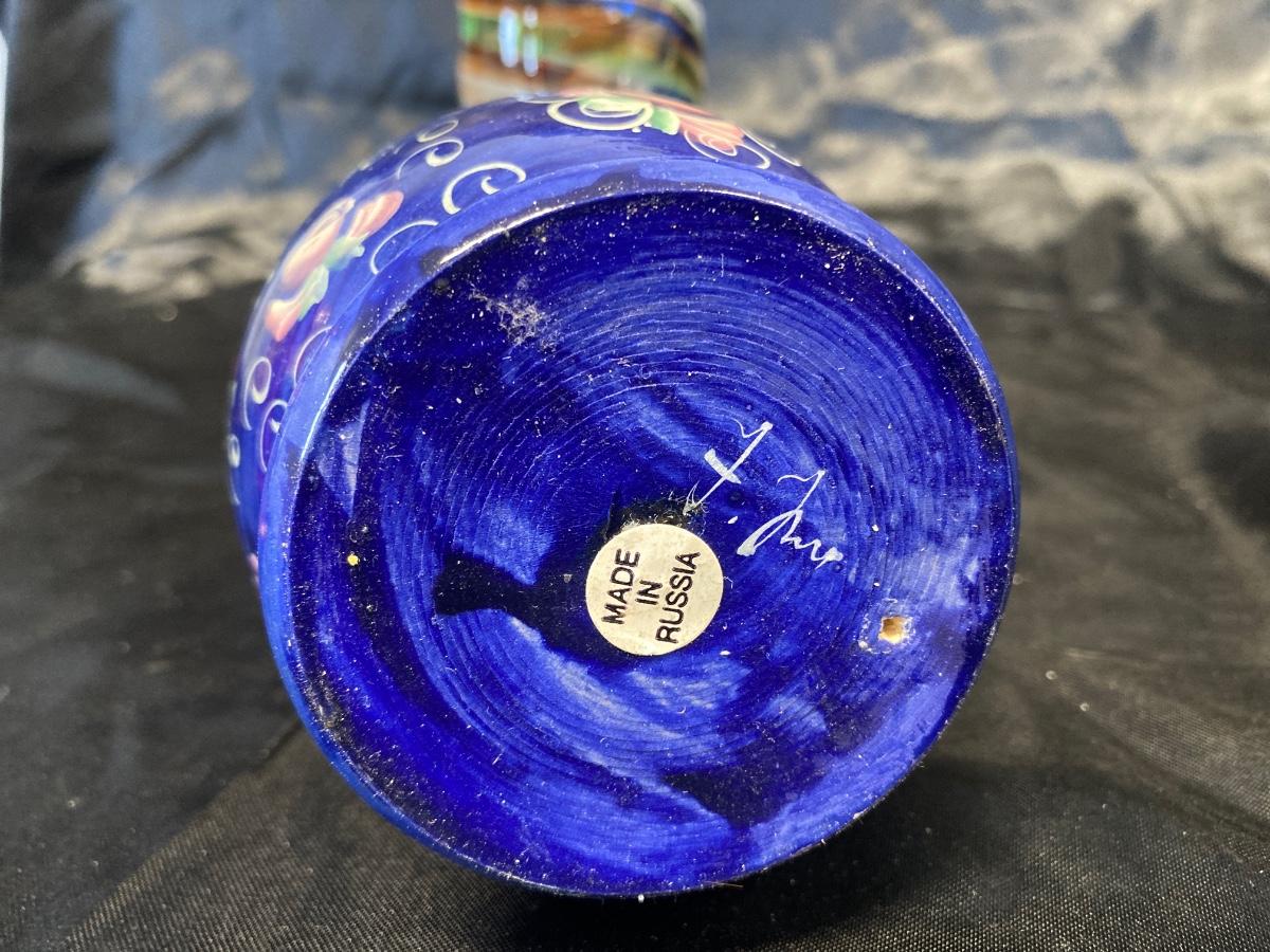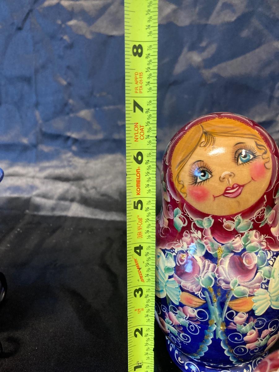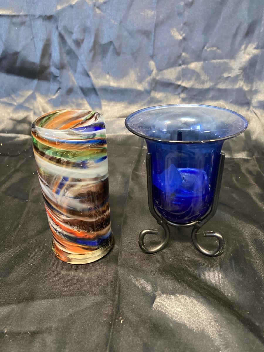 VINTAGE RUSSIAN NESTING DOLL, COLORFUL SWIRLED GLASS AND BLUE CANDLEHOLDER