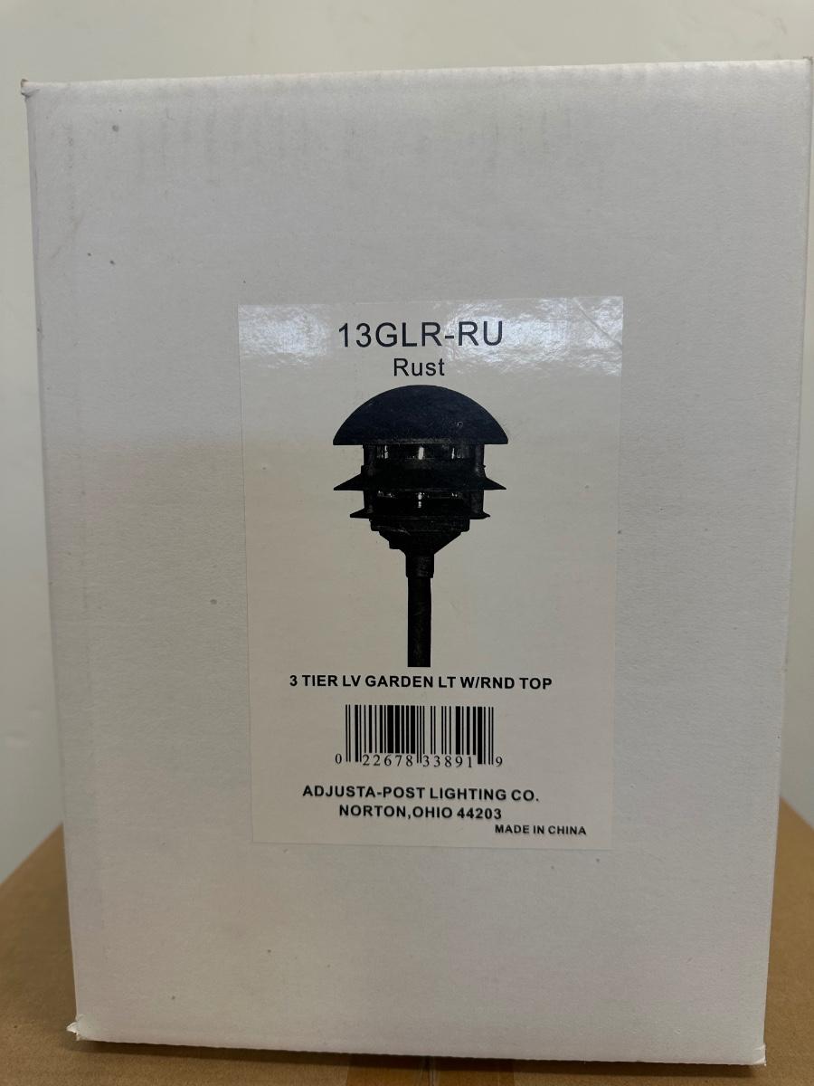 BOX OF FOUR 3 TIER, RUST COLOR LOW VOLTAGE METAL ROUND TOP GARDEN LIGHTS BY ADJUSTA-POST LIGHTING CO. MODEL 13GLR-RU
