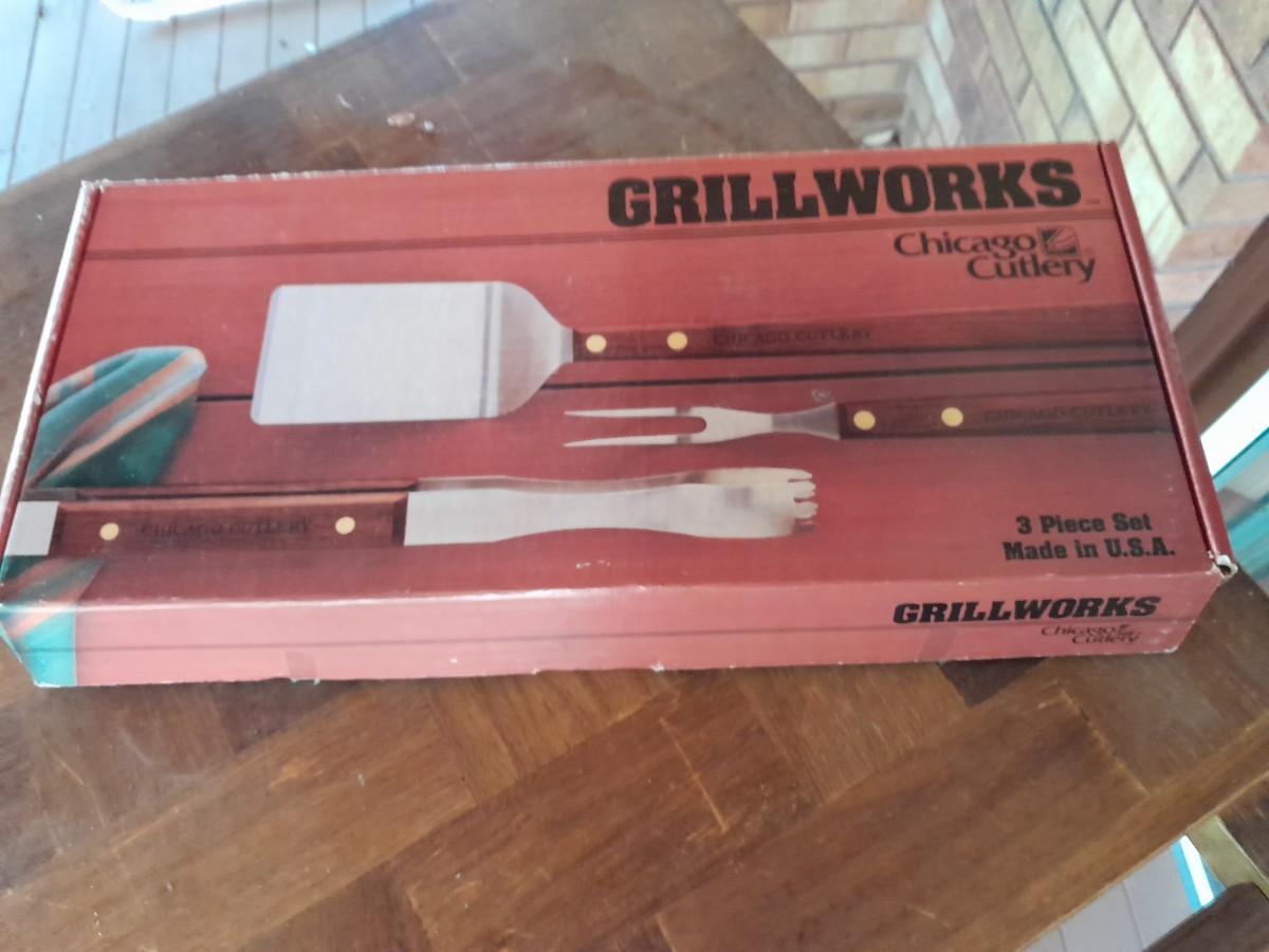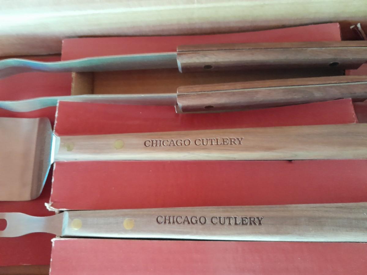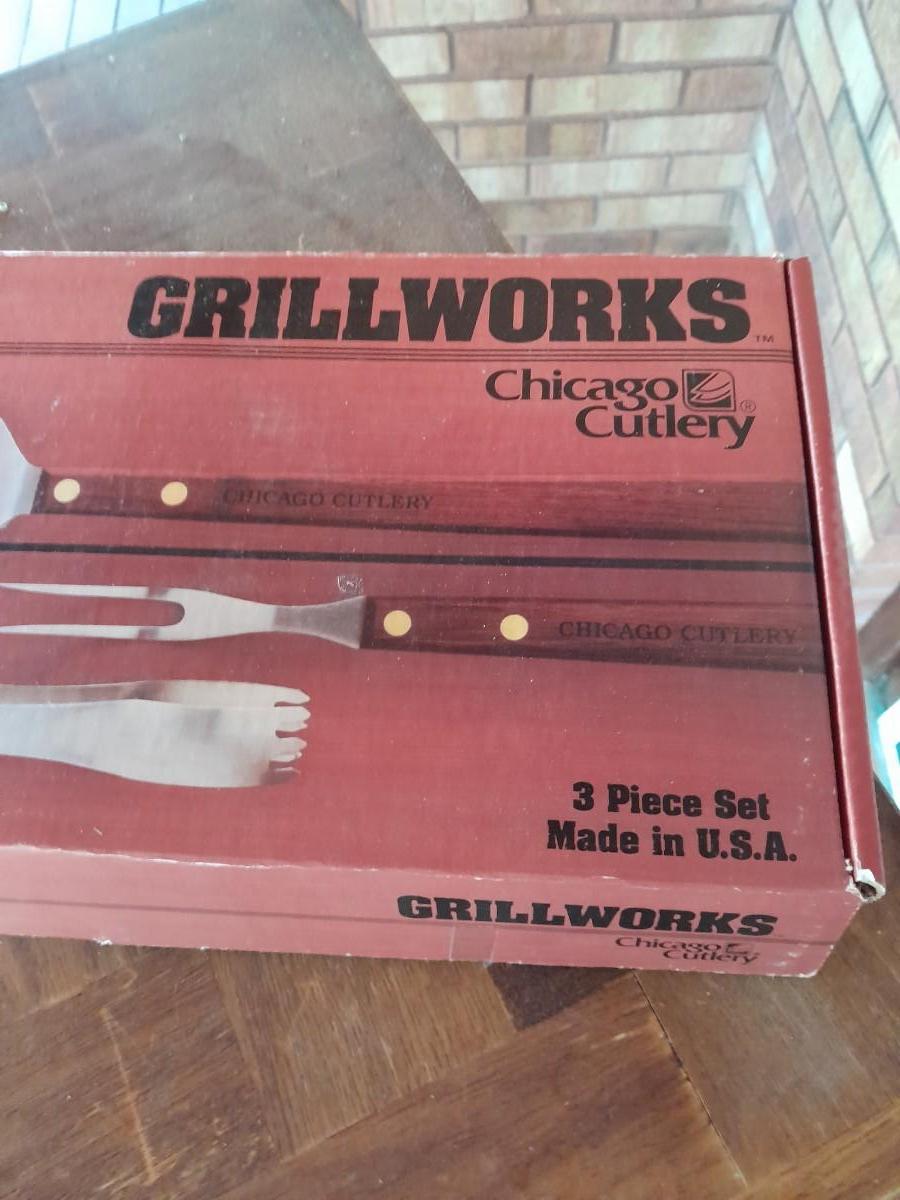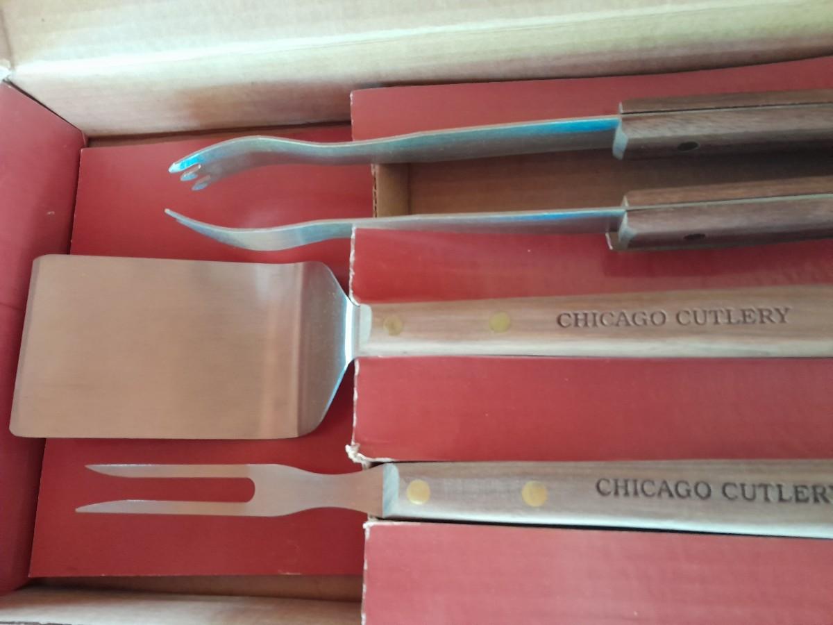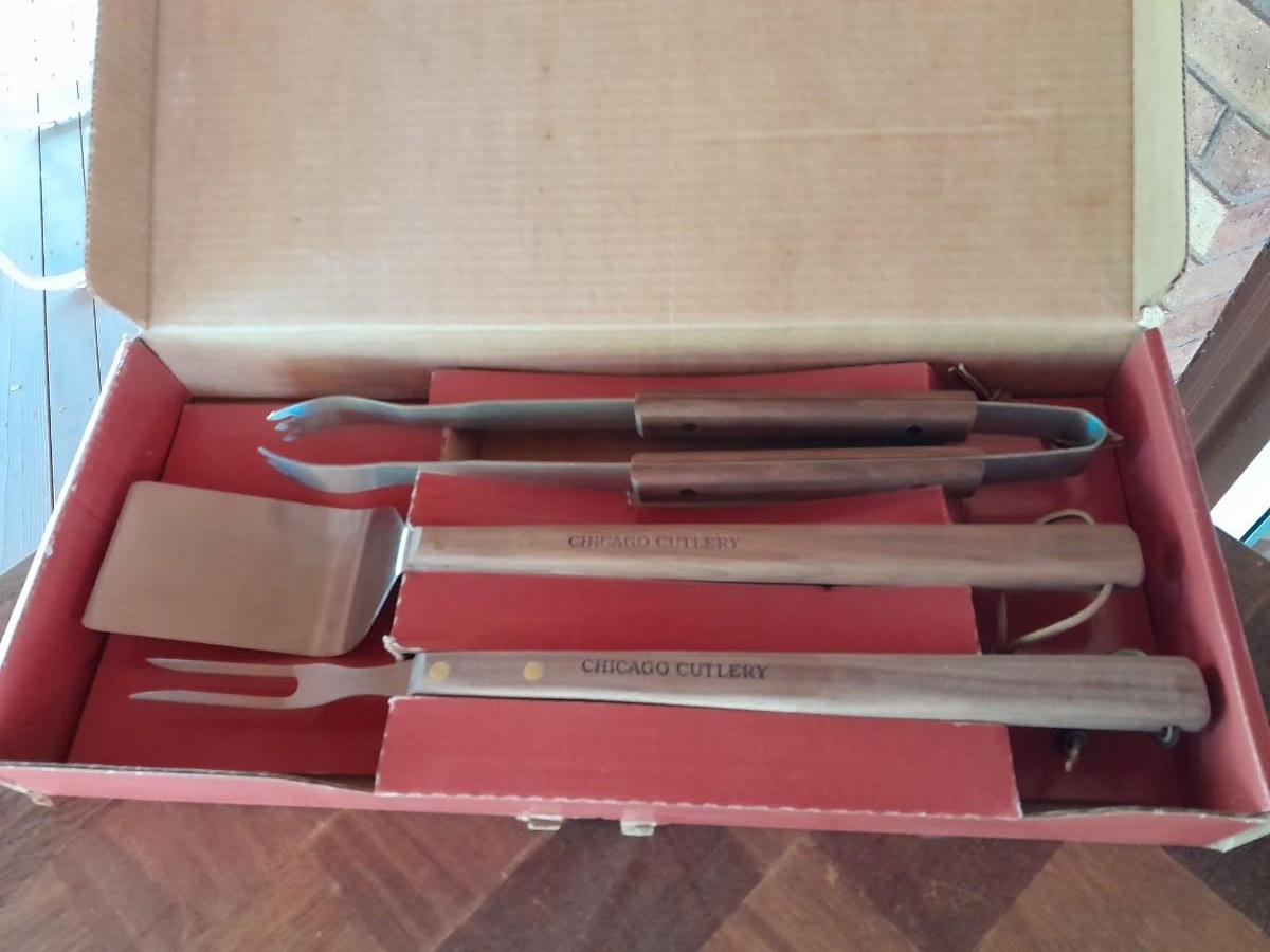 LOT 440 WHEELED KITCHEN CART WITH NEW CHICAGO CUTLERY GRILL UTENSILS