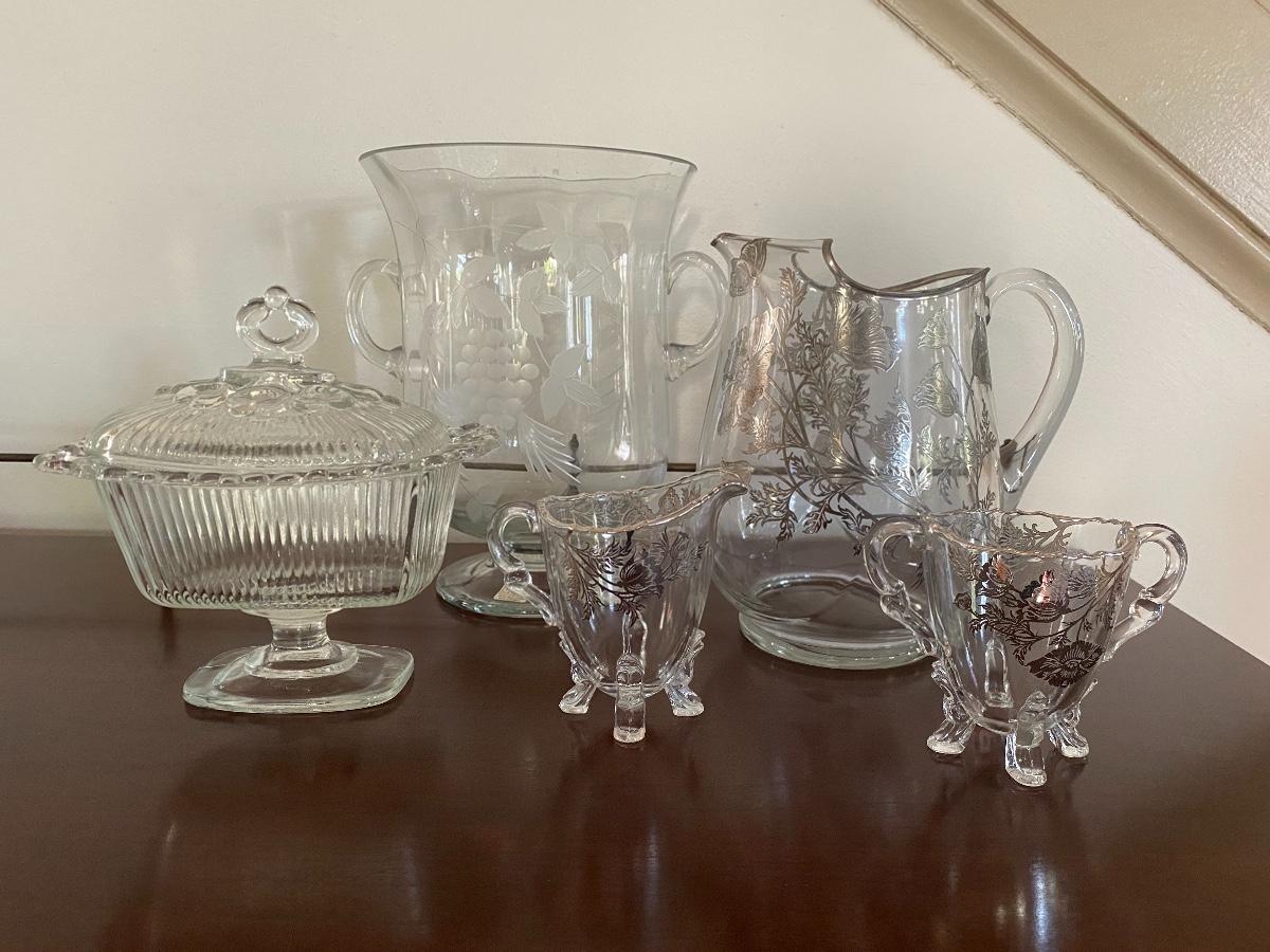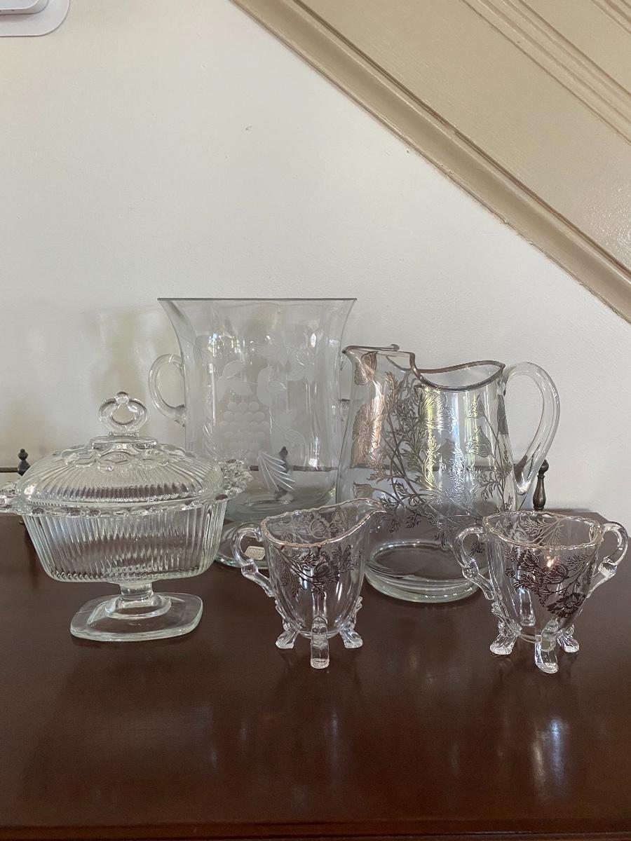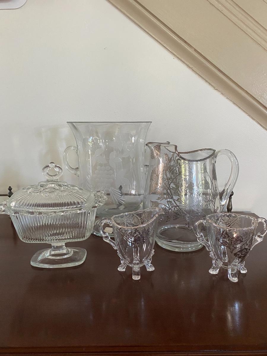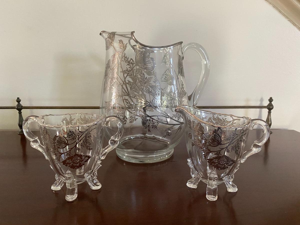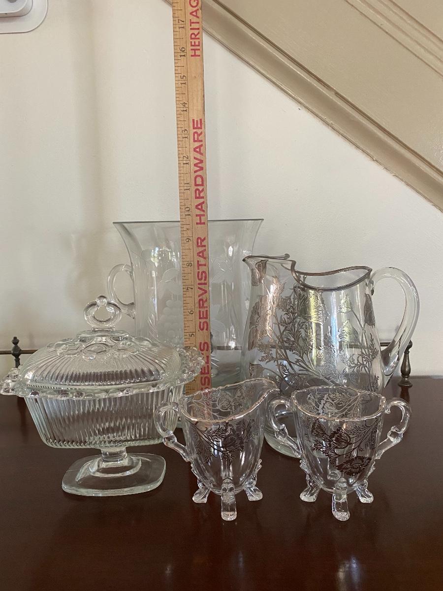 Fifth Avenue Crystal three piece set. Crystal w silver floral overlay. Glass candy dish with lid and large vase. Please see all pictures as they are the best representation of the items. The pictures show condition, measurements if taken, and what is included in the lot. Due to the large amount that we photograph and the time frame, we are not always able to take measurements. All items unless noted, are pre-owned and have been used. If you purchased furniture, you must bring help. We do not allow one person to carry large furniture out on their own. Bring help, tools and a truck for the safety of our client’s homes, and your personal safety. Company policy. Thank you.