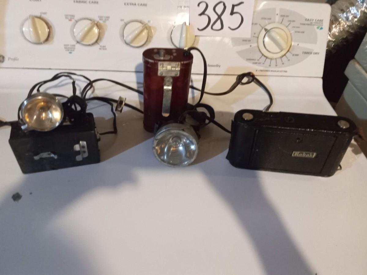 LOT 441 VINTAGE HEADLAMPS AND AN OLD KODAK CAMERA (HD)