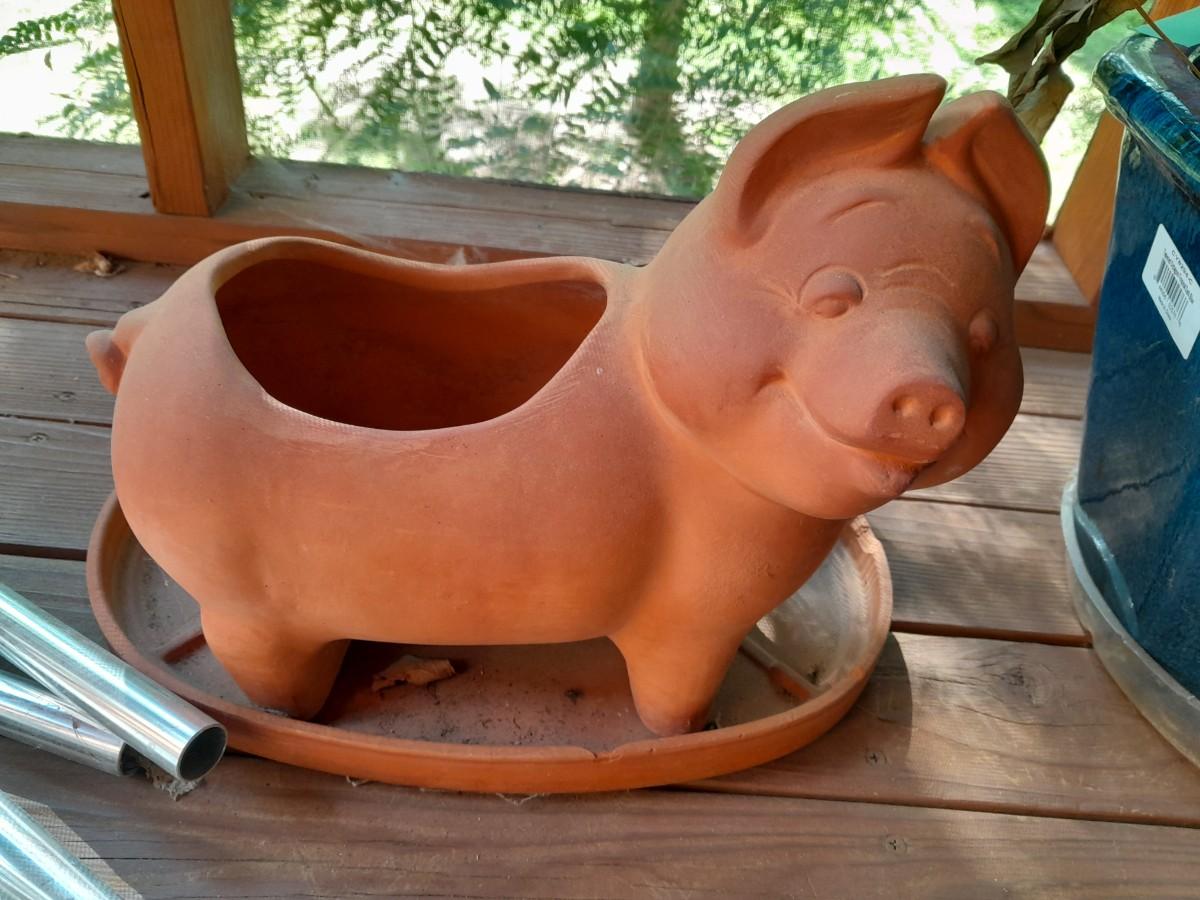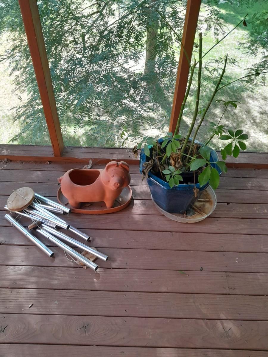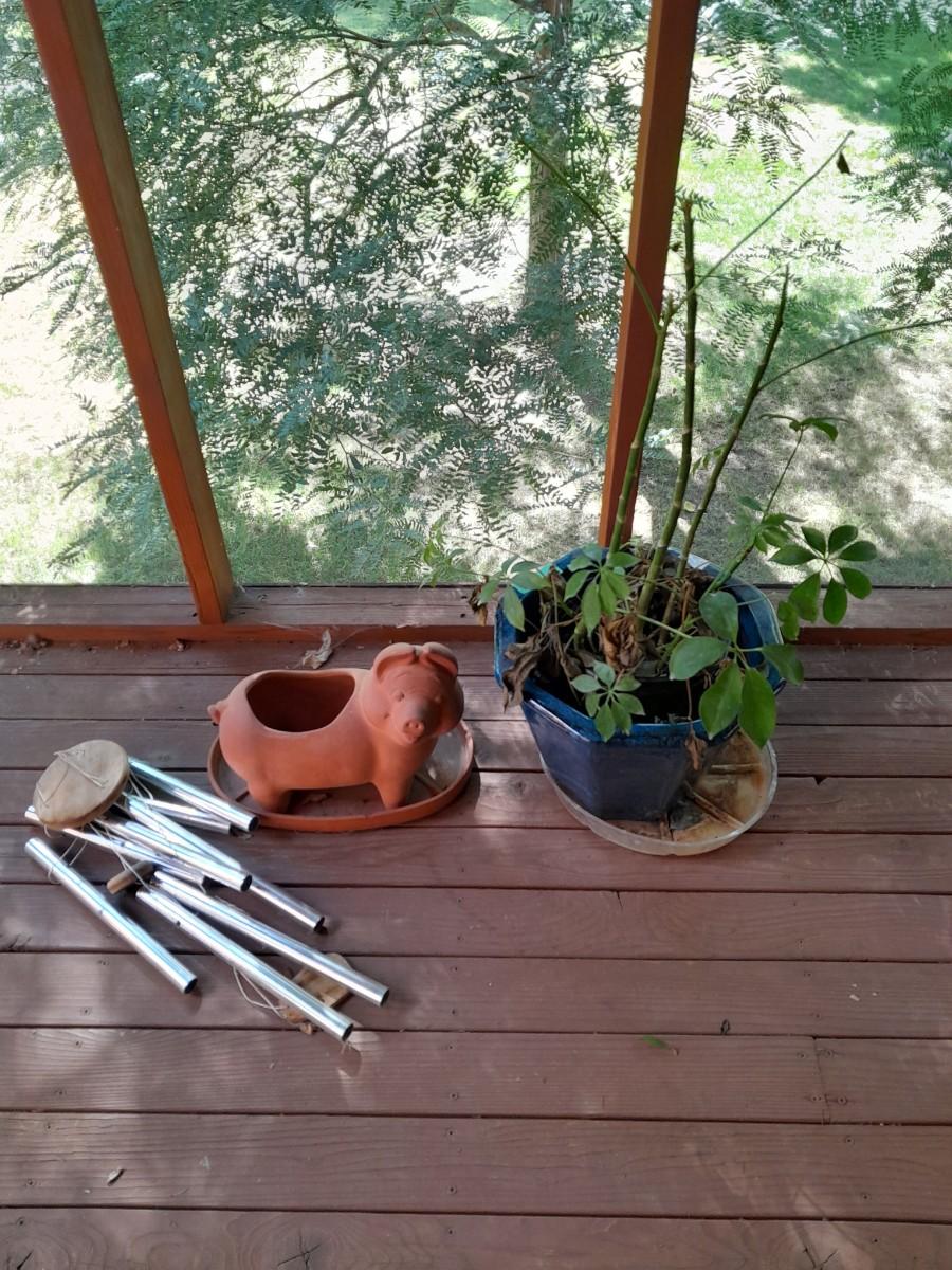 SCHEFFLERA LIVE PLANT (NEEDS SOME LOVE!) TERRA COTTA PIG POT, AND WINDCHIME