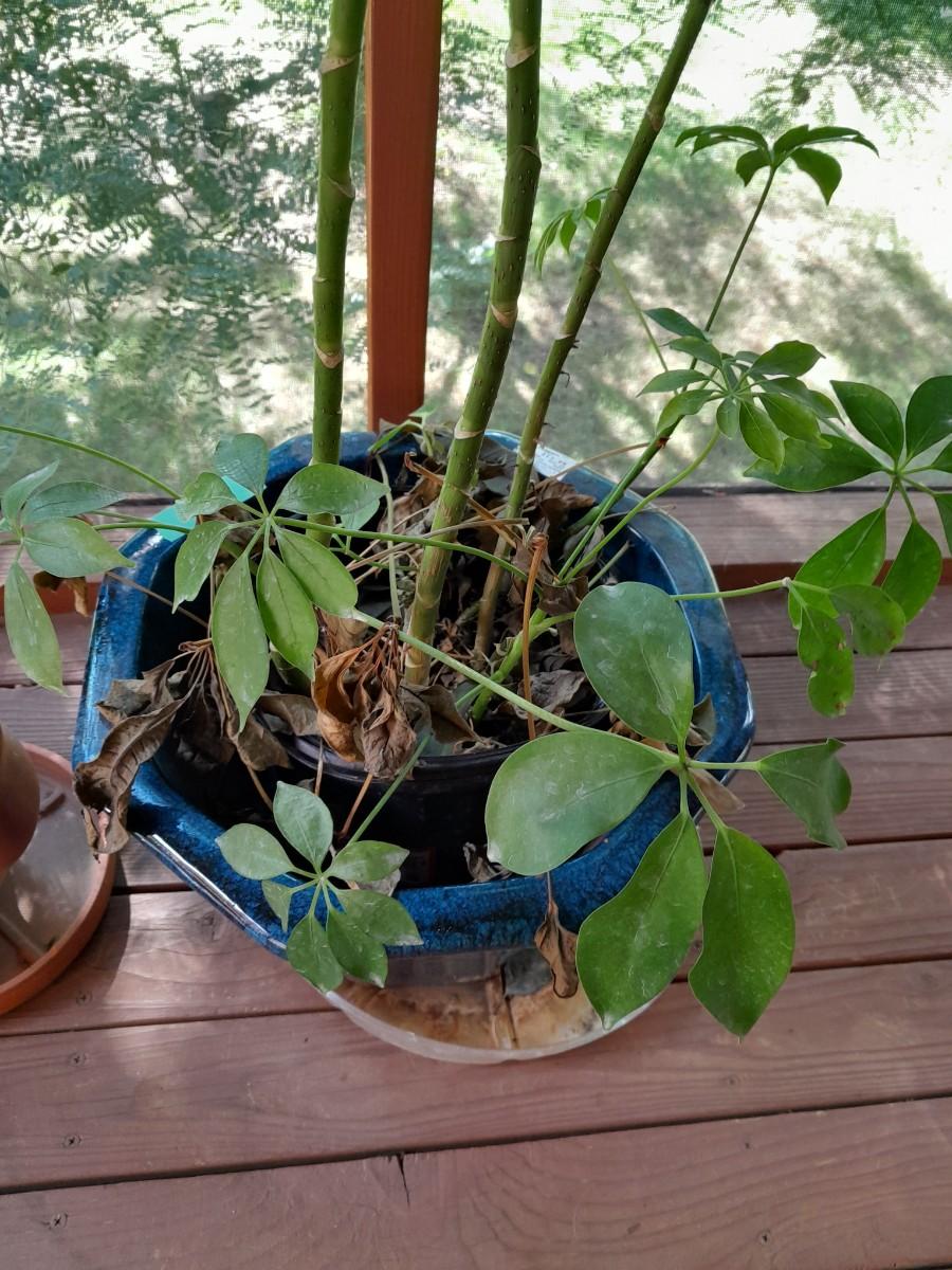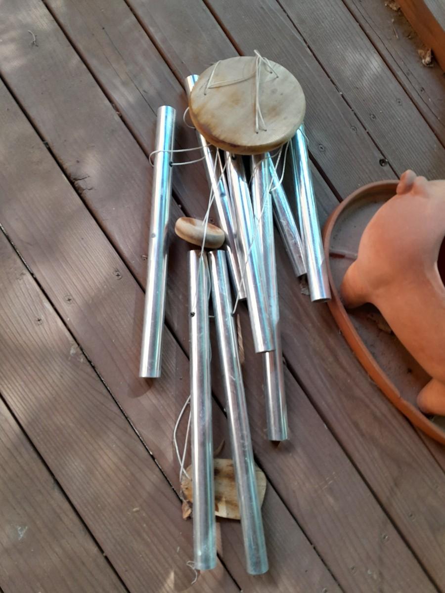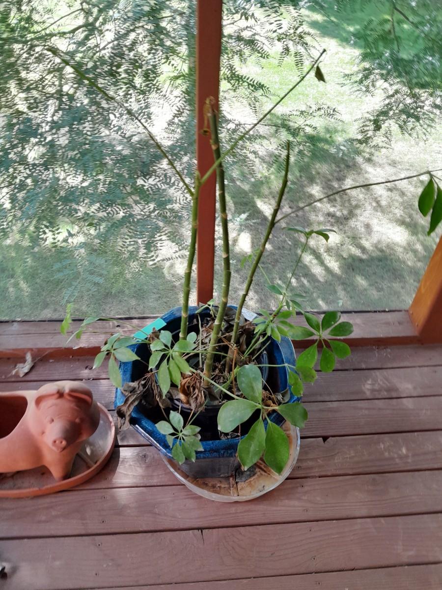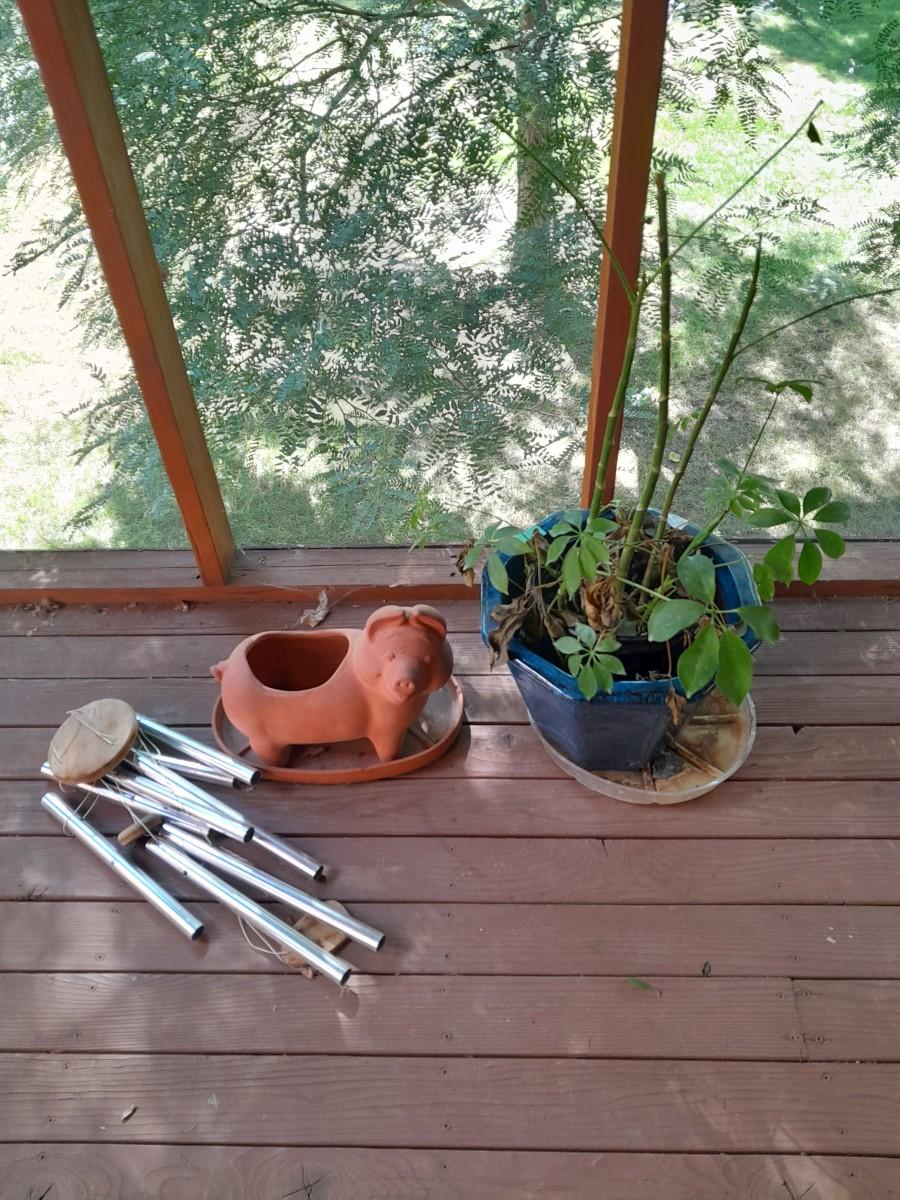 SCHEFFLERA LIVE PLANT (NEEDS SOME LOVE!) TERRA COTTA PIG POT, AND WINDCHIME