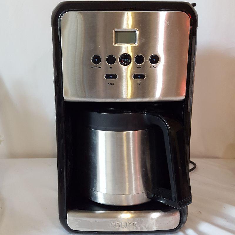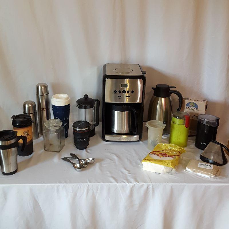 A coffee lovers dream! Everything you need for a coffee bar! A Krups coffee maker, filters of all kinds, Cresimo carafe, travel mugs, including one that looks like a camera lens! Local pick up only.