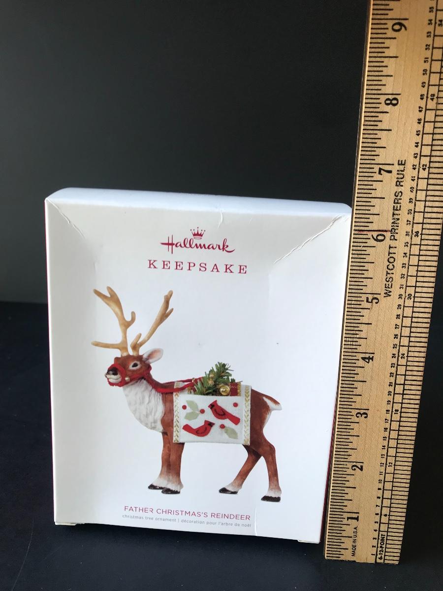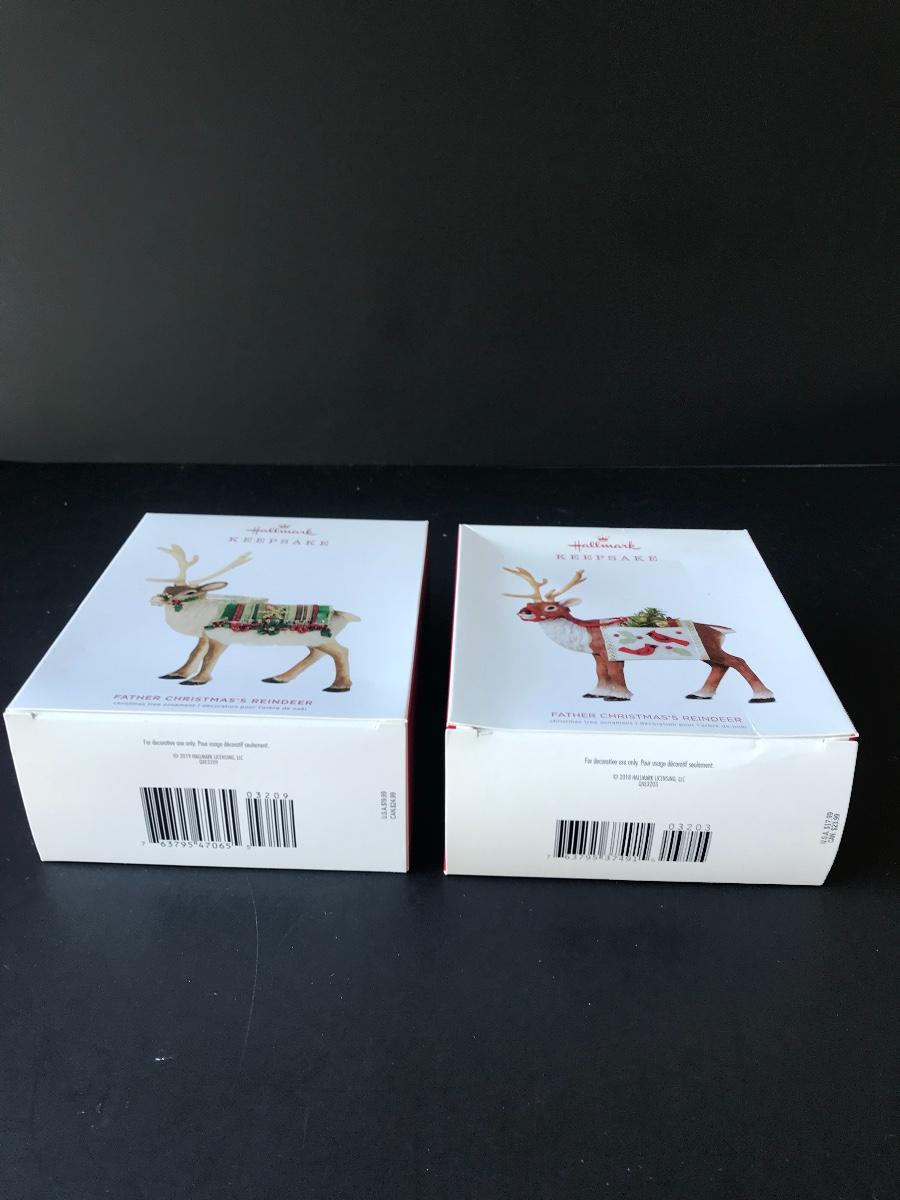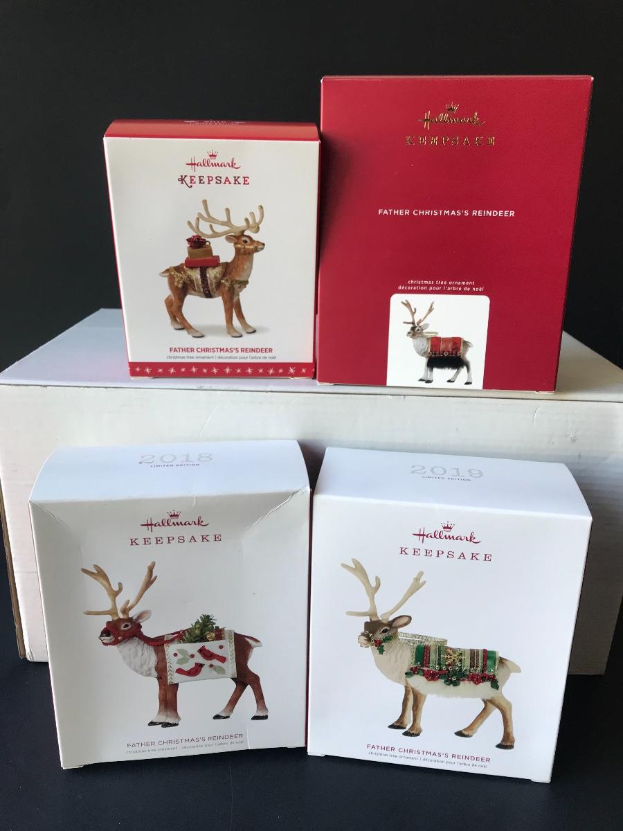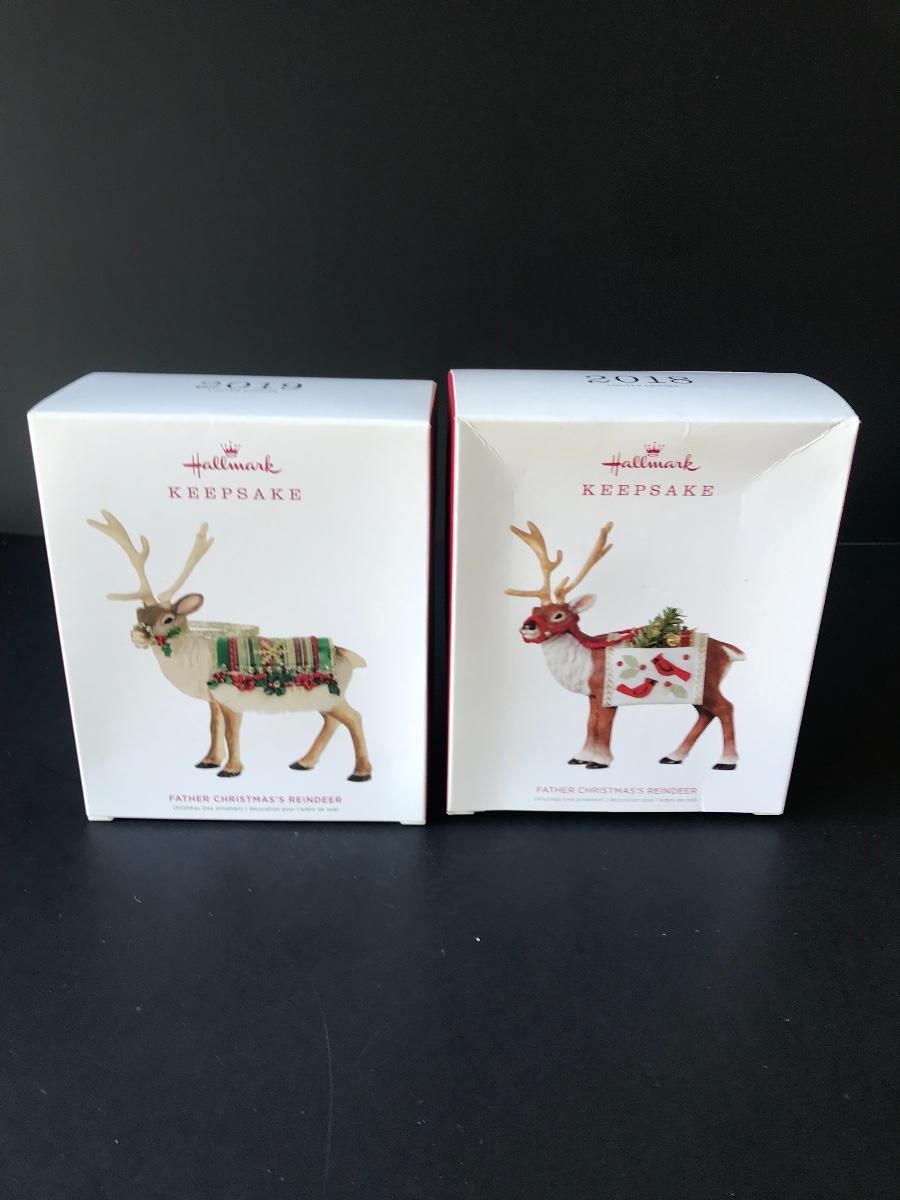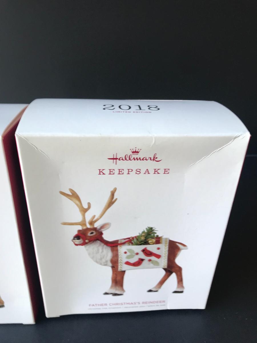 Father Christmas's Reindeer Hallmark Keepsake Ornaments. All Holiday items in this auction are as-seen. The client collected a lot of holiday pieces and some are new in box, some were displayed once and come with original box, and some have been displayed and come with no box. They are all pre-owned in some fashion and have been stored in an attic or on shelf in library. Please see all pictures. The pictures show condition, measurements if taken, and what is included in the lot. Due to the large amount that we photograph and the time frame, we are not always able to take measurements. All items unless noted, are pre-owned and have been used. Thank you