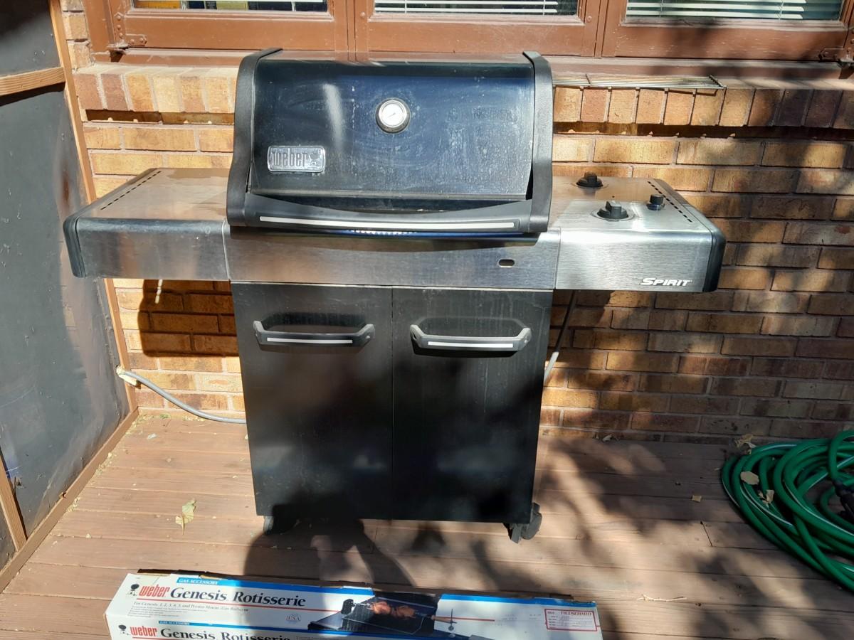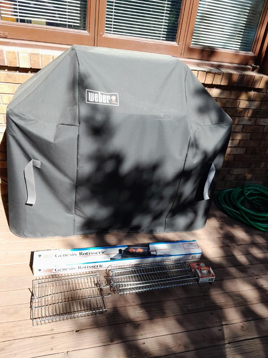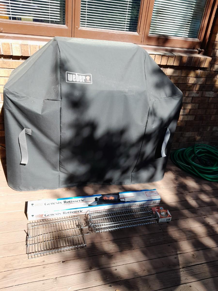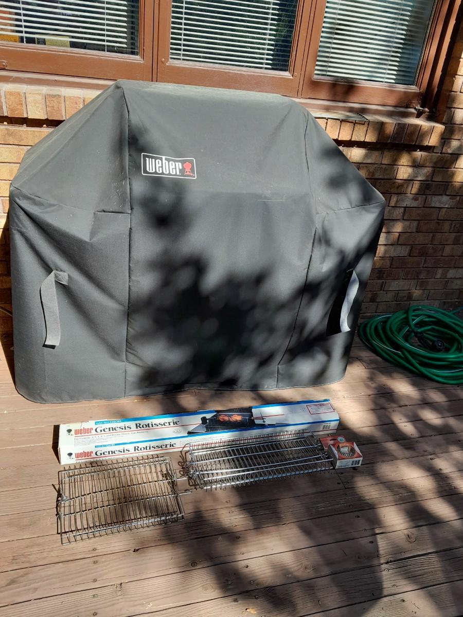 WEBER NATURAL GAS BBQ GRILL WITH GENESIS ROTISSERIE, COVER, AND MORE (this grill will need to be disconnected from the gas line)