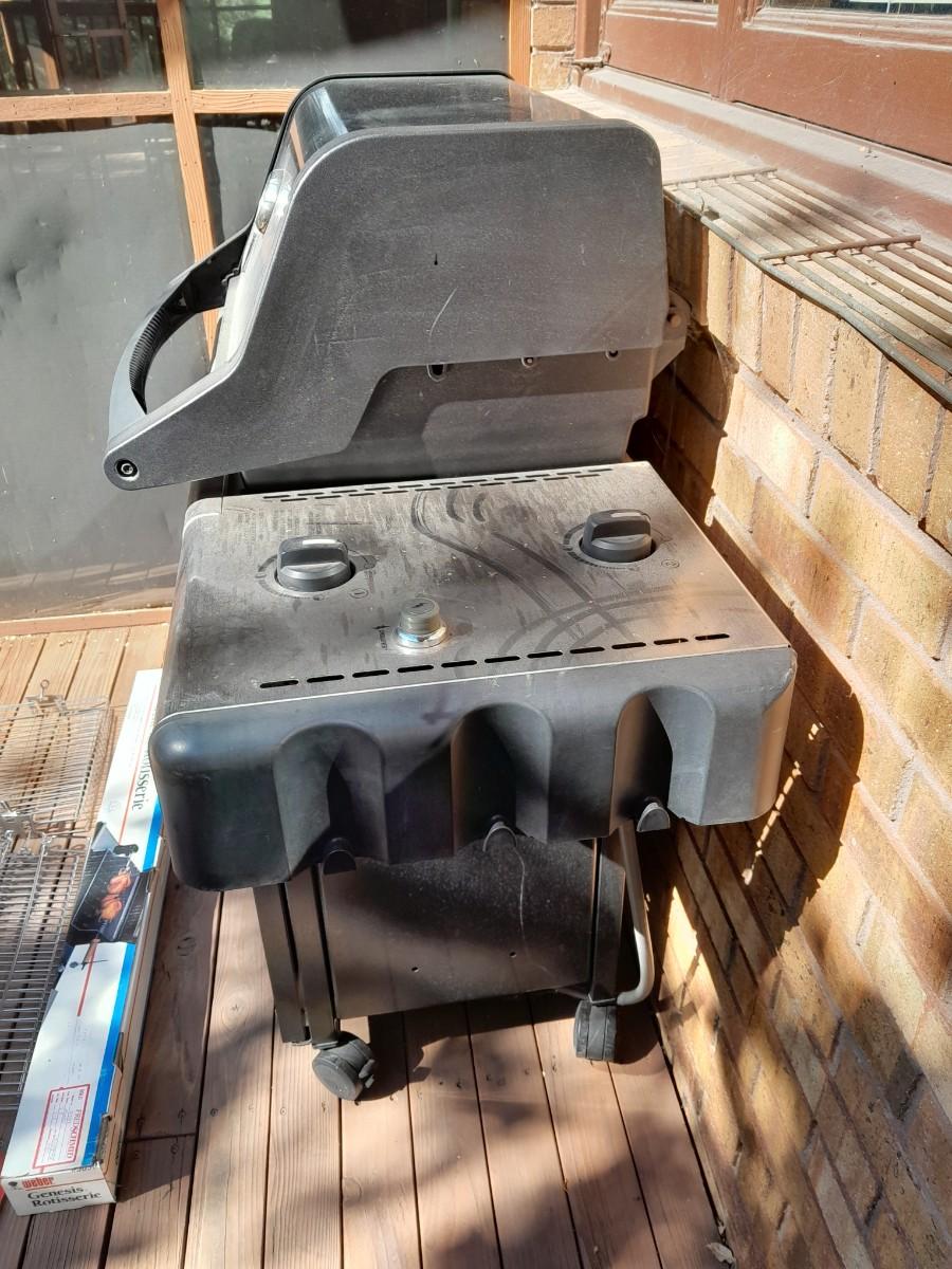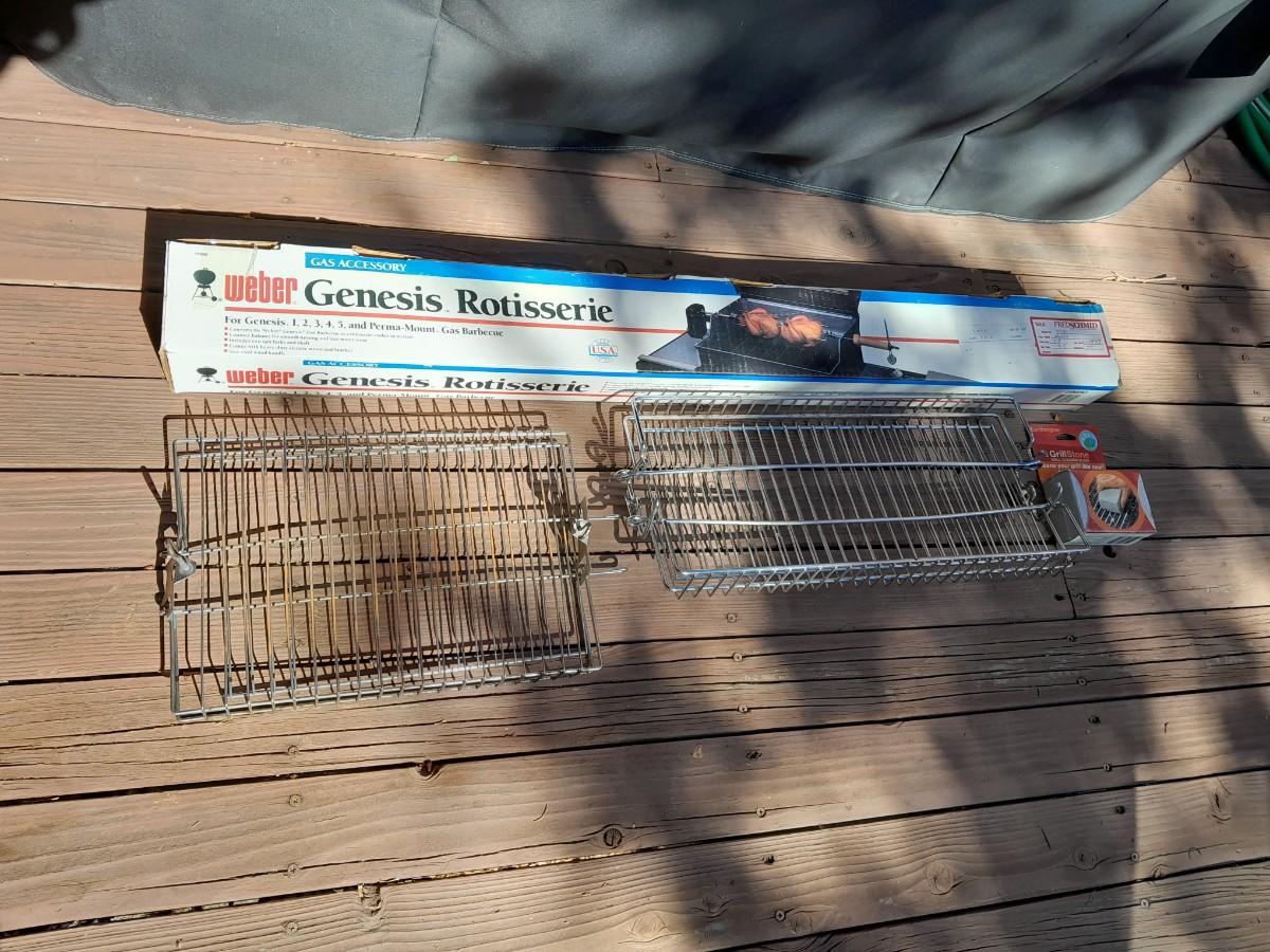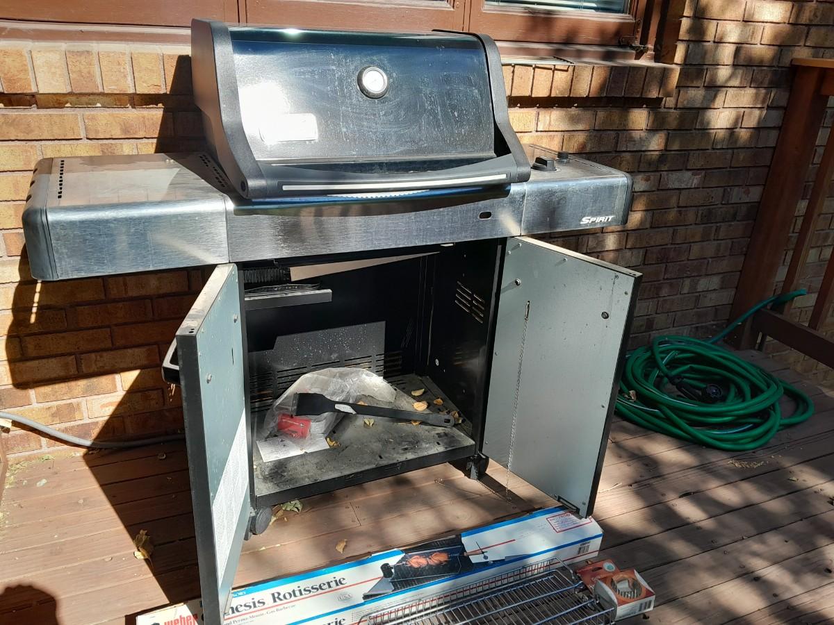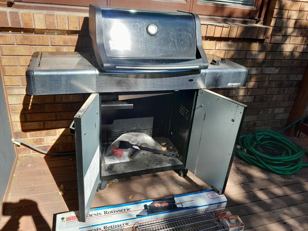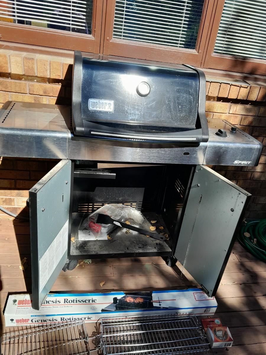 WEBER NATURAL GAS BBQ GRILL WITH GENESIS ROTISSERIE, COVER, AND MORE (this grill will need to be disconnected from the gas line)