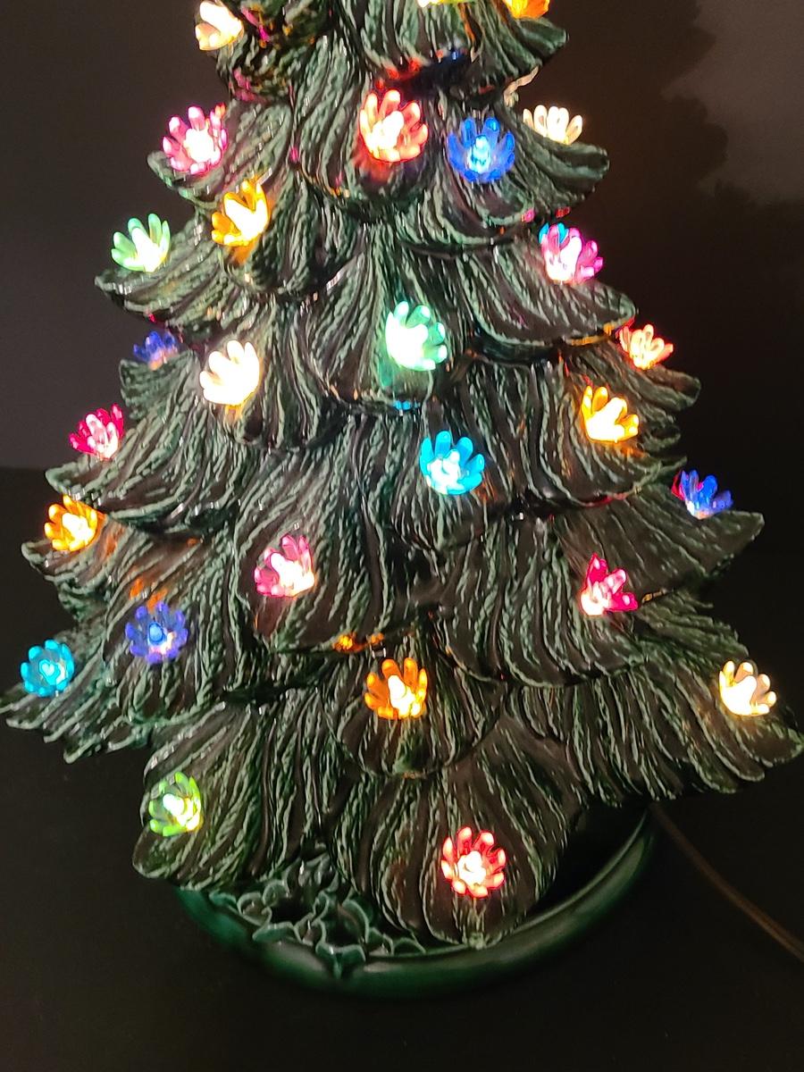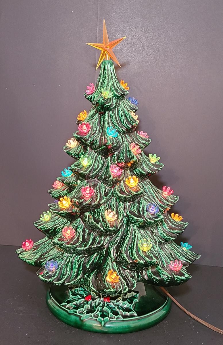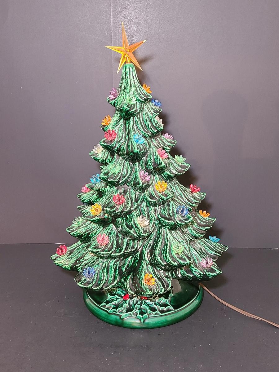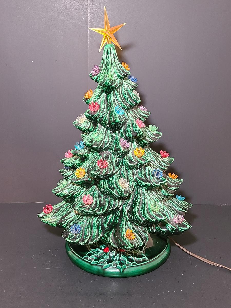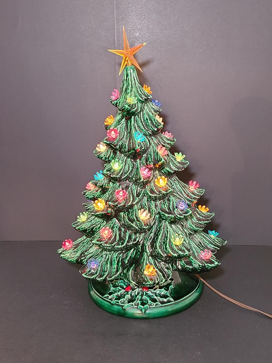 Fun, vintage ceramic tree with lights on base. This is pre-owned with no noticed flaws. Pictures taken from every angle!! The pictures show condition, measurements if taken, and what is included in the lot. Due to the large amount that we photograph and the time frame, we are not always able to take measurements. All items unless noted, are pre-owned and have been used. If you purchased furniture, you must bring help. We do not allow one person to carry large furniture out on their own. Bring help, tools and a truck for the safety of our client’s homes, and your personal safety. Company policy. Thank you.
