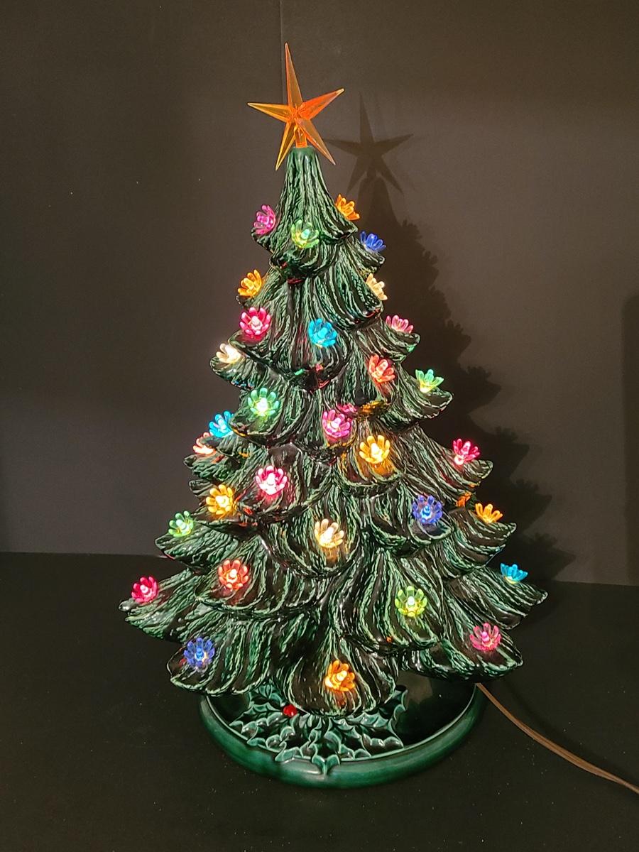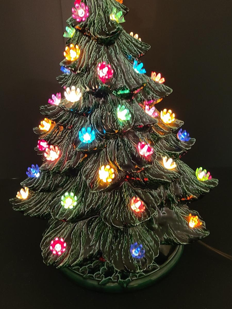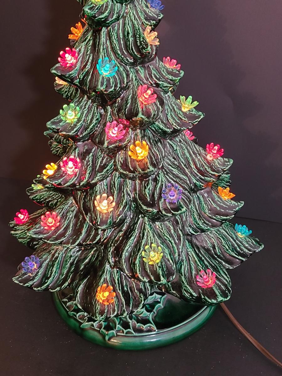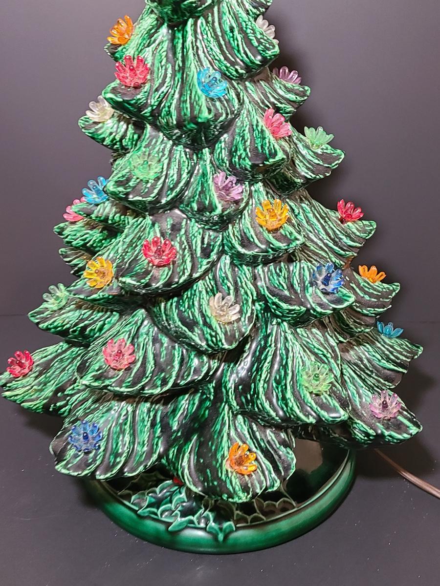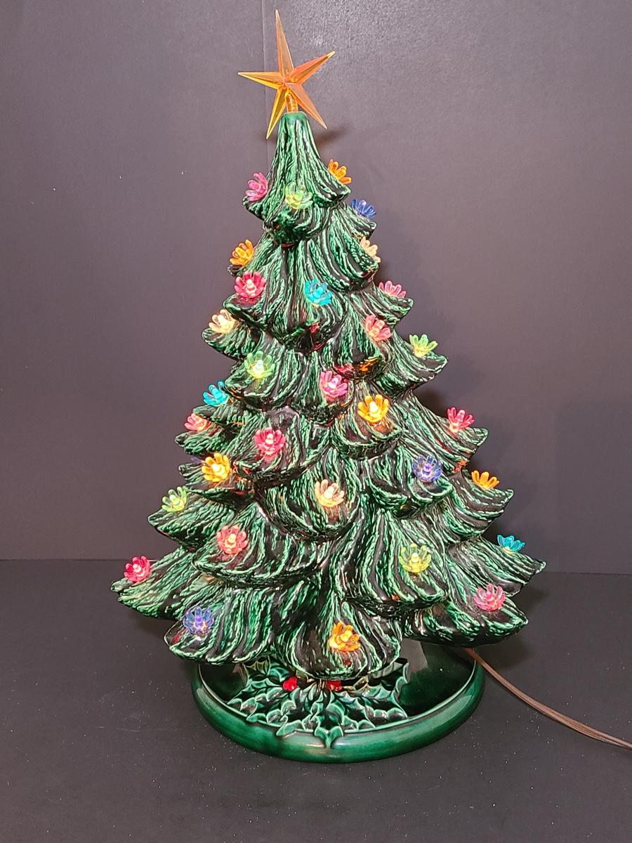 Fun, vintage ceramic tree with lights on base. This is pre-owned with no noticed flaws. Pictures taken from every angle!! The pictures show condition, measurements if taken, and what is included in the lot. Due to the large amount that we photograph and the time frame, we are not always able to take measurements. All items unless noted, are pre-owned and have been used. If you purchased furniture, you must bring help. We do not allow one person to carry large furniture out on their own. Bring help, tools and a truck for the safety of our client’s homes, and your personal safety. Company policy. Thank you.