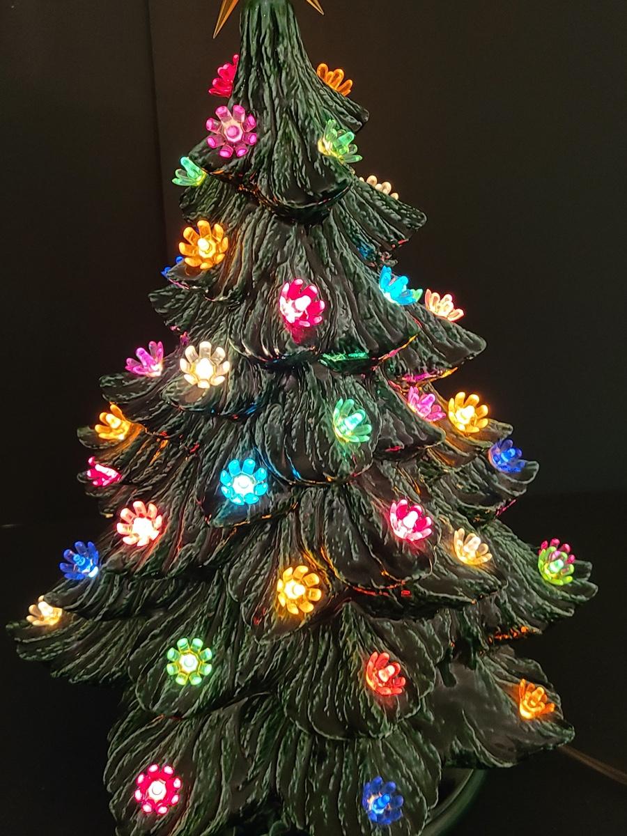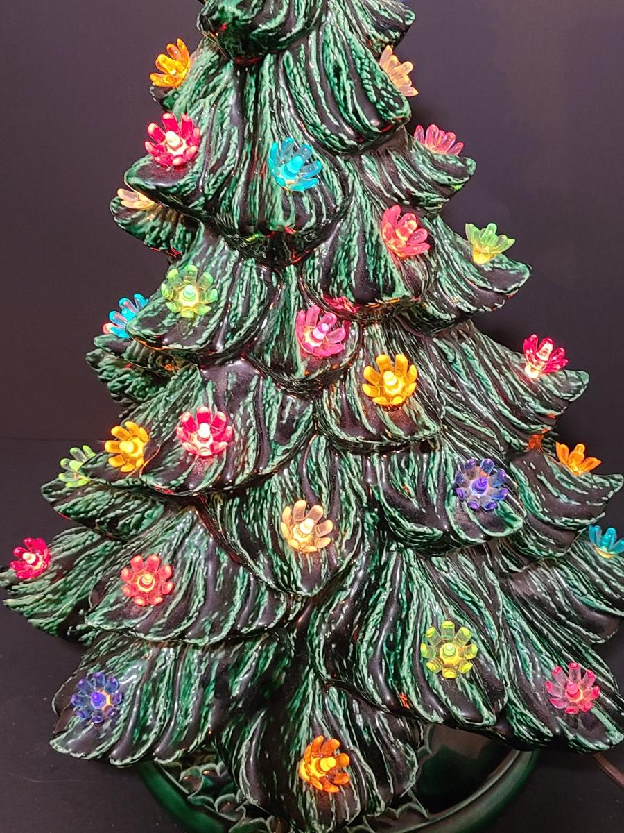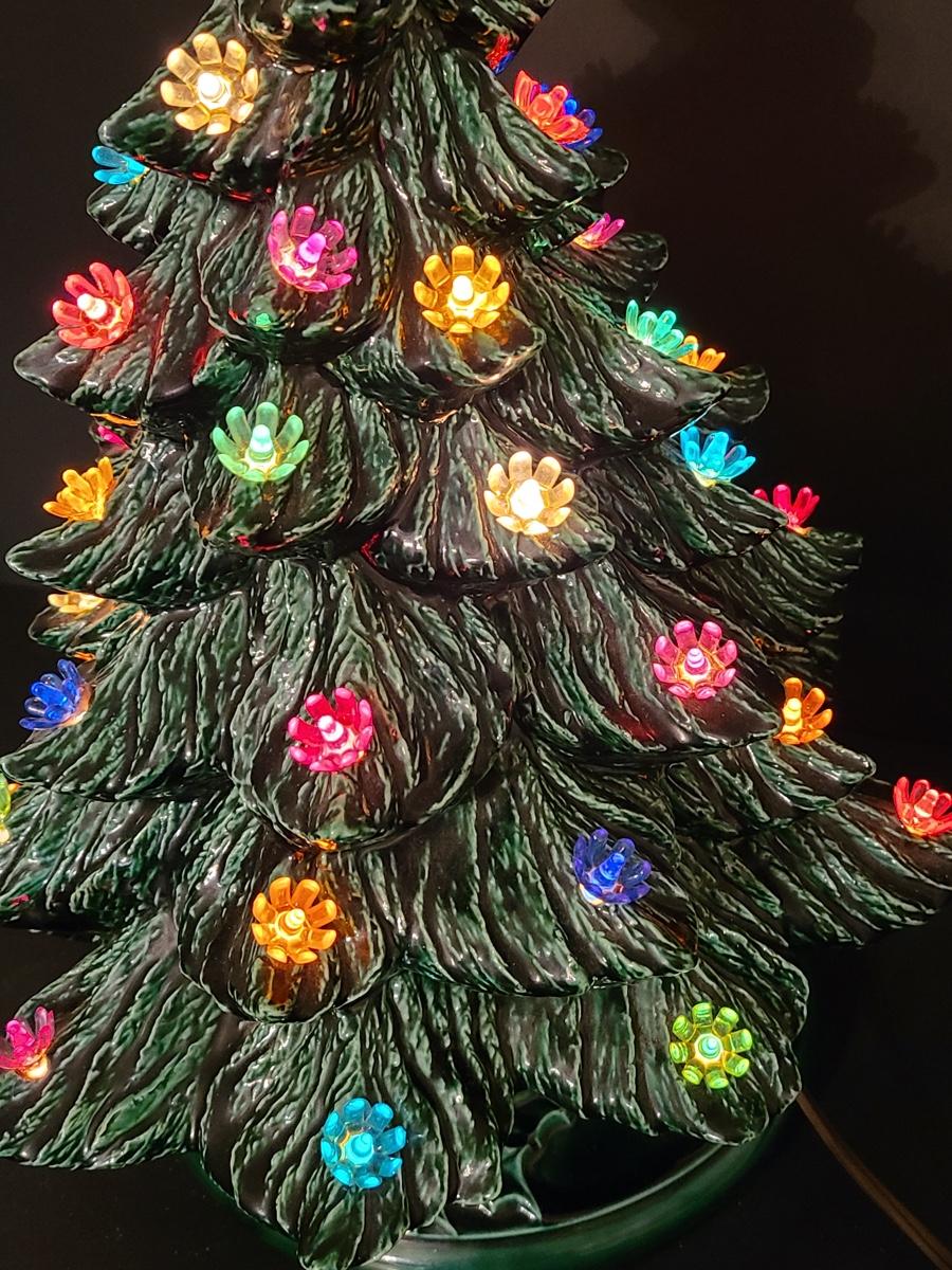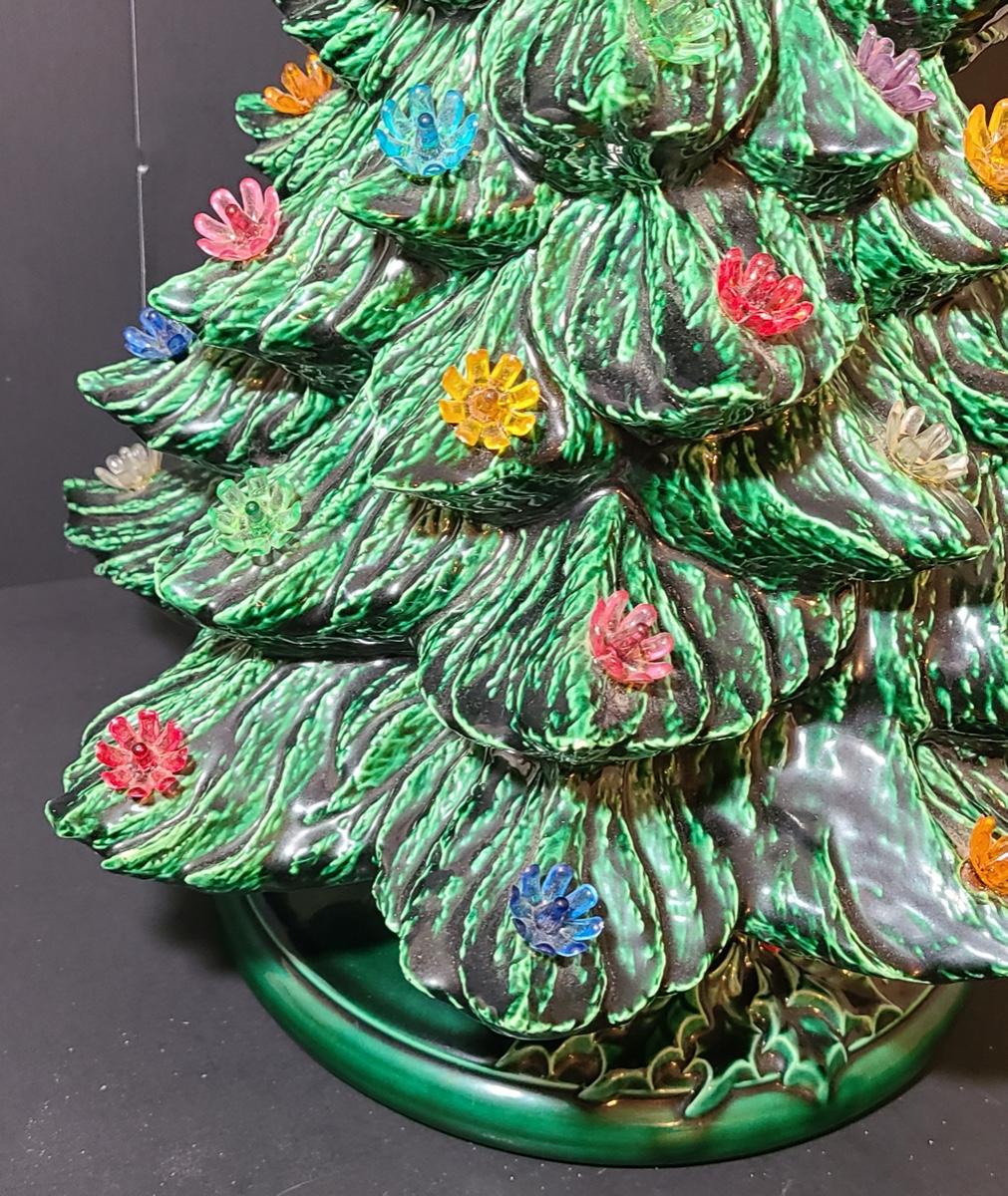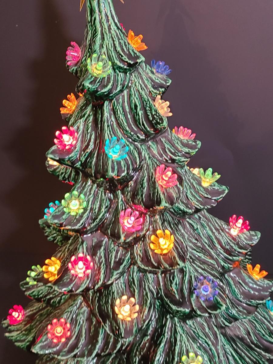 Fun, vintage ceramic tree with lights on base. This is pre-owned with no noticed flaws. Pictures taken from every angle!! The pictures show condition, measurements if taken, and what is included in the lot. Due to the large amount that we photograph and the time frame, we are not always able to take measurements. All items unless noted, are pre-owned and have been used. If you purchased furniture, you must bring help. We do not allow one person to carry large furniture out on their own. Bring help, tools and a truck for the safety of our client’s homes, and your personal safety. Company policy. Thank you.