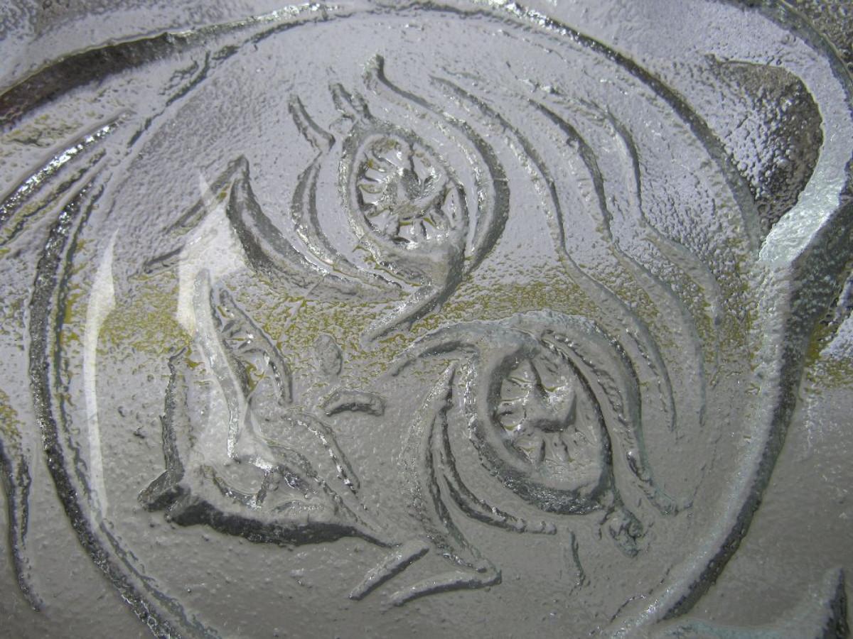 Has a mold flaw as seen in magnified photo. So large you can use as a candy dish or veggie/snack tray, or just about anything! Very heavy glass.
