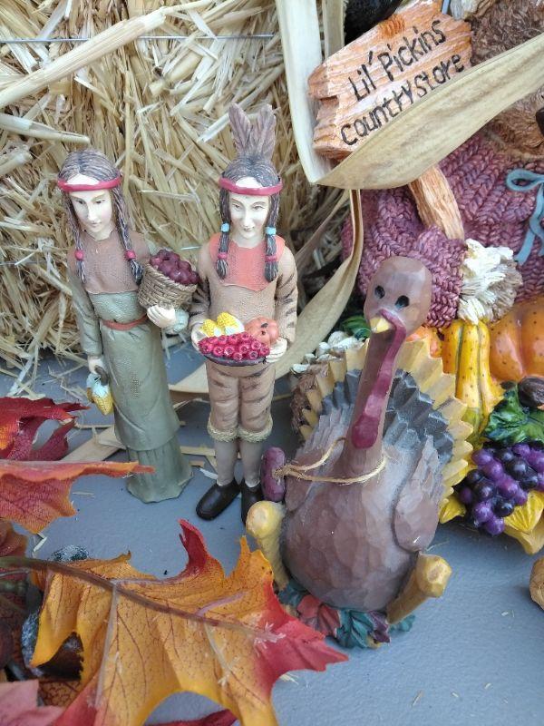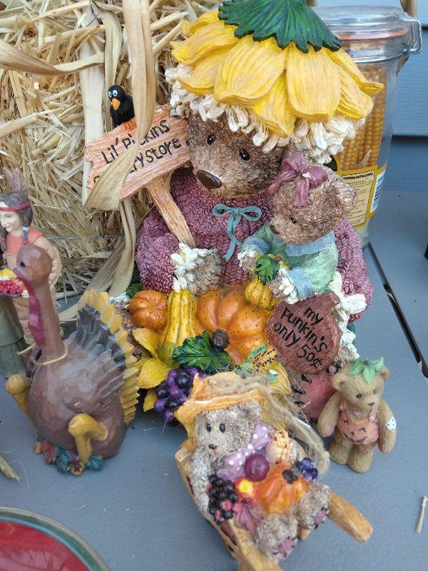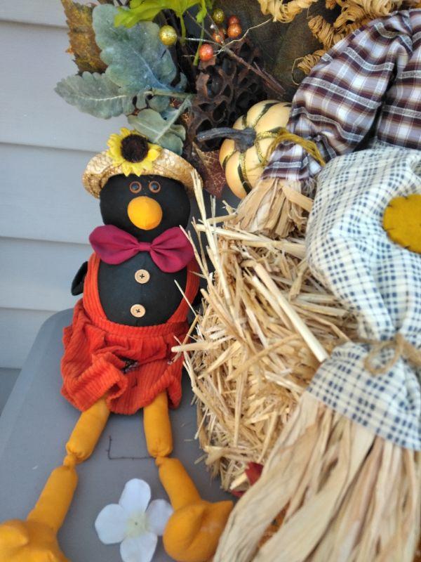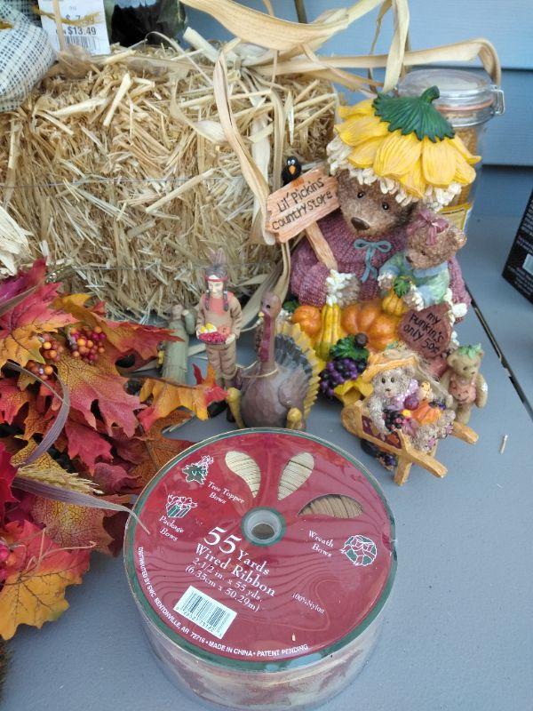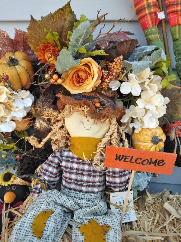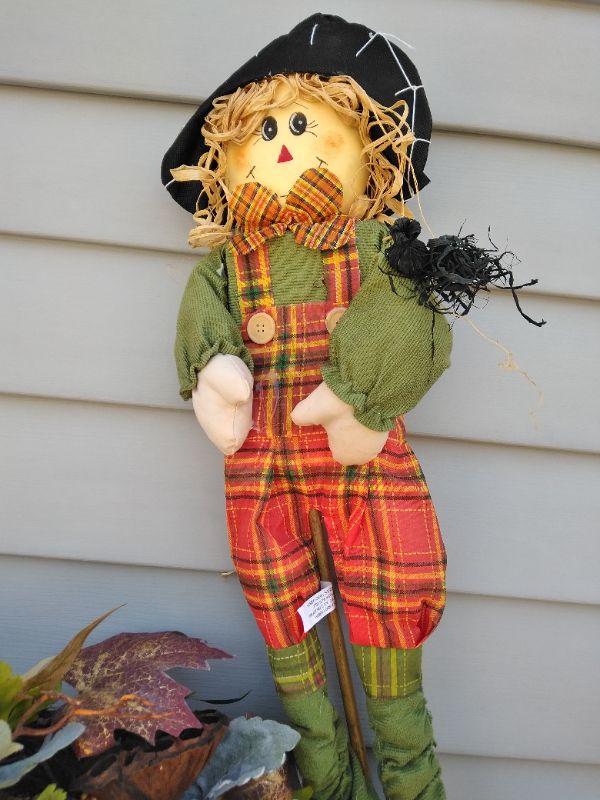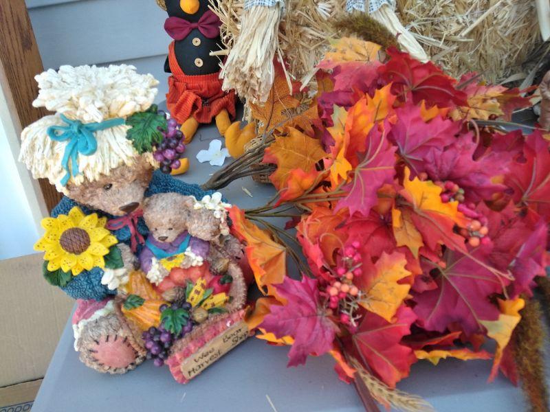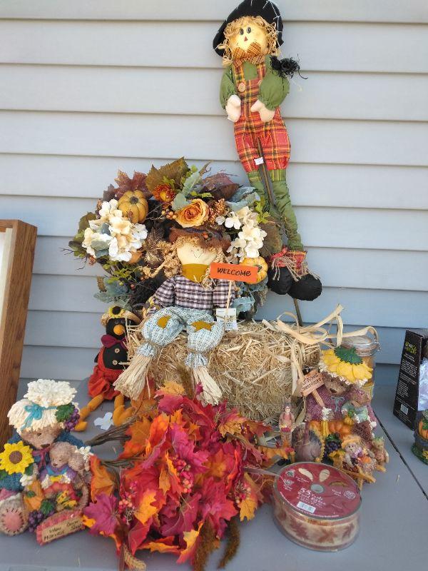FALL DECORATIONS, SMALL STRAW BALE, SCARE CROWS, FAUX FALL LEAVES, AND MORE