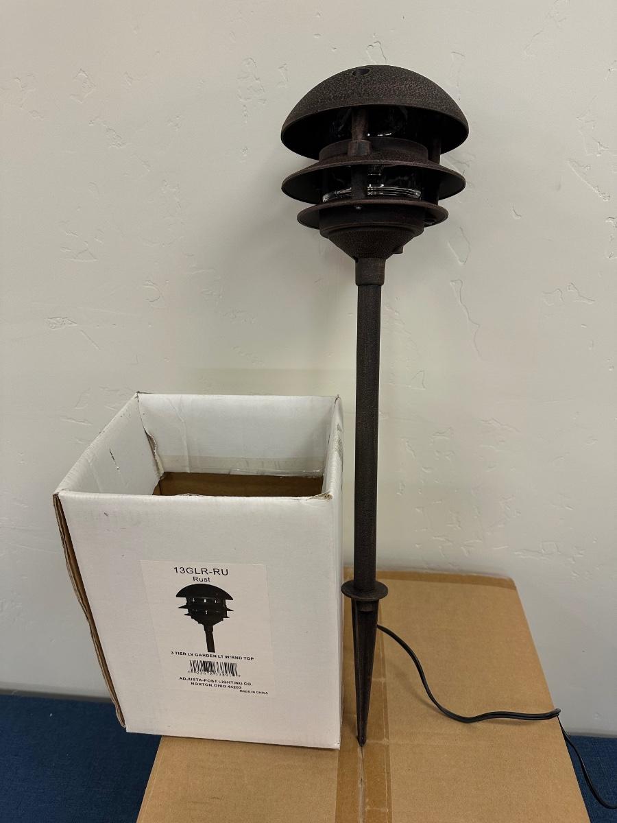 BOX OF FOUR 3 TIER, RUST COLOR LOW VOLTAGE METAL ROUND TOP GARDEN LIGHTS BY ADJUSTA-POST LIGHTING CO. MODEL 13GLR-RU