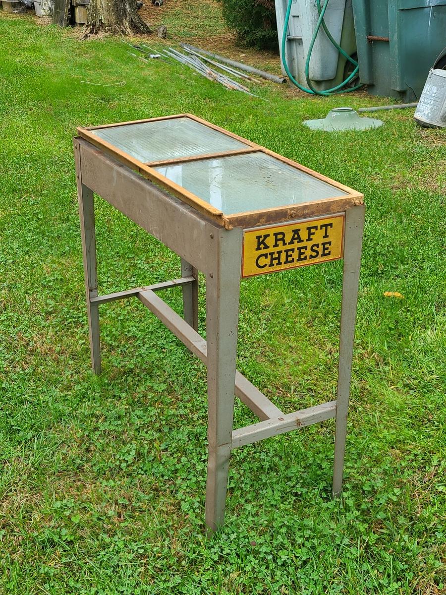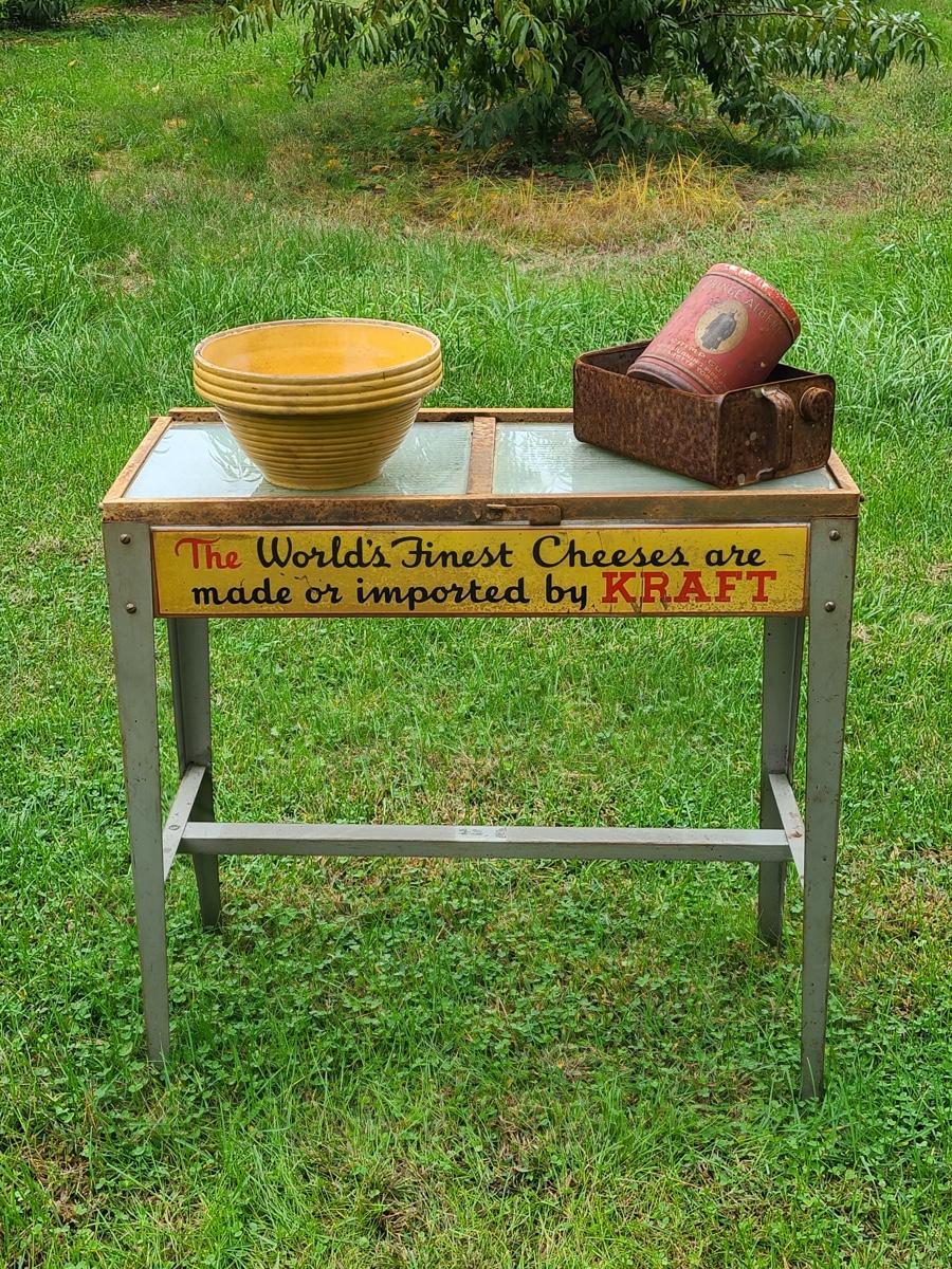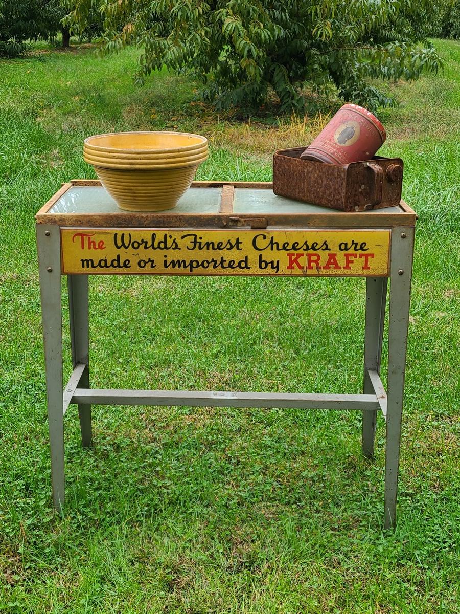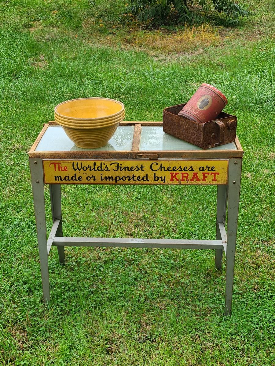 This is barn yard finds fun! The metal stand has Kraft Cheese advertising on it, and the top is an old window that just has been set on top to use in yard. The pottery mixing bowl needs to be cleaned and does have a chip. There is an old gas can cut in half that would look amazing with some chippy paint and used as planter. Fun lot for the imagination! The pictures show condition, measurements if taken, and what is included in the lot. Due to the large amount that we photograph and the time frame, we are not always able to take measurements. All items unless noted, are pre-owned and have been used. If you purchased furniture, you must bring help. We do not allow one person to carry large furniture out on their own. Bring help, tools and a truck for the safety of our client’s homes, and your personal safety. Company policy. Thank you.