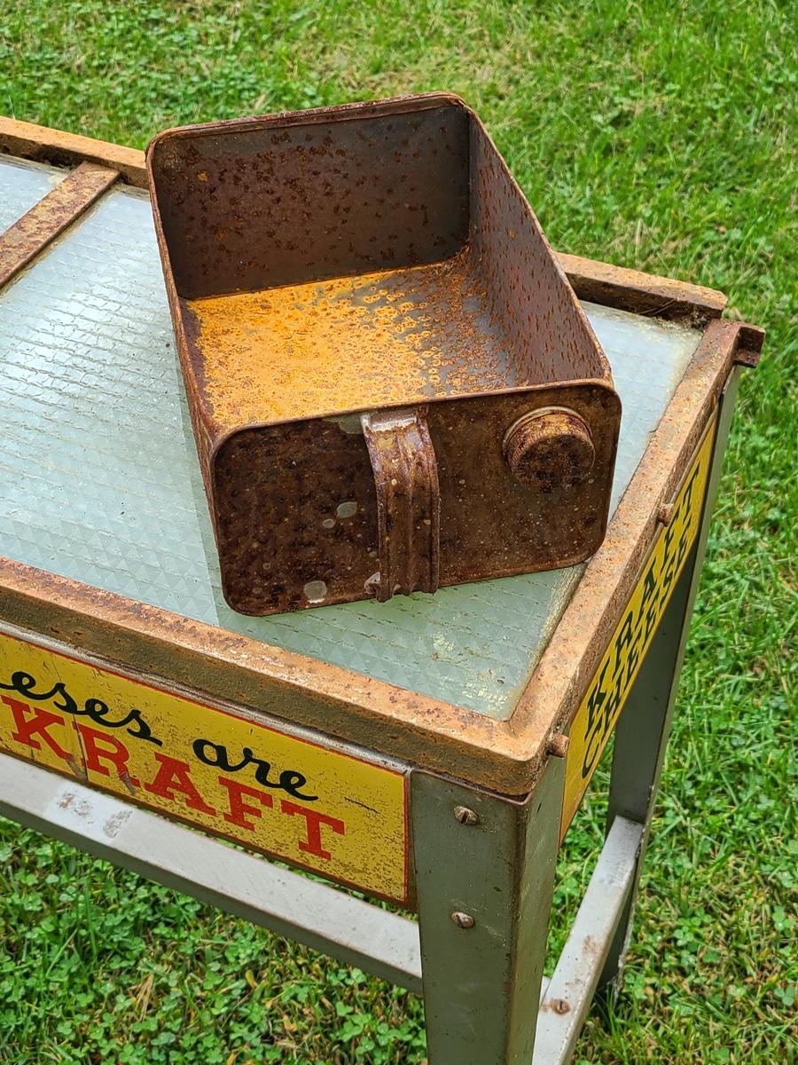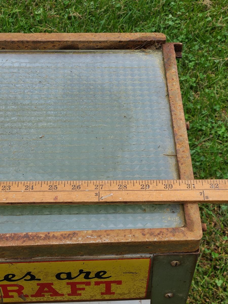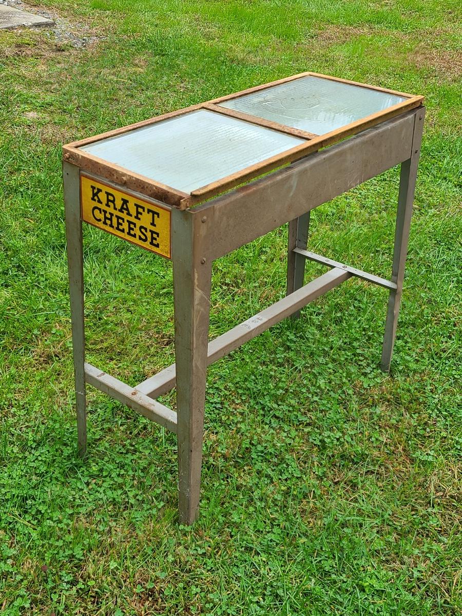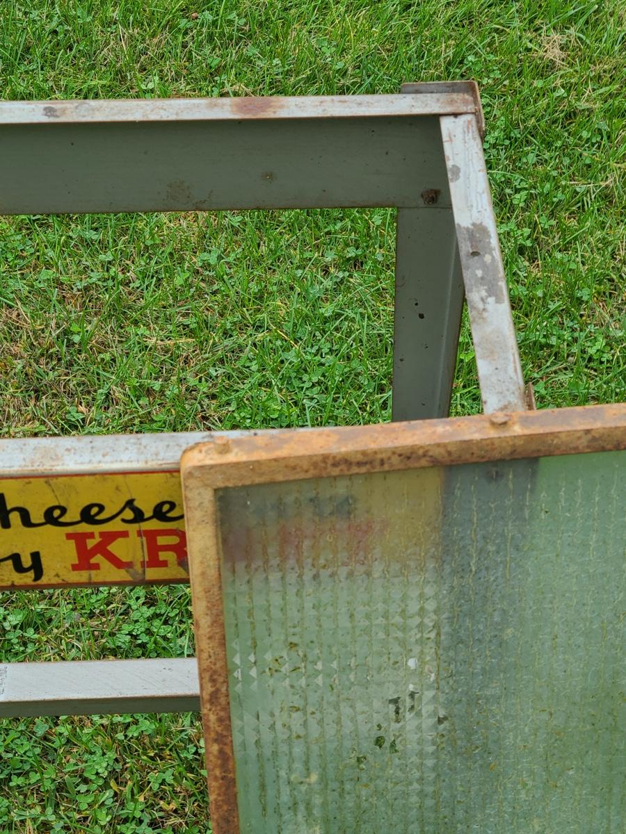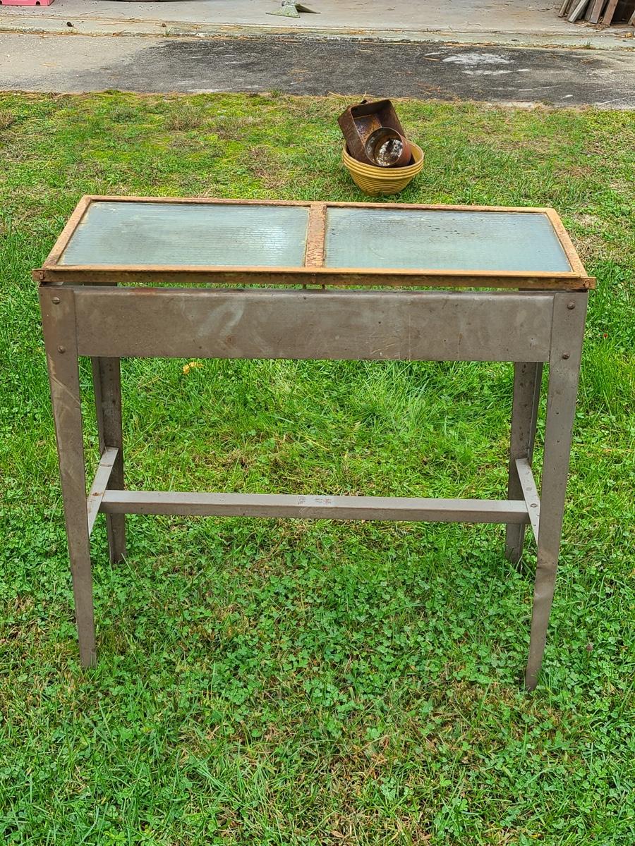 This is barn yard finds fun! The metal stand has Kraft Cheese advertising on it, and the top is an old window that just has been set on top to use in yard. The pottery mixing bowl needs to be cleaned and does have a chip. There is an old gas can cut in half that would look amazing with some chippy paint and used as planter. Fun lot for the imagination! The pictures show condition, measurements if taken, and what is included in the lot. Due to the large amount that we photograph and the time frame, we are not always able to take measurements. All items unless noted, are pre-owned and have been used. If you purchased furniture, you must bring help. We do not allow one person to carry large furniture out on their own. Bring help, tools and a truck for the safety of our client’s homes, and your personal safety. Company policy. Thank you.