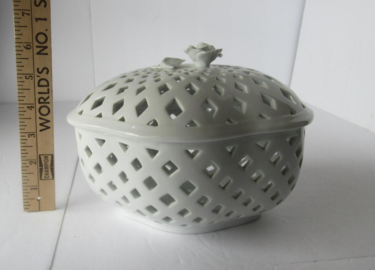 Lot 444: Vintage Lefton 60th Anniversary Event Piece, Legacy White Pierced Covered Bowl