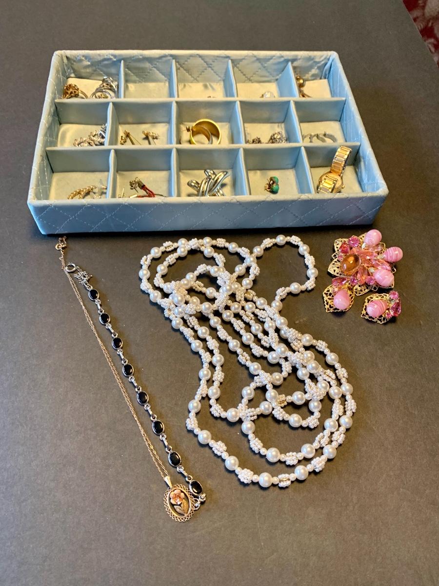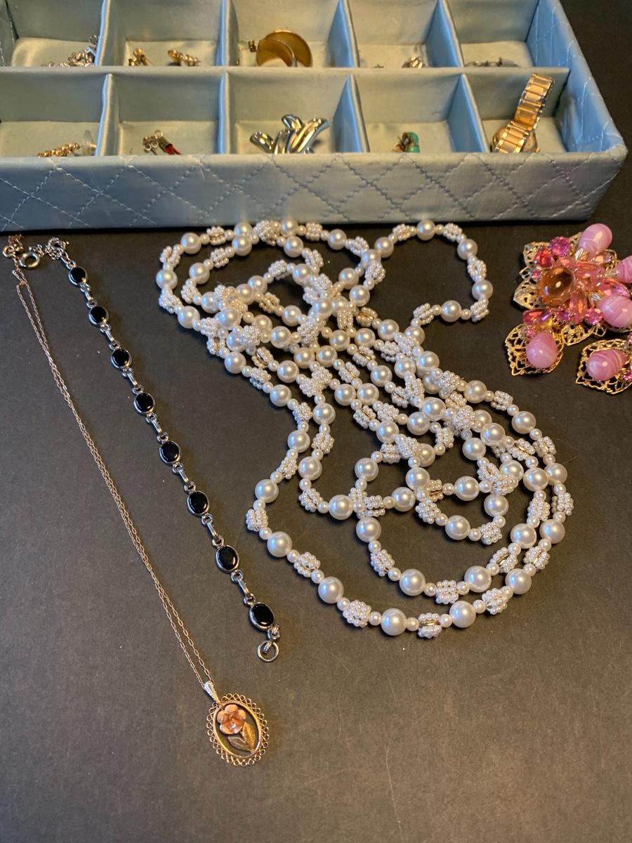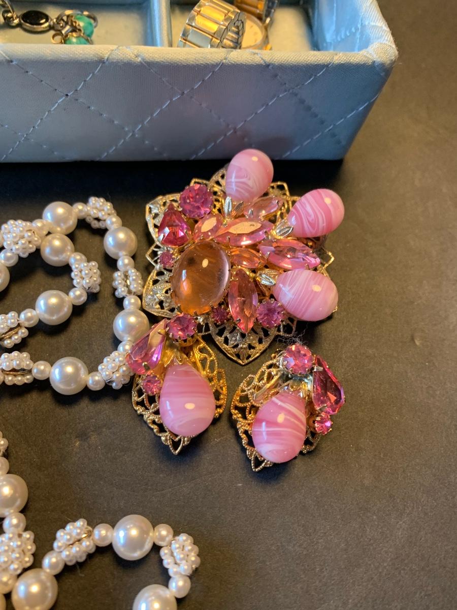 Pearls, Pins, Earrings, Bracelet are all included in this lot of wearable jewels .