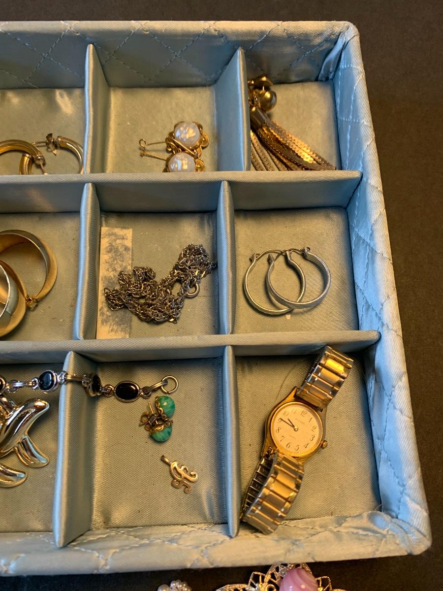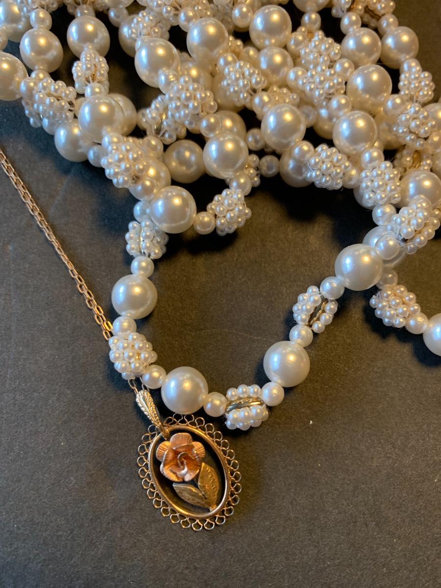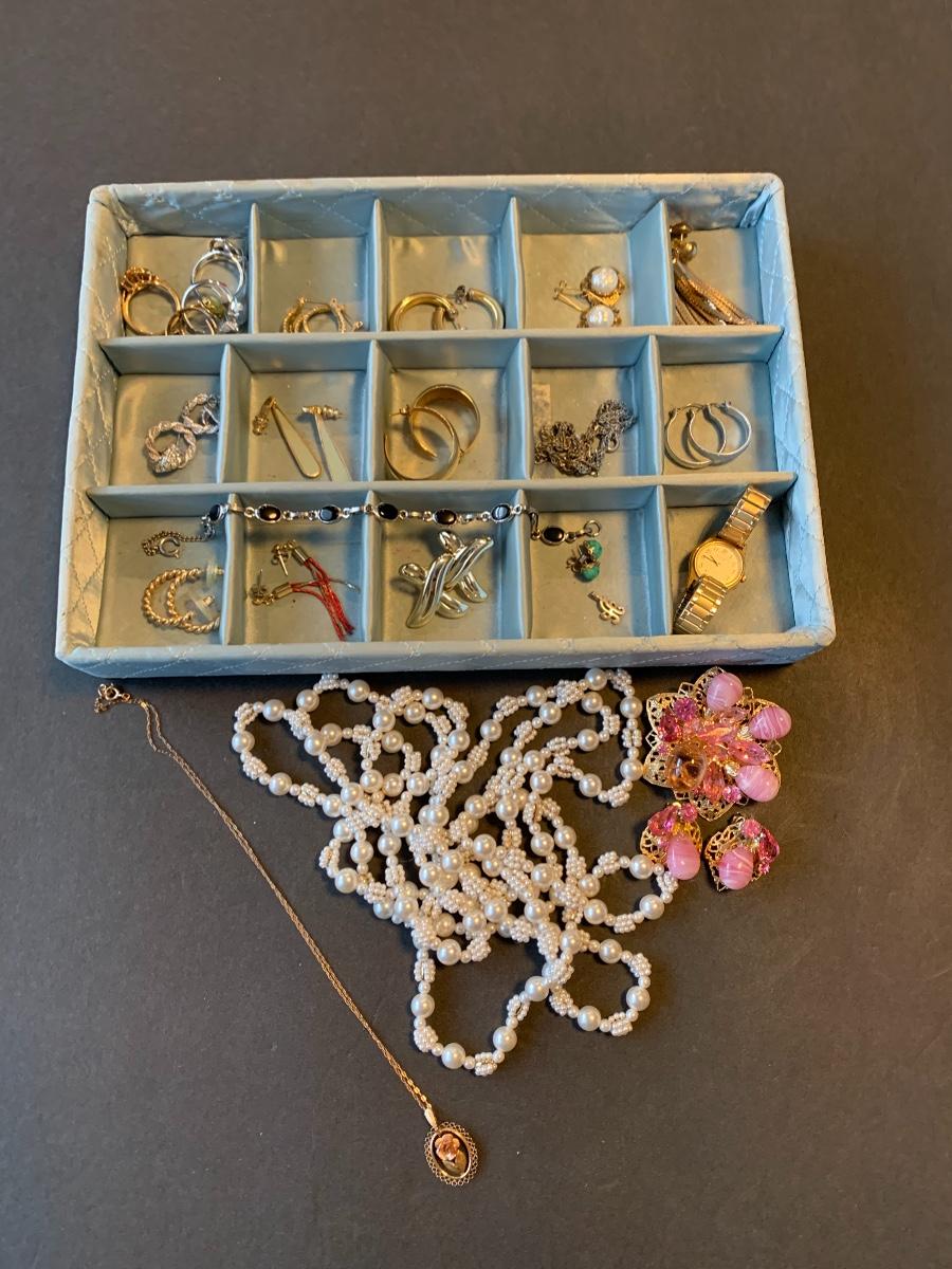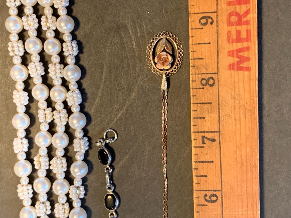 Pearls, Pins, Earrings, Bracelet are all included in this lot of wearable jewels .