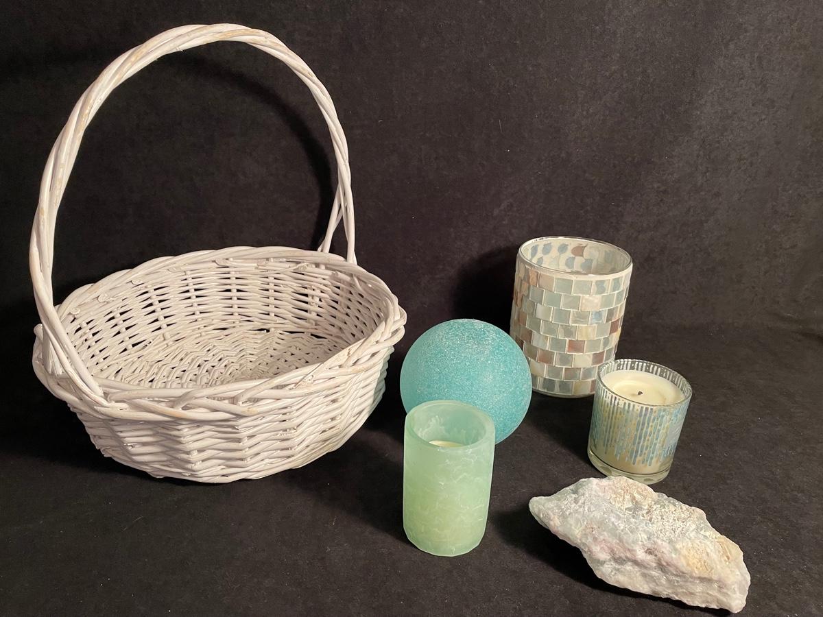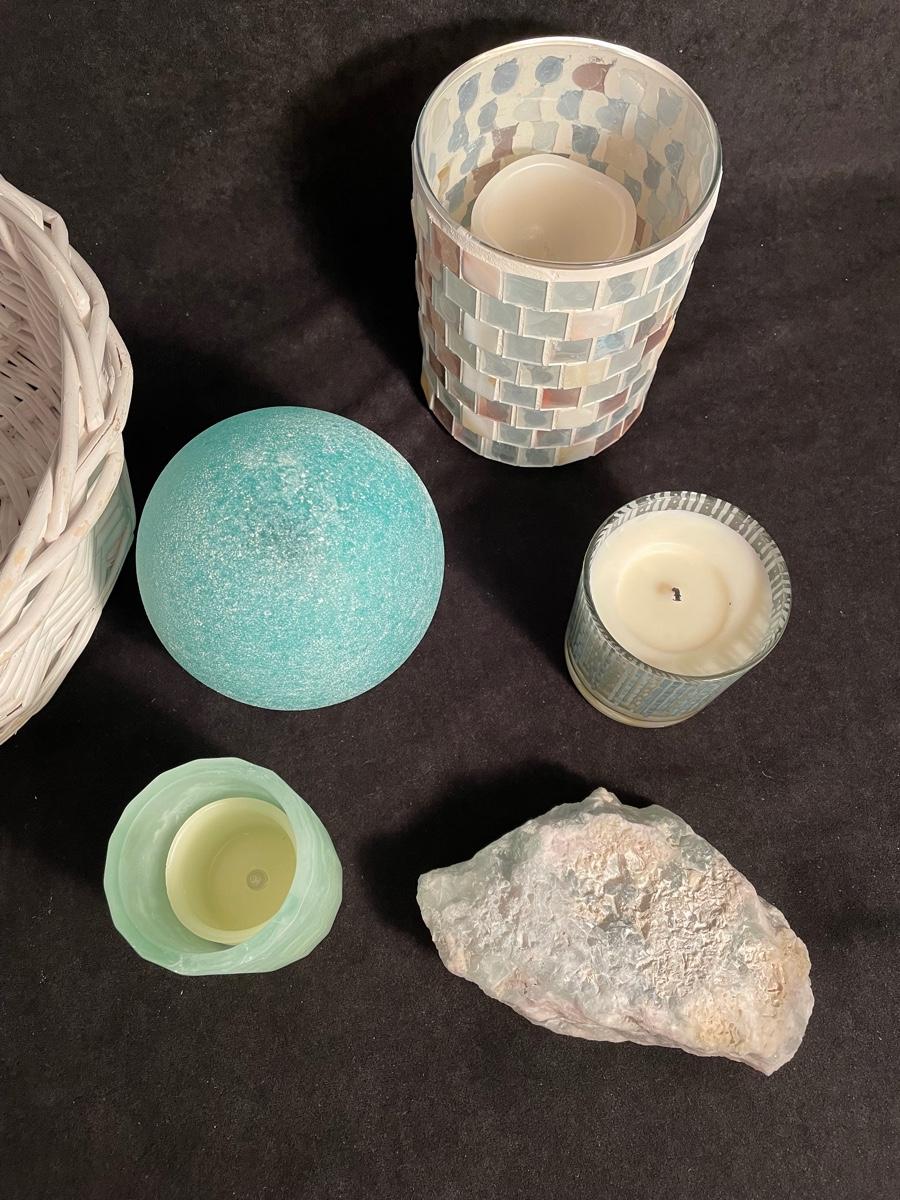 Mosaic Candle, Turquoise Glass Ball, Smaller Candle, Decorative Quartz Rock, Pale Green Candle Holder and Basket.