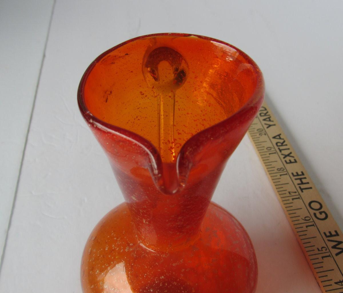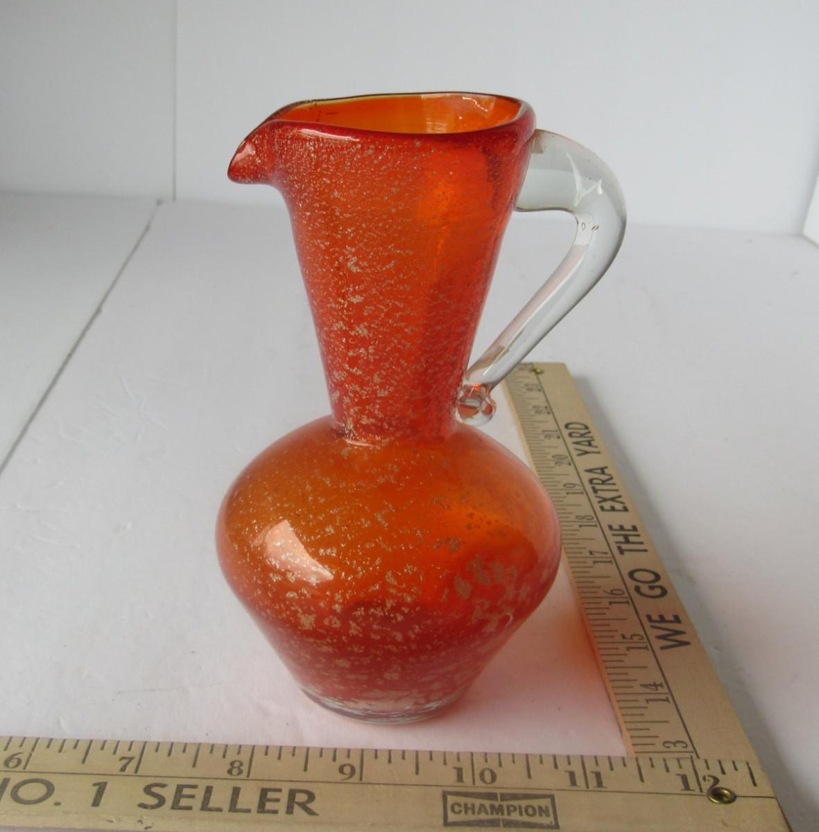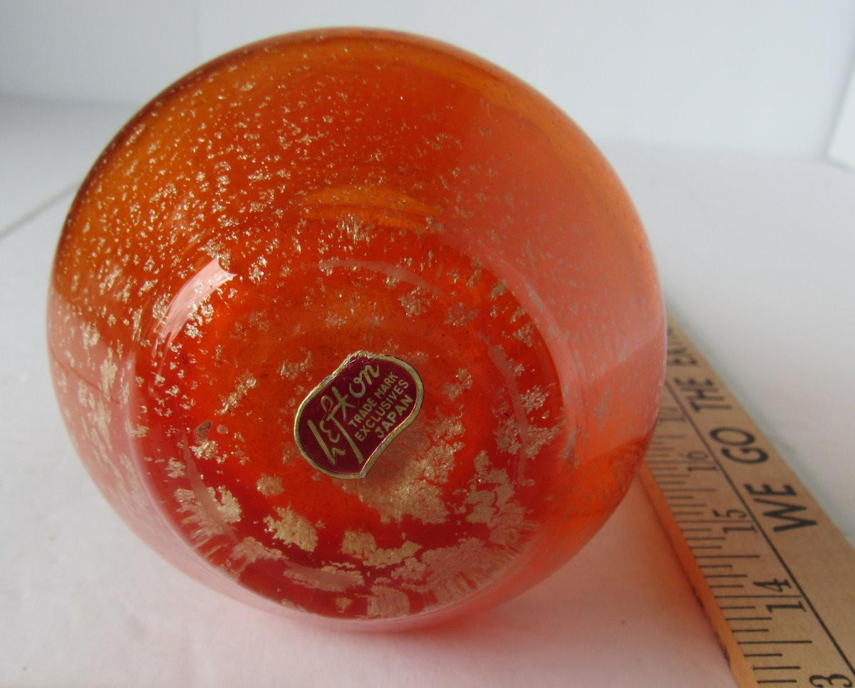 Orange glass with gold spangles, mod style, Lefton label on bottom. Nice shape. Shipping available at shipping cost plus $5 per box handling fee. All sales final, no refunds. See our terms for details.