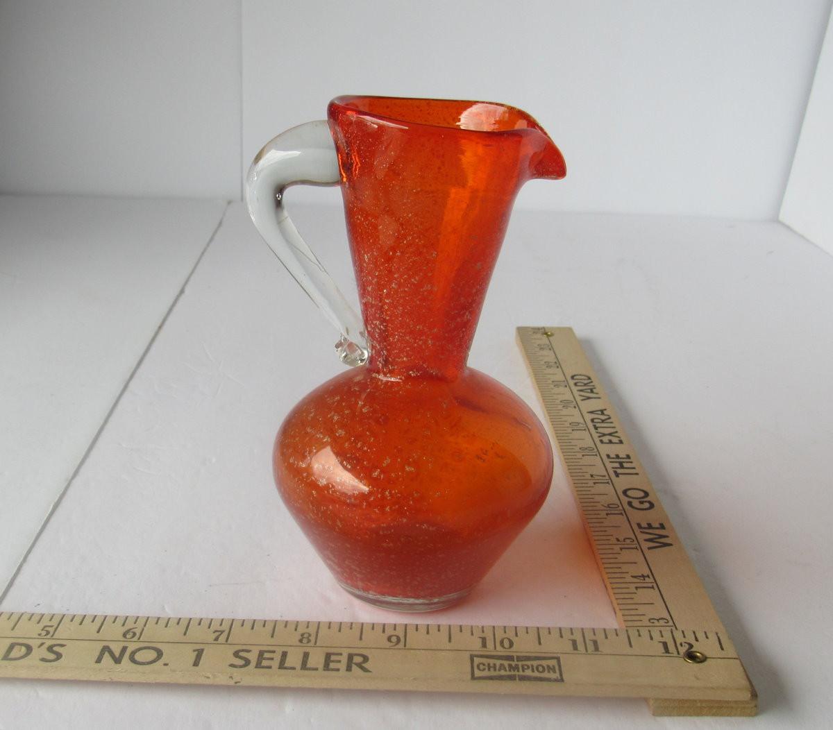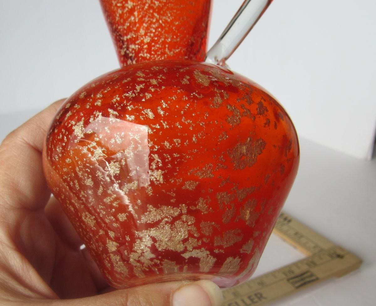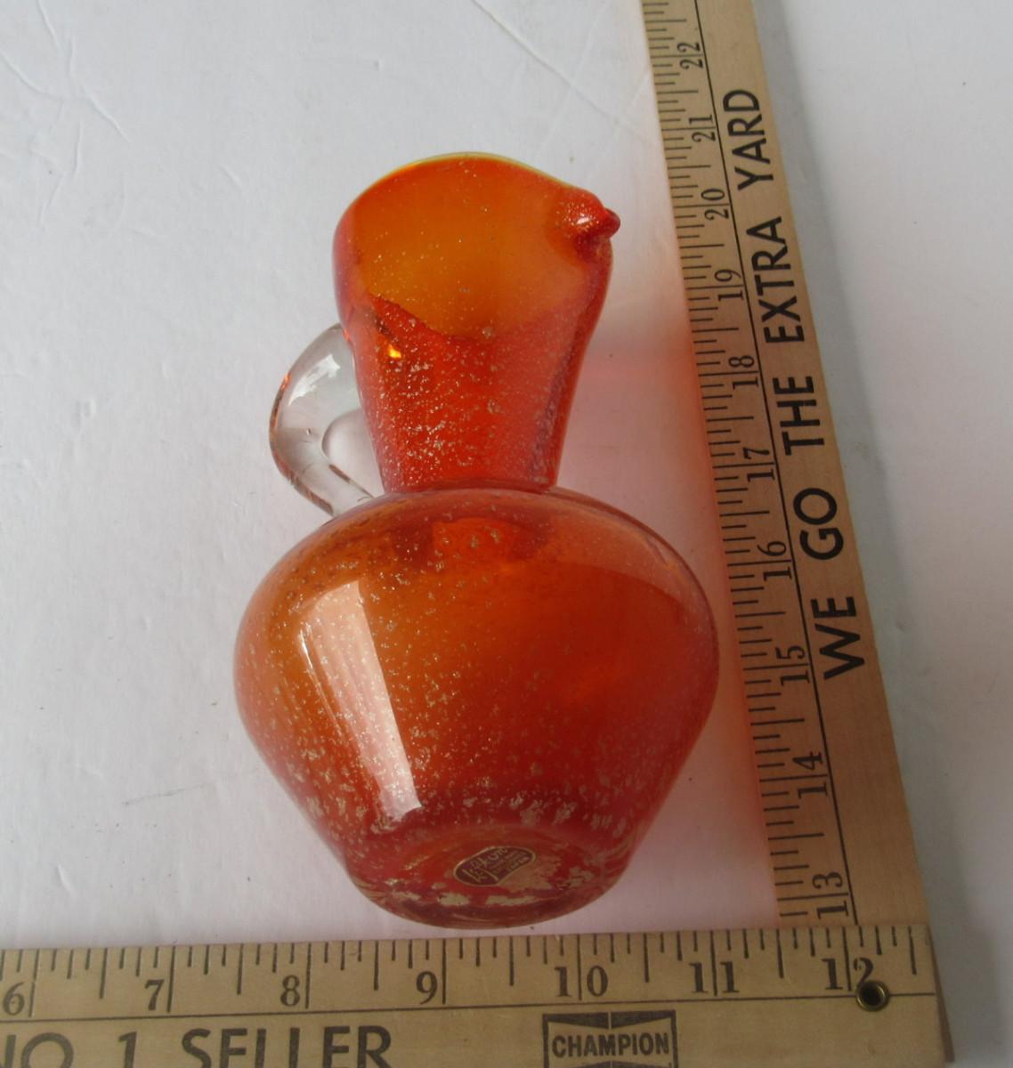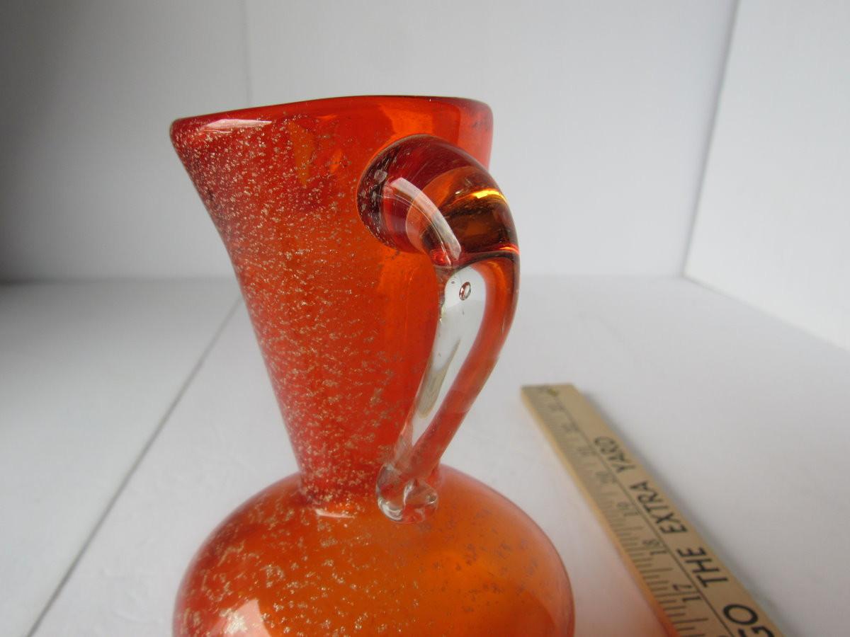 Orange glass with gold spangles, mod style, Lefton label on bottom. Nice shape. Shipping available at shipping cost plus $5 per box handling fee. All sales final, no refunds. See our terms for details.