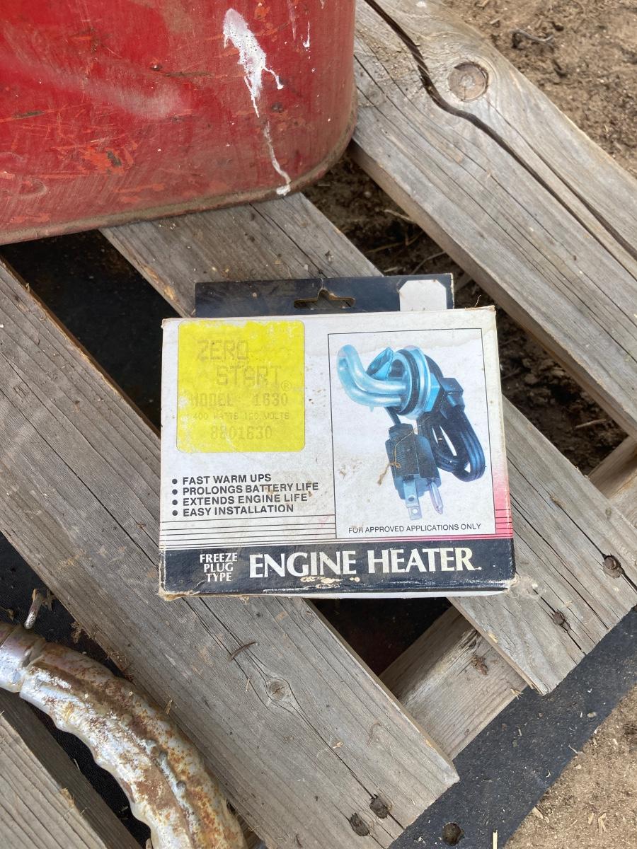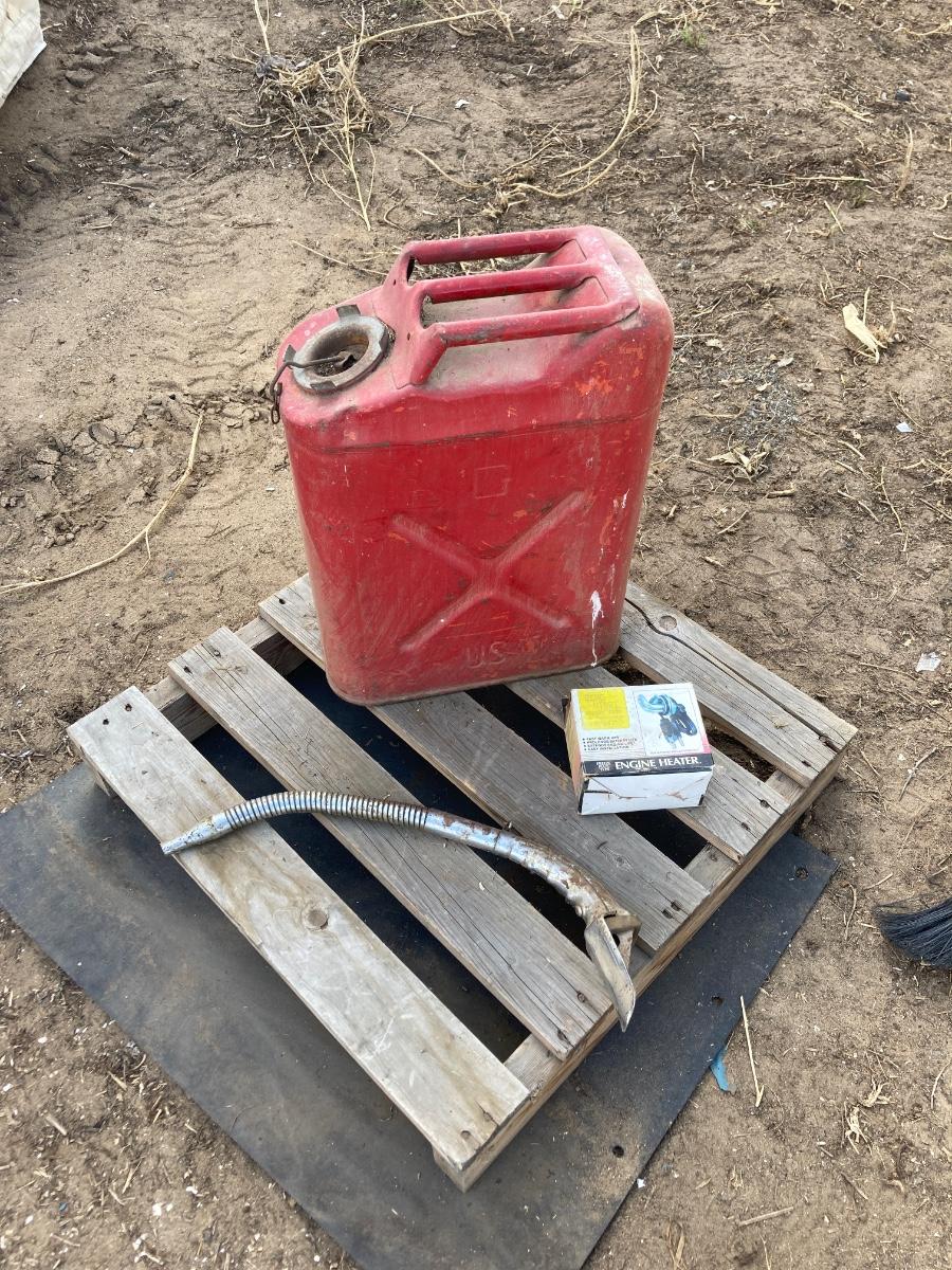 LOT 447  FIVE GALLON JERRY GAS CAN AND AN ENGINE BLOCK HEATER