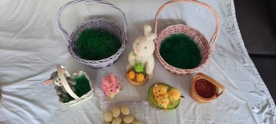 Purple and Pink Larger Baskets, White and Natural Smaller Baskets, Pink Paper Bunny