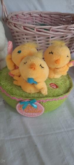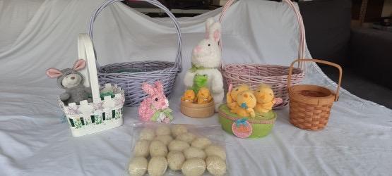 Lot 447 Easter Baskets, Decorative Eggs, Gray Bunny, 3 Chick Sing "We Got the Beat"