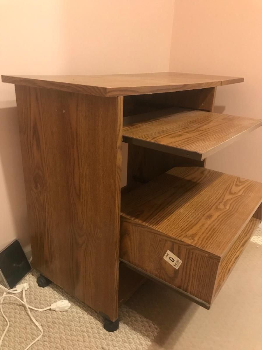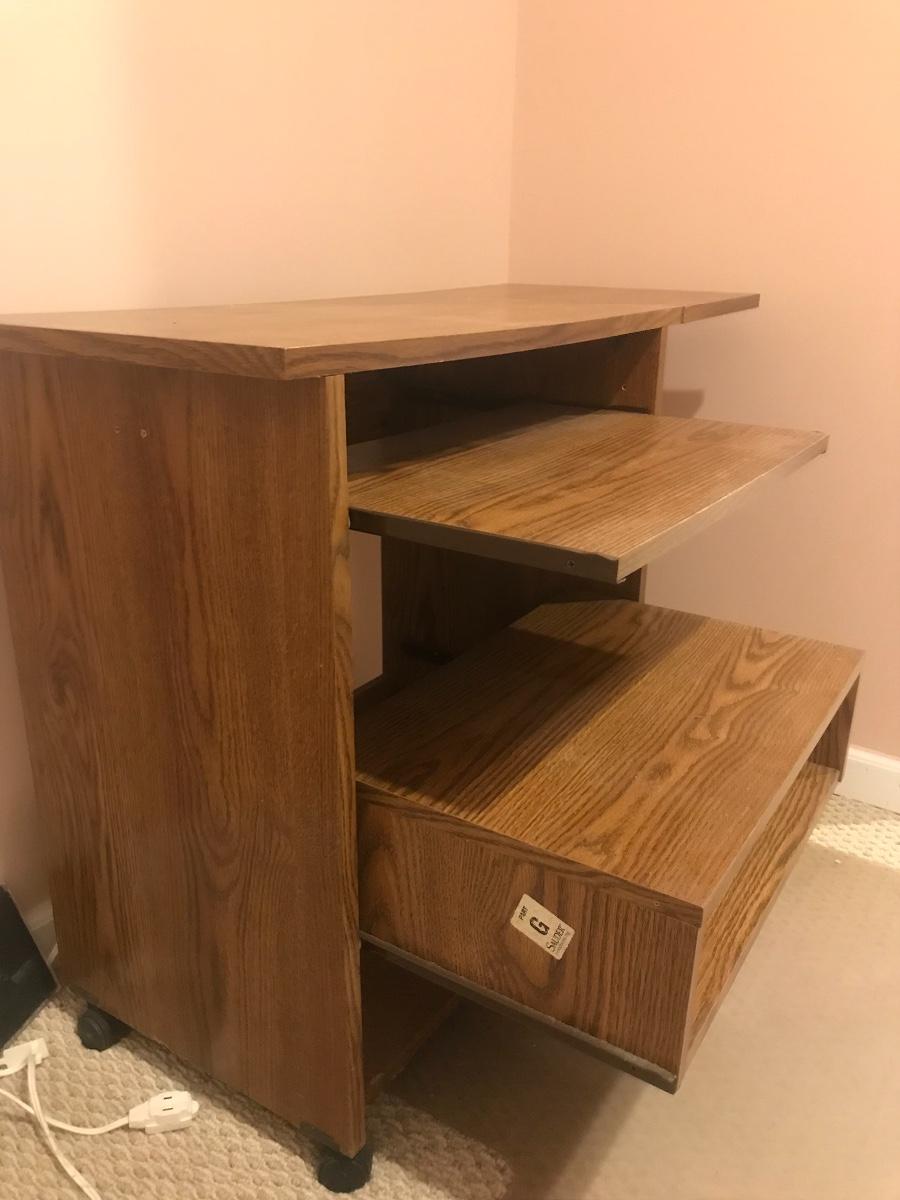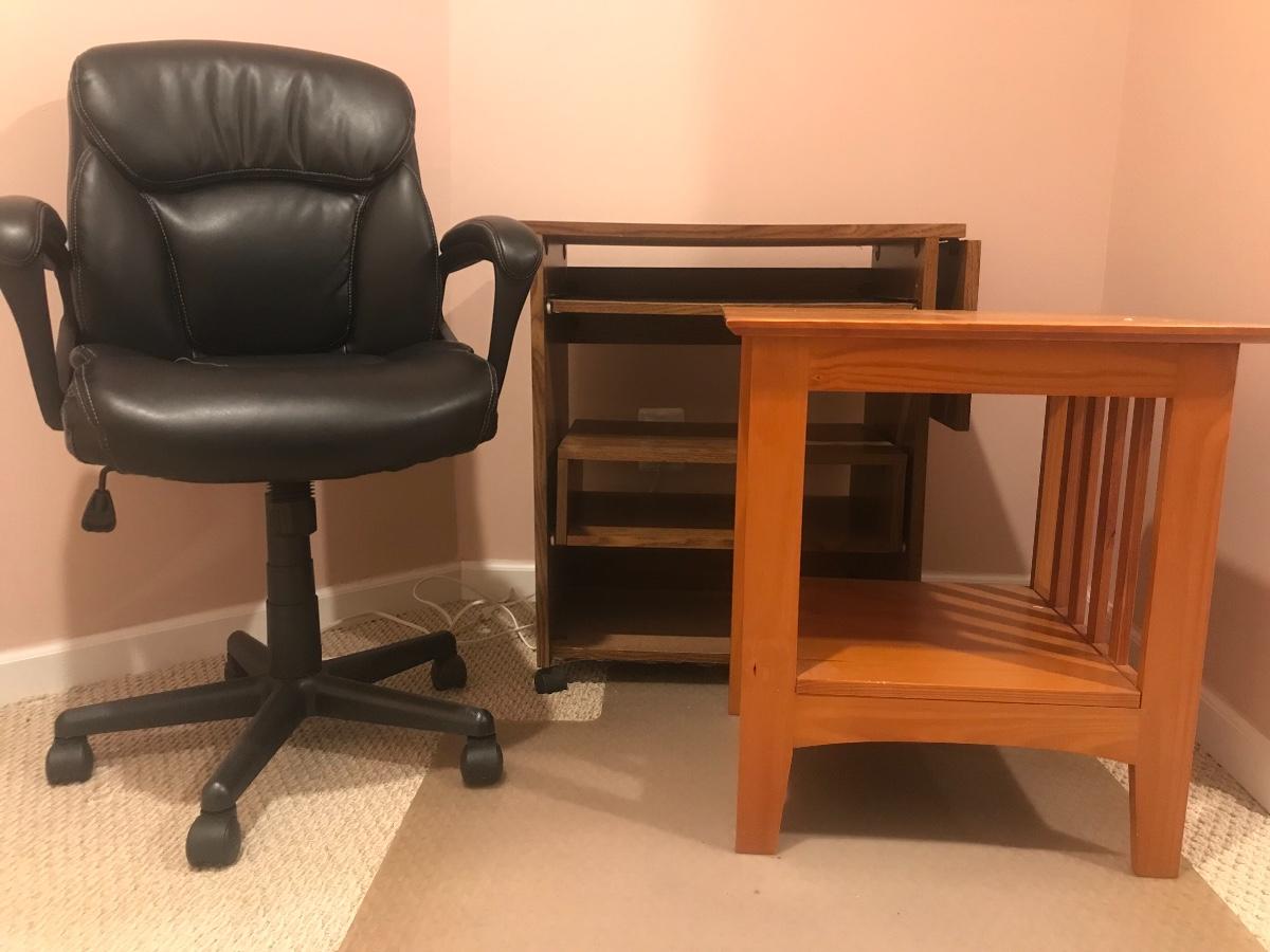 Instant office with this chair, table, 22x18x24, and cabinet, 27x16x29. Please see all pictures as they are the best representation of the items. The pictures show condition, measurements if taken, and what is included in the lot. Due to the large amount that we photograph and the time frame, we are not always able to take measurements. All items unless noted, are pre-owned and have been used. If you purchased furniture, you must bring help. We do not allow one person to carry large furniture out on their own. Bring help, tools and a truck for the safety of our client’s homes, and your personal safety. Company policy. Thank you.