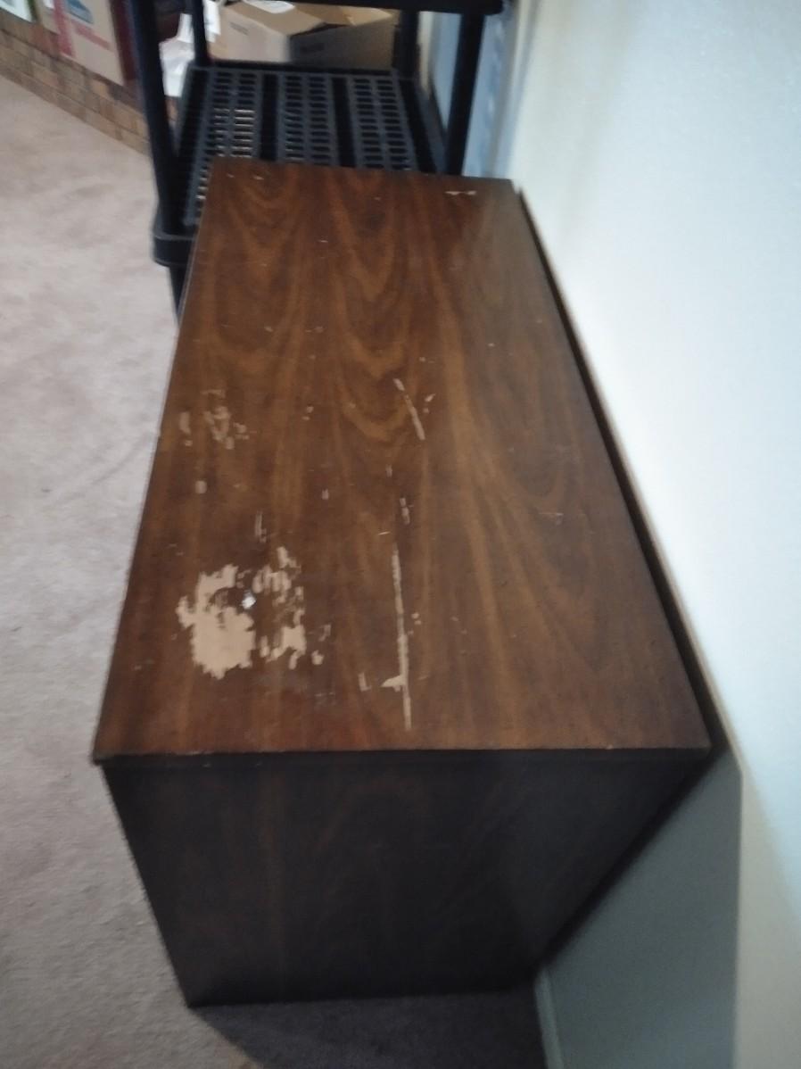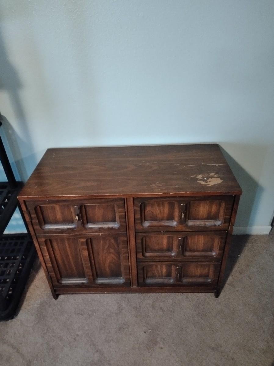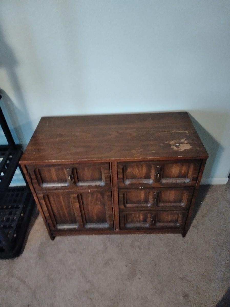 NICE PIECE TO RE-FINISH OR USE AS IS, TOP IS SCRATCHED. CHEST OF DRAWERS WITH STORAGE ON ONE SIDE. 30" X 38" X 18"