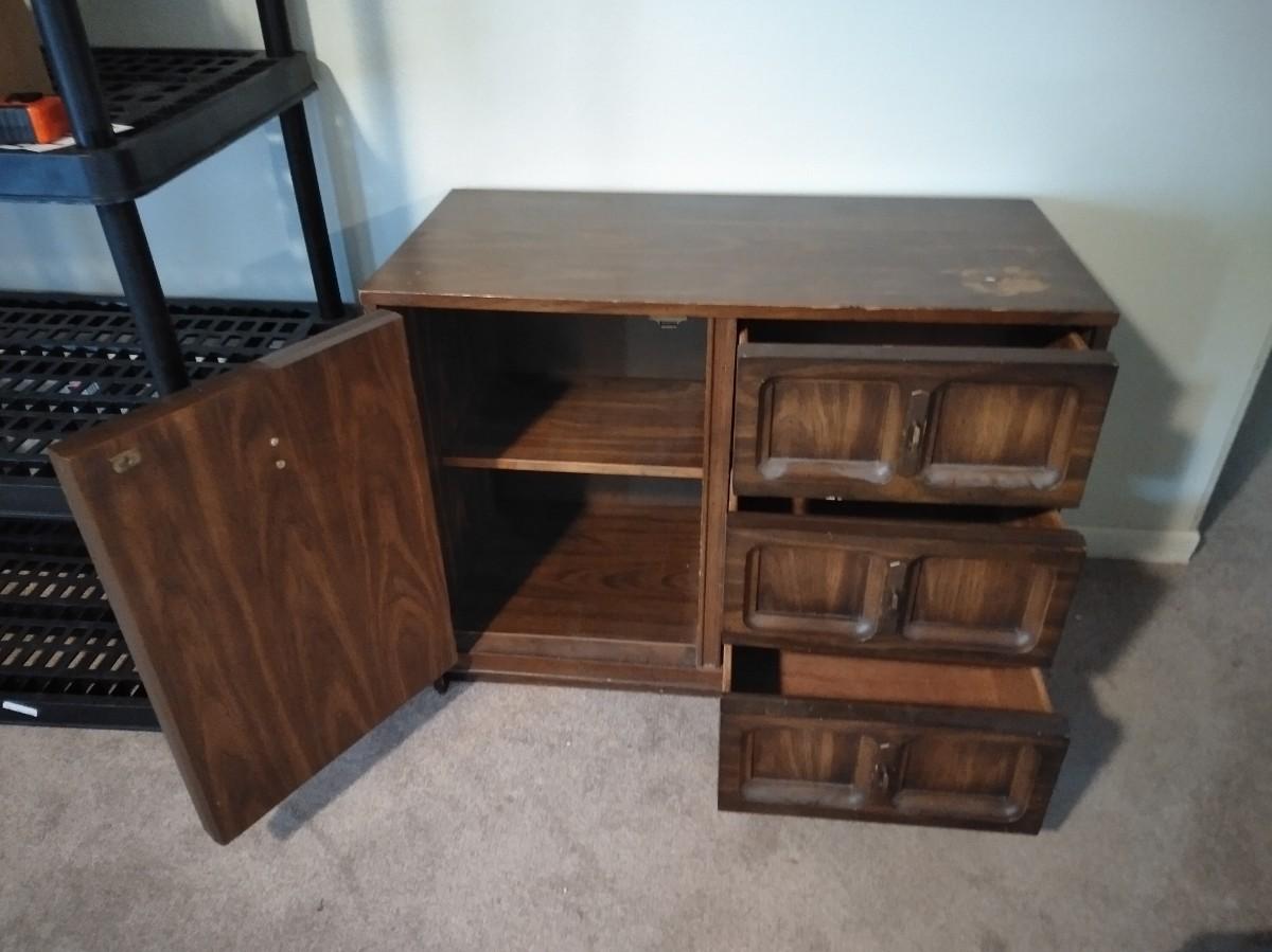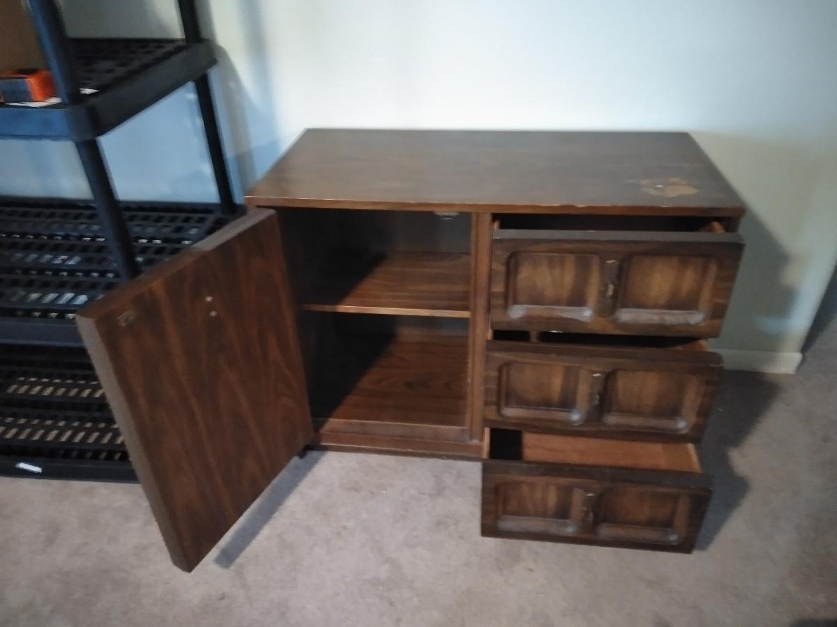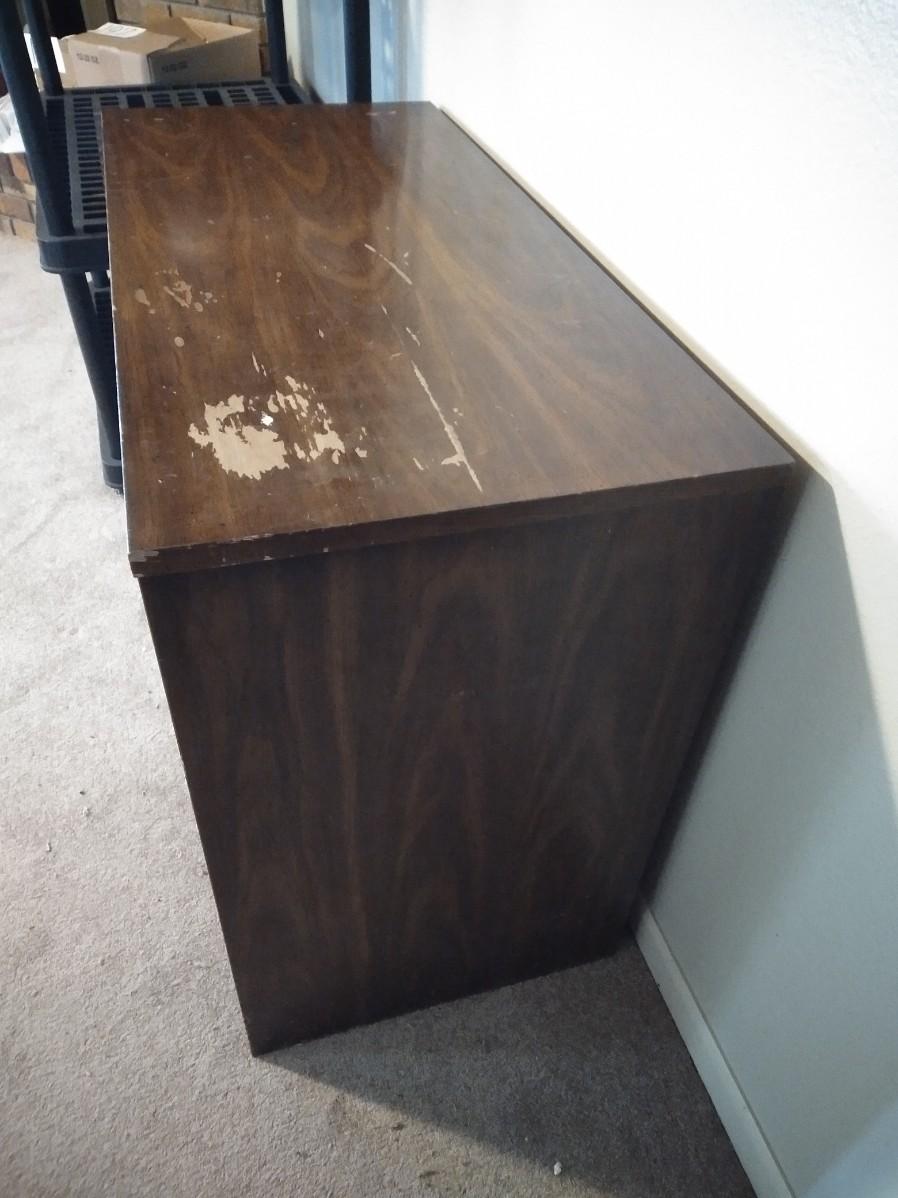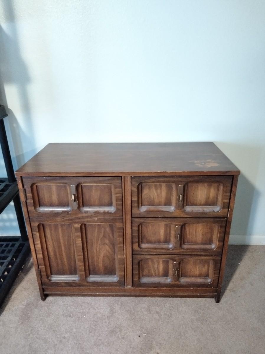 NICE PIECE TO RE-FINISH OR USE AS IS, TOP IS SCRATCHED. CHEST OF DRAWERS WITH STORAGE ON ONE SIDE. 30" X 38" X 18"