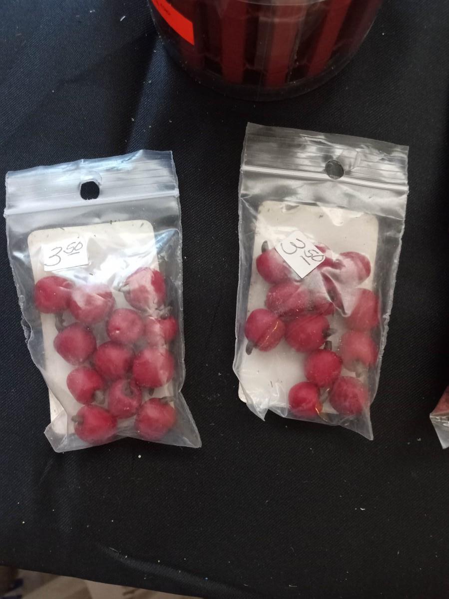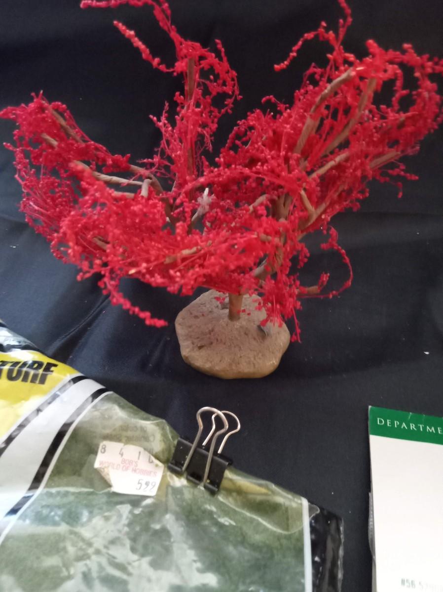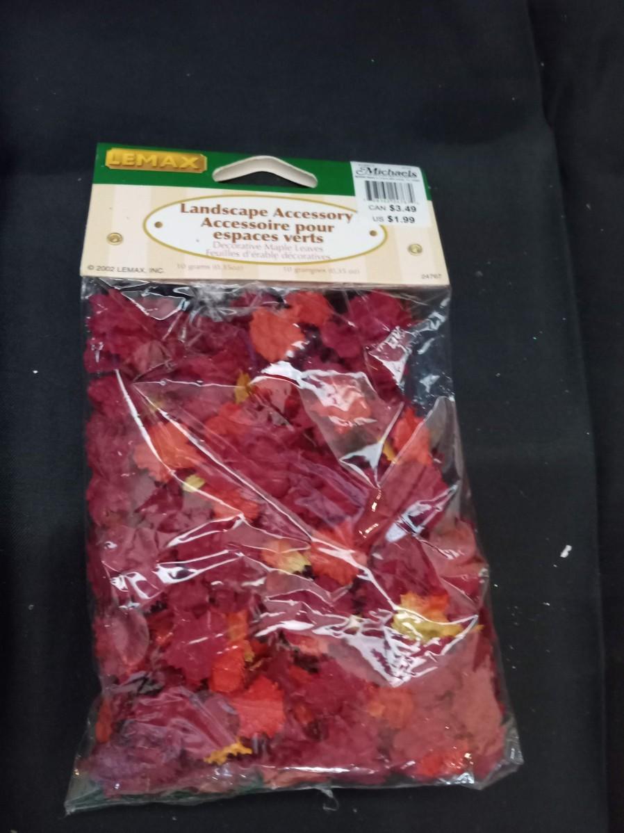 WOODEN APPLES, REDWOOD PICKET FENCE, LANDSCAPE MATERIAL, MINI SILK FLOWERS, MILKY MOONSTONE ROCKS, MAPLE LEAVES, AUTUMN TREES AND DEPT 56 CRUSHED ICE