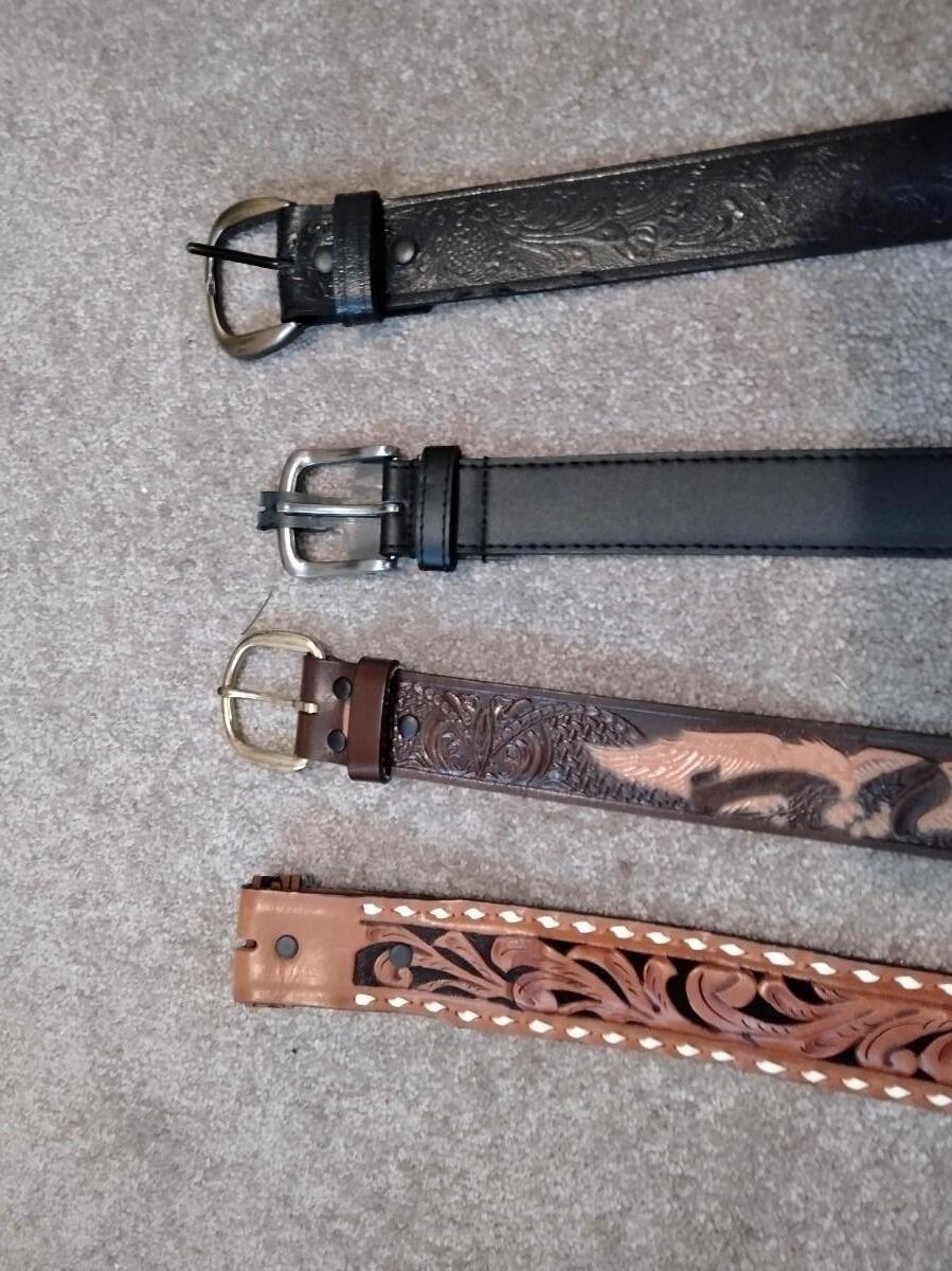 FOUR DECORATIVE TOOLED LEATHER BELTS SIZE 36