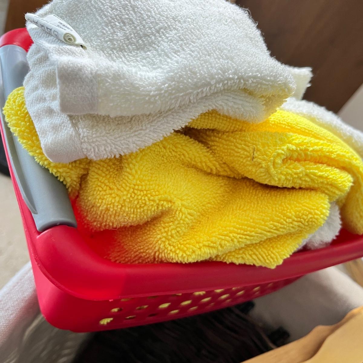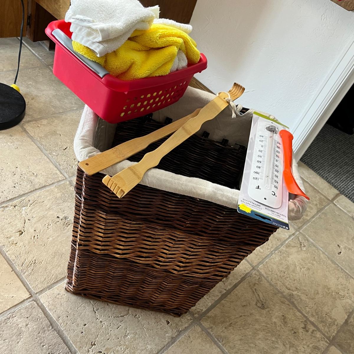 wicker hamper, wash clothes, thermometer, back scratcher and shoehorn