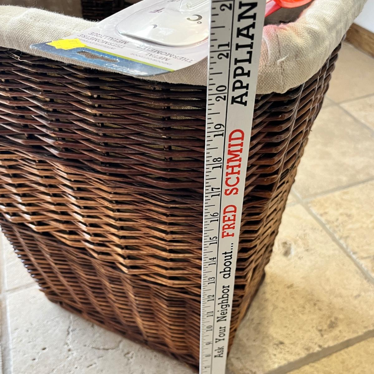 Lot 45 wicker hamper, wash clothes, thermometer, back scratcher and shoehorn