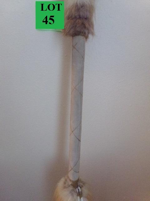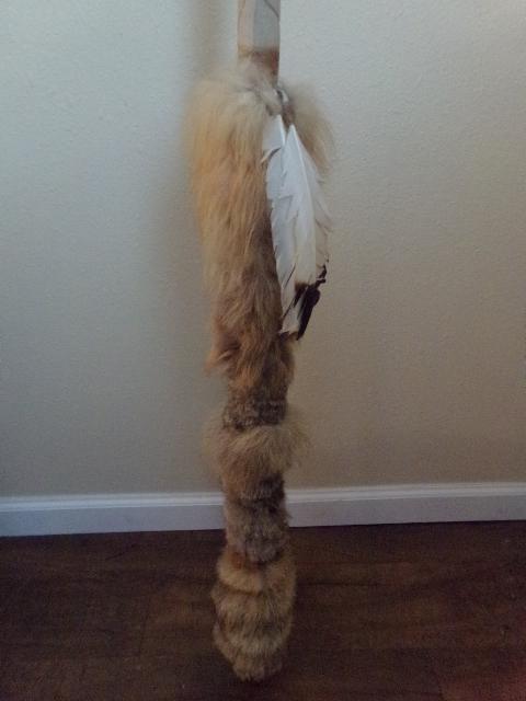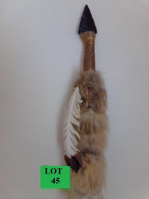 REPRODUCTION? SPEAR TIP IS MADE OF RESIN THE SHAFT IS COVERED WITH LEATHER, FUR AND FEATHERS, IT MEASURES 76"
