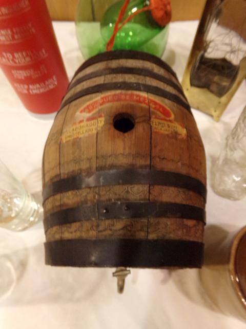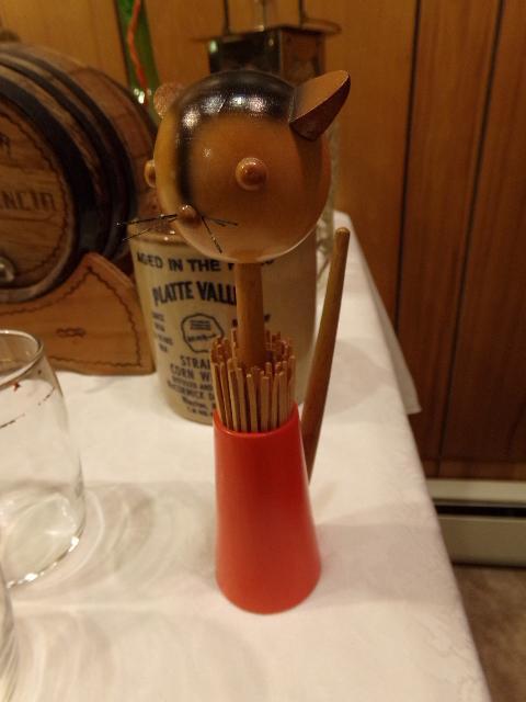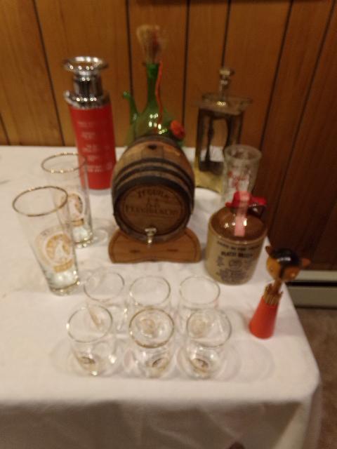 CLAY JUG, WHISKEY BARREL WITH SPIGOT & WOODEN KITTY CAT TOOTHPICK HOLDER