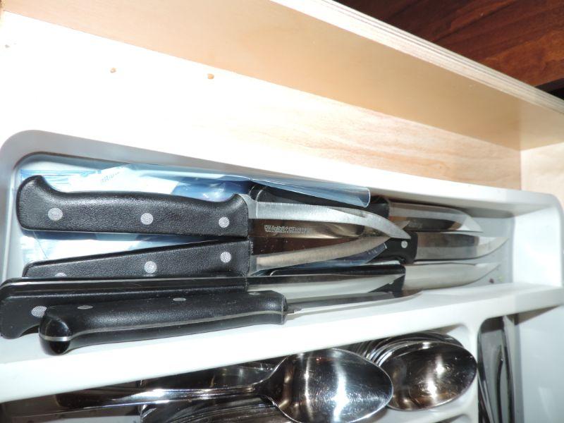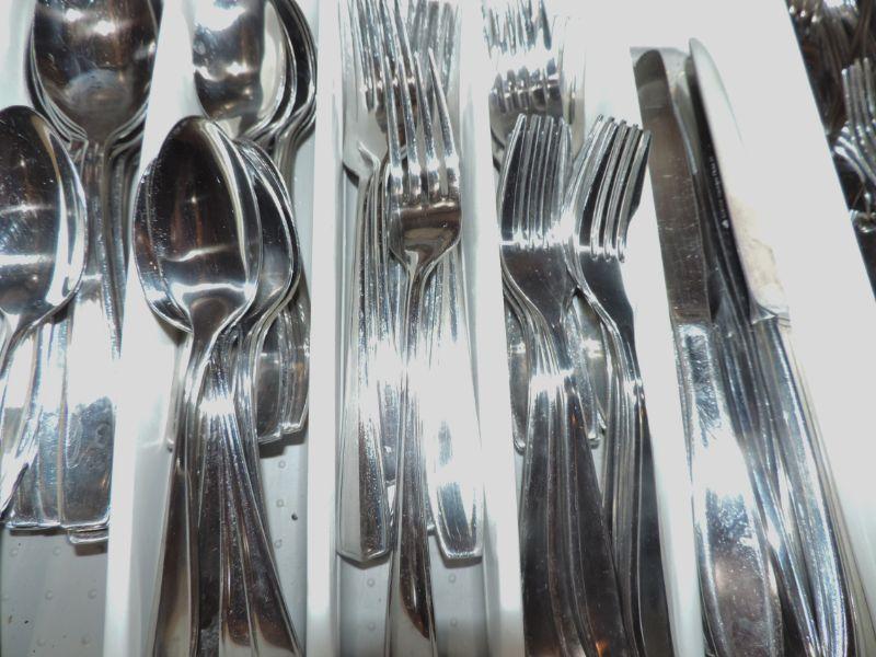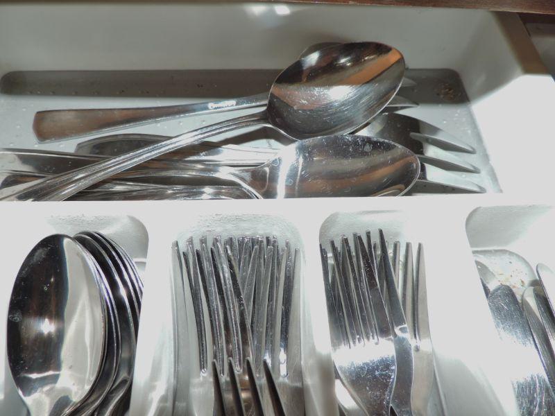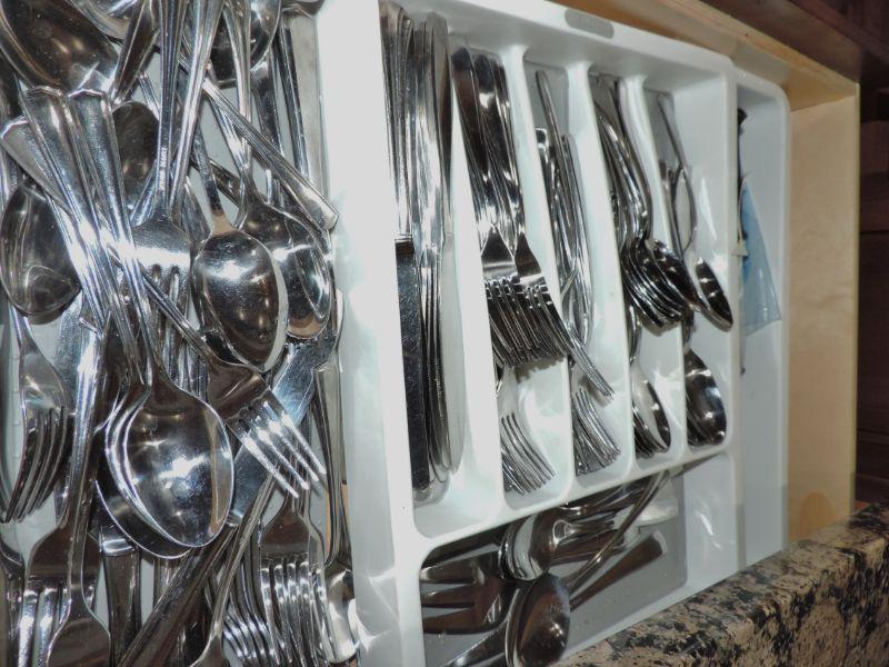 GIBSON STAINLESS STEEL SILVERWARE/FLATWARE AND STEAK KNIVES IN VERY GOOD CONDITION. ALSO INCLUDES ORGANIZER