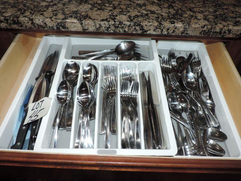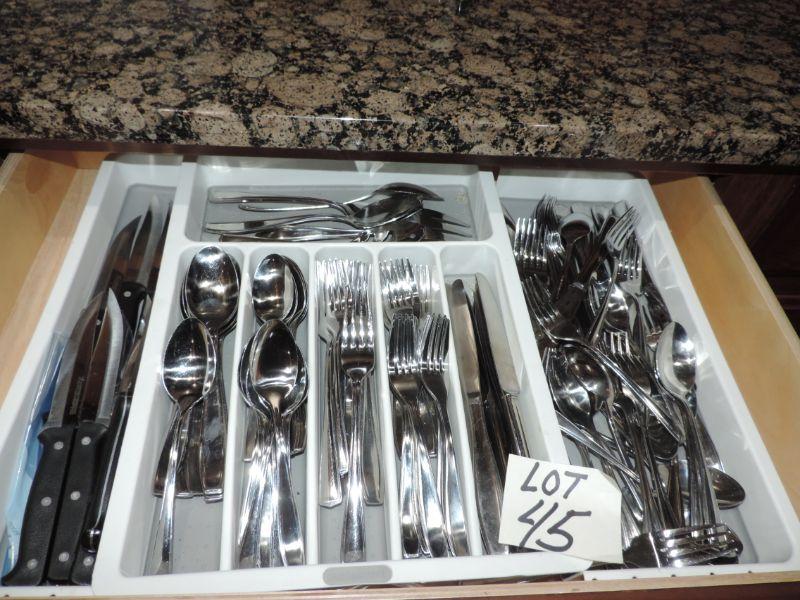 LOT 45 LARGE LOT OF FLATWARE AND STEAK KNIVES