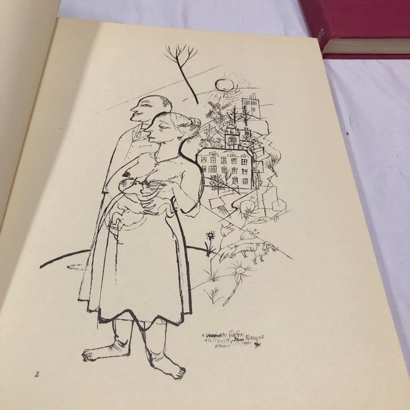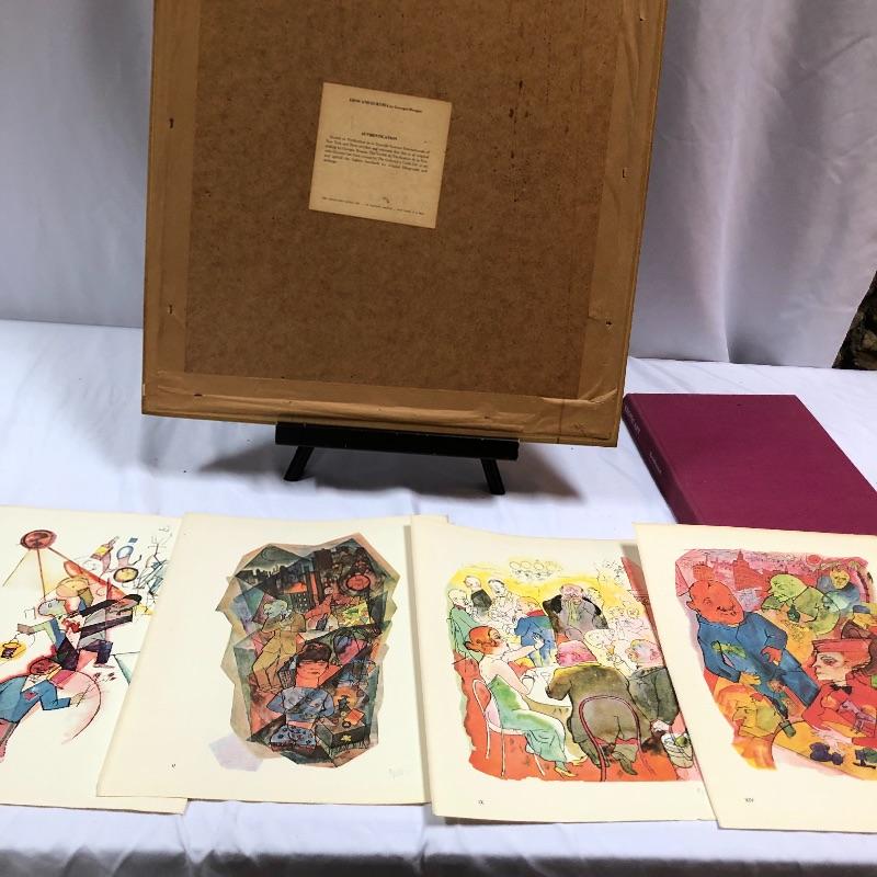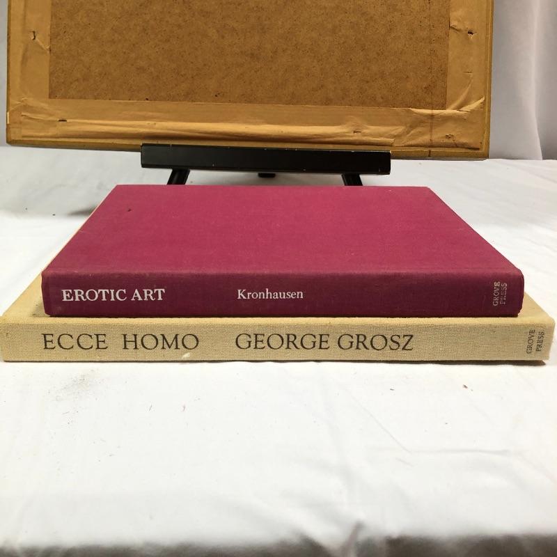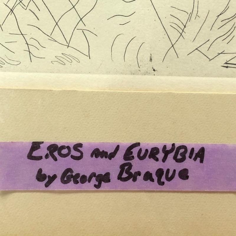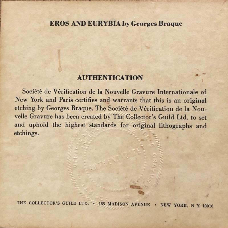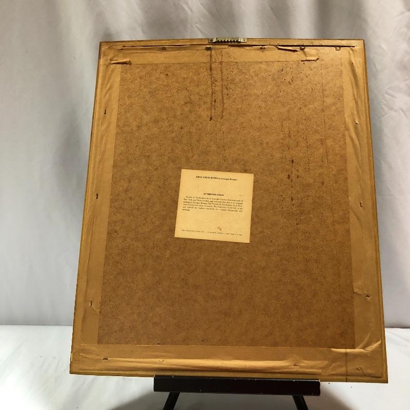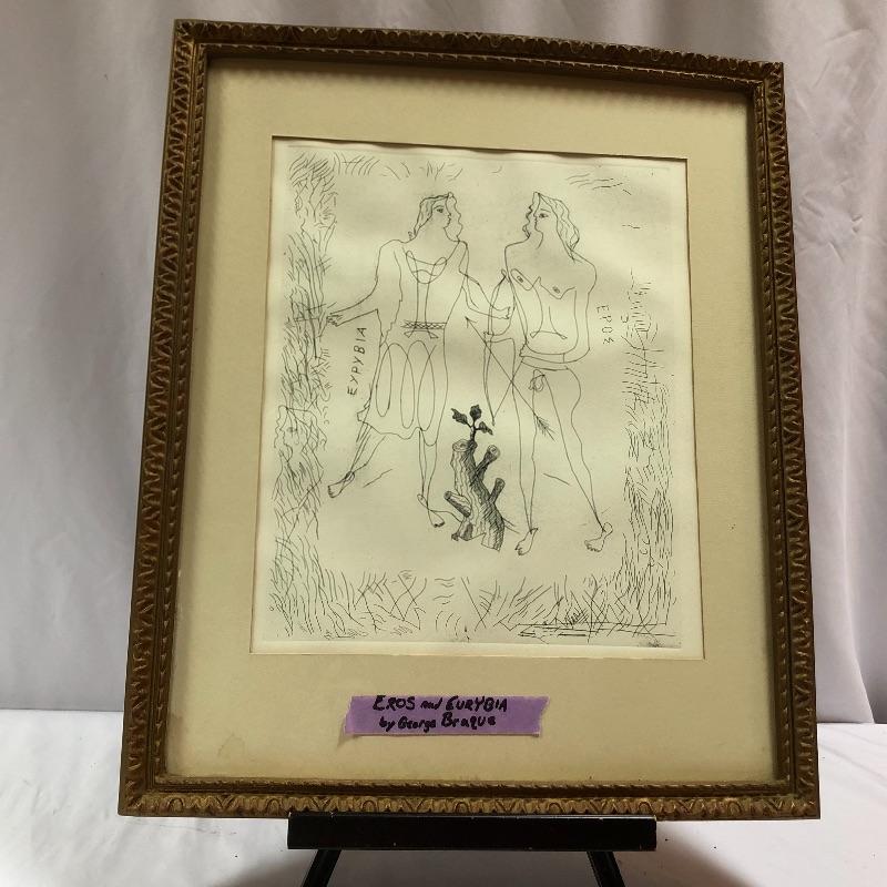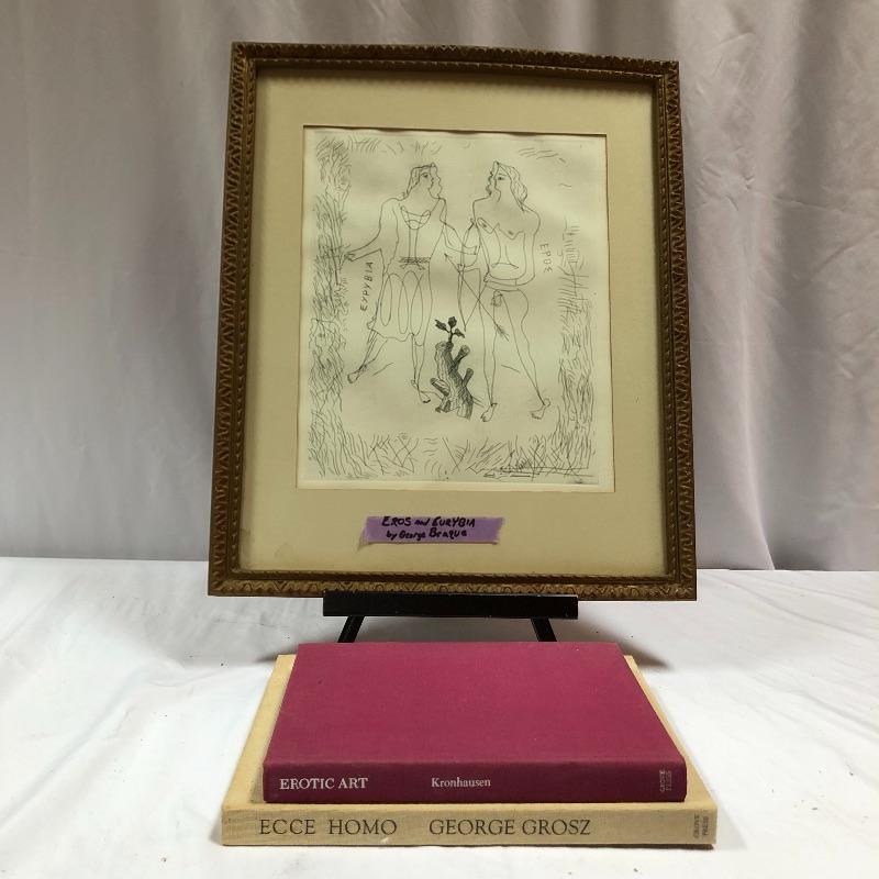 Eros and Eurybia is the title for this George Braque's piece that has a COA on the back. The purple label on the front is just taped to the glass. It is mounted in a very nice wood frame that is matted and measures 18.5” x 22”. Also included are two books titled Erotic Art by Kronhausen and Ecce Homo by George Grosz. Both books are in very good condition, see images for more information. The loose pages appear to be from another book.