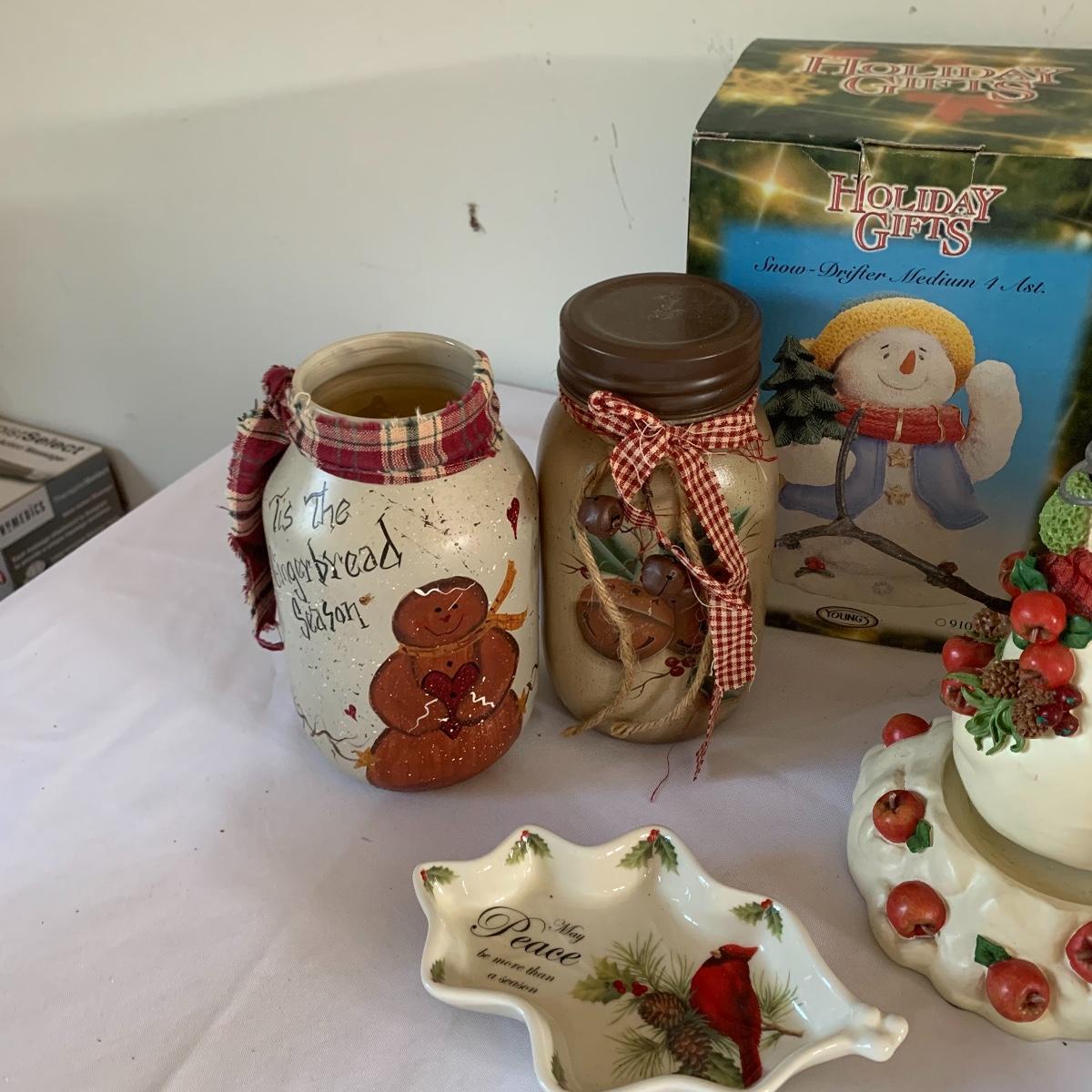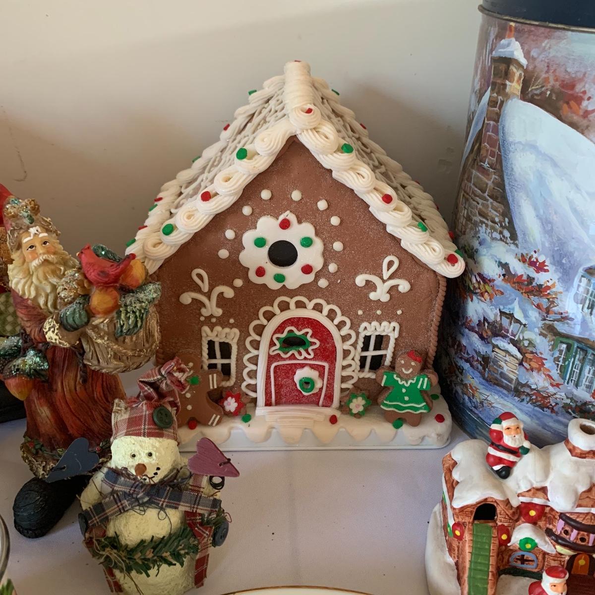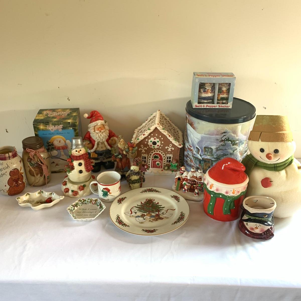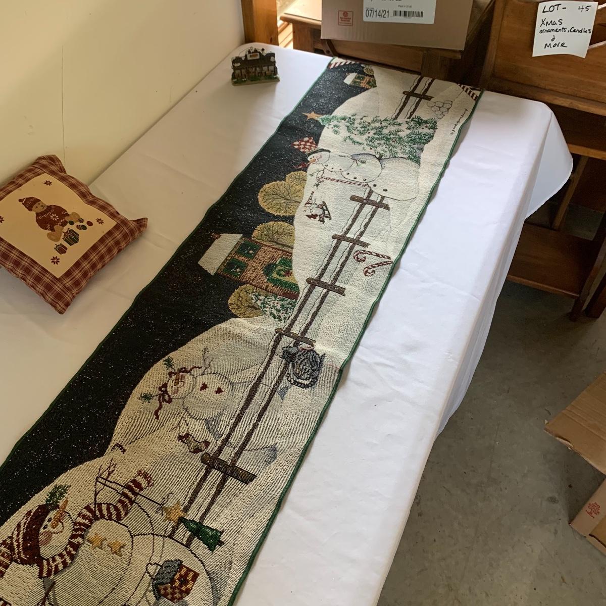 There’s certainly a Merry Christmas coming to the lucky winner of this lot! Included in this lot are numerous ornaments, pillows, table cloths, candles, knick knacks, table runners, place mats, cookie tins, a glass nativity scene, snow men, stockings and more! Also included are three lit Christmas displays. One did not turn on due to a broken light bulb. This is an extensive collection with lots to offer.