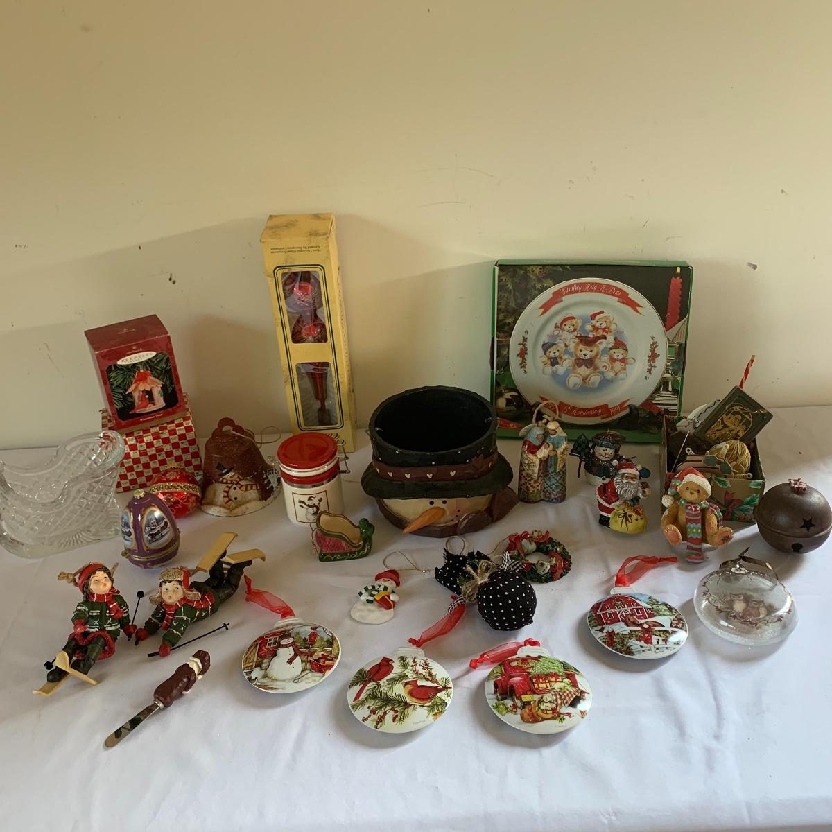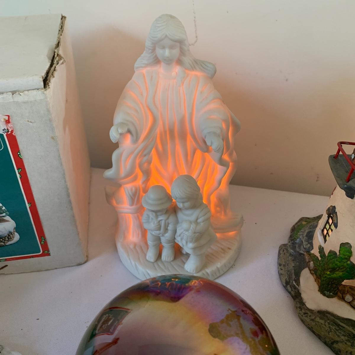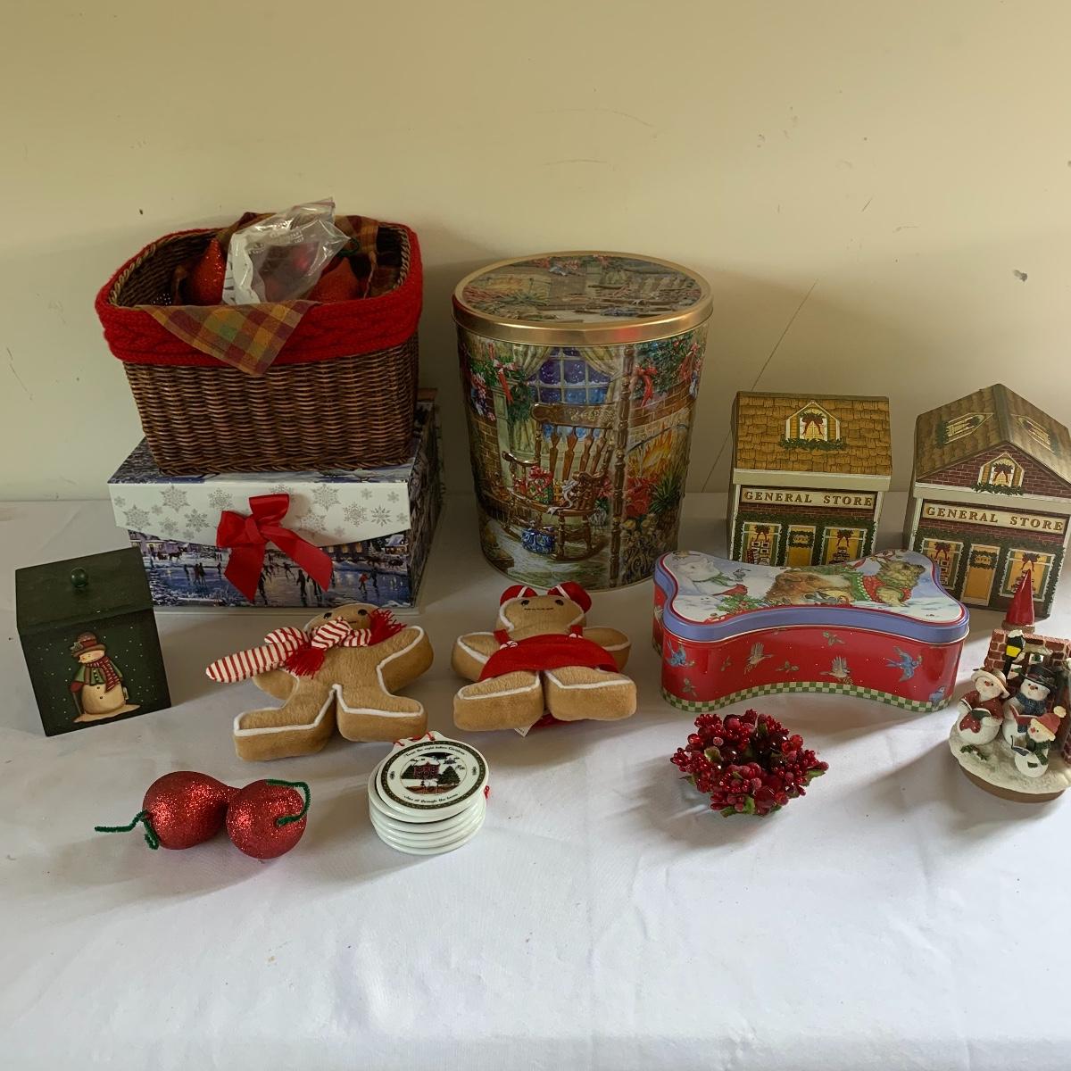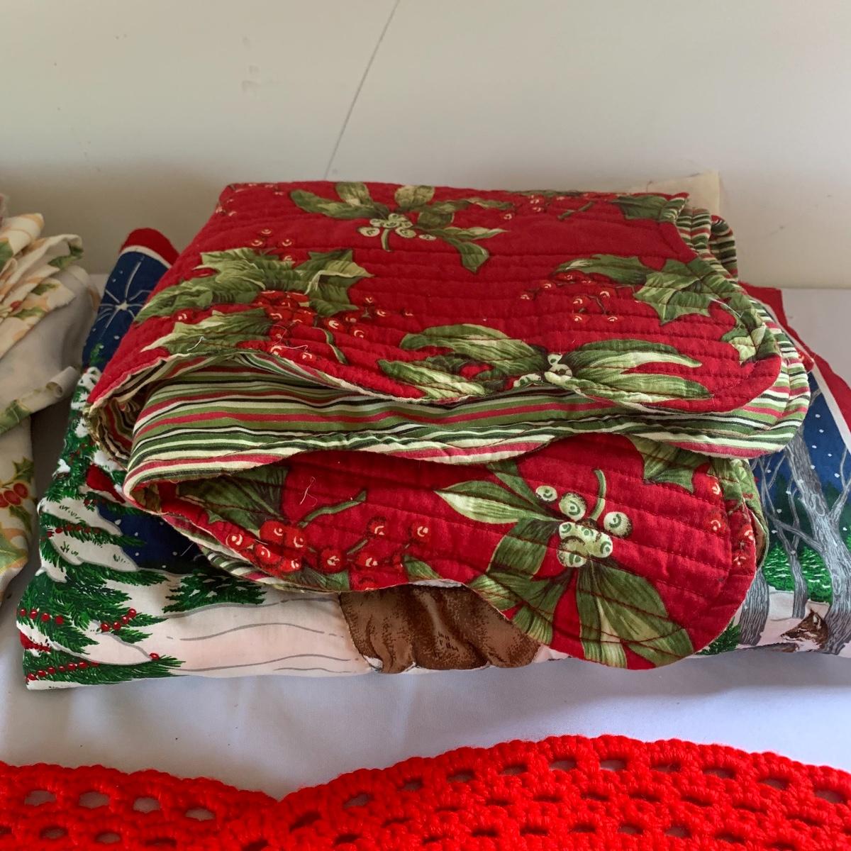 There’s certainly a Merry Christmas coming to the lucky winner of this lot! Included in this lot are numerous ornaments, pillows, table cloths, candles, knick knacks, table runners, place mats, cookie tins, a glass nativity scene, snow men, stockings and more! Also included are three lit Christmas displays. One did not turn on due to a broken light bulb. This is an extensive collection with lots to offer.