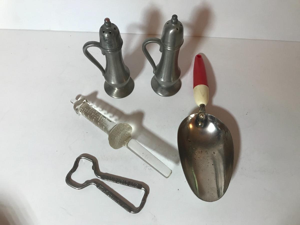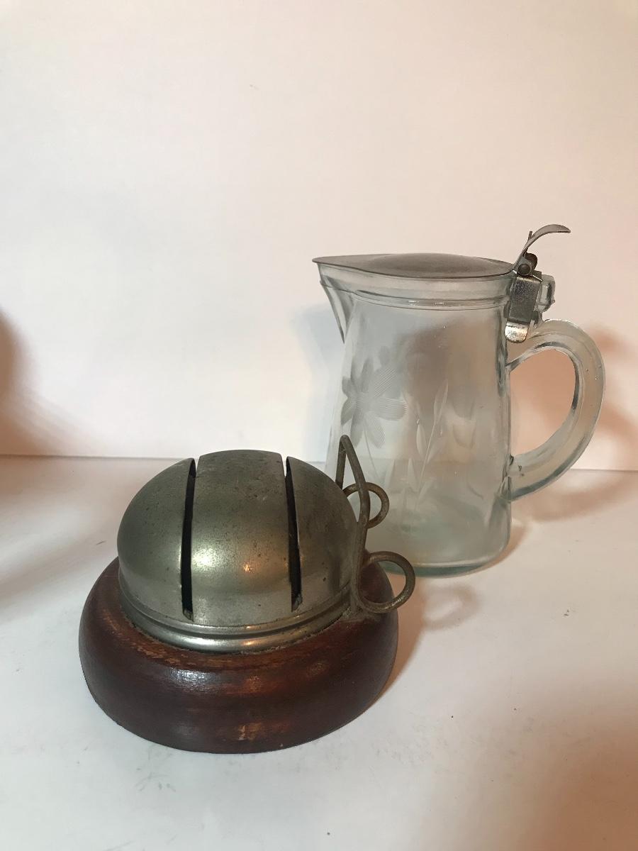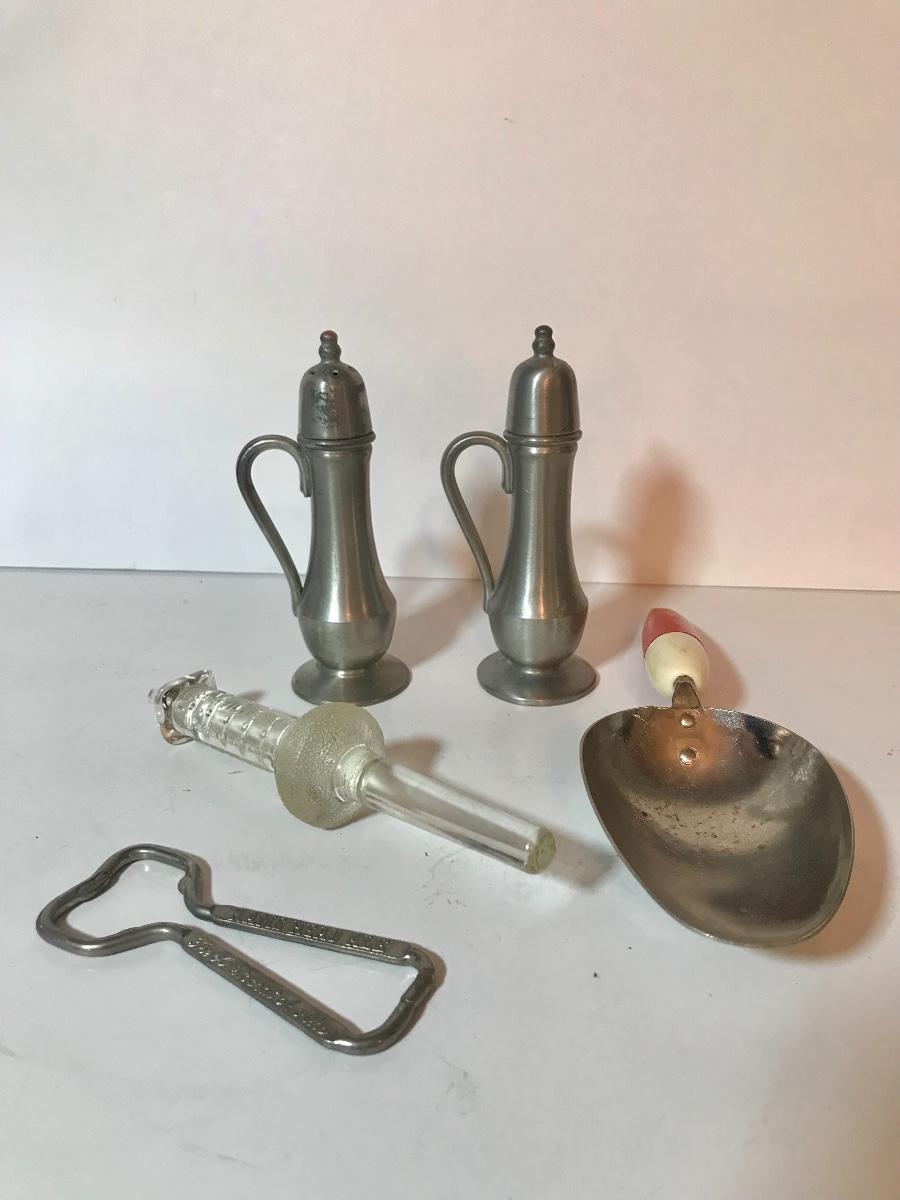 Vintage kettles, knife sharpener, salt and pepper set, scoop, and bottle opener from Rams Head Ale. An etched glass syrup dispenser with lid, and a glass Cory Filter Rod. Please see all pictures as they are the best representation of the items. The pictures show condition, measurements if taken, and what is included in the lot. Due to the large amount that we photograph and the time frame, we are not always able to take measurements. All items unless noted, are pre-owned and have been used. If you purchased furniture, you must bring help. We do not allow one person to carry large furniture out on their own. Bring help, tools and a truck for the safety of our client’s homes, and your personal safety. Company policy. Thank you.