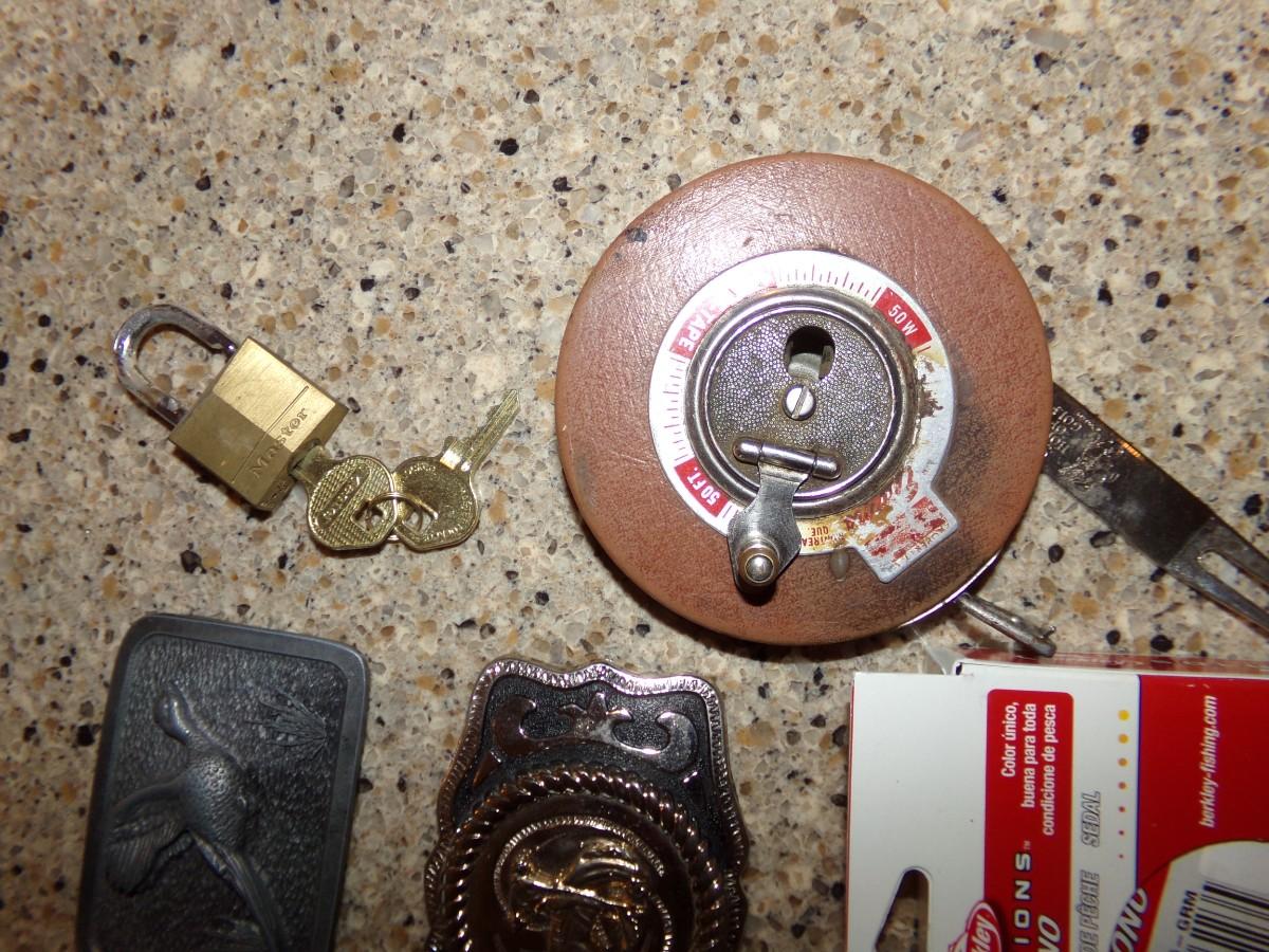 VINTAGE TAPE MEASURE, BELT BUCKLES, FISHING STRING, A NEW POCKET KNIFE, AND MORE.