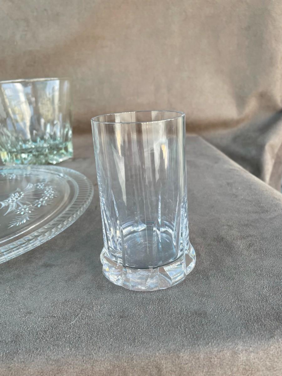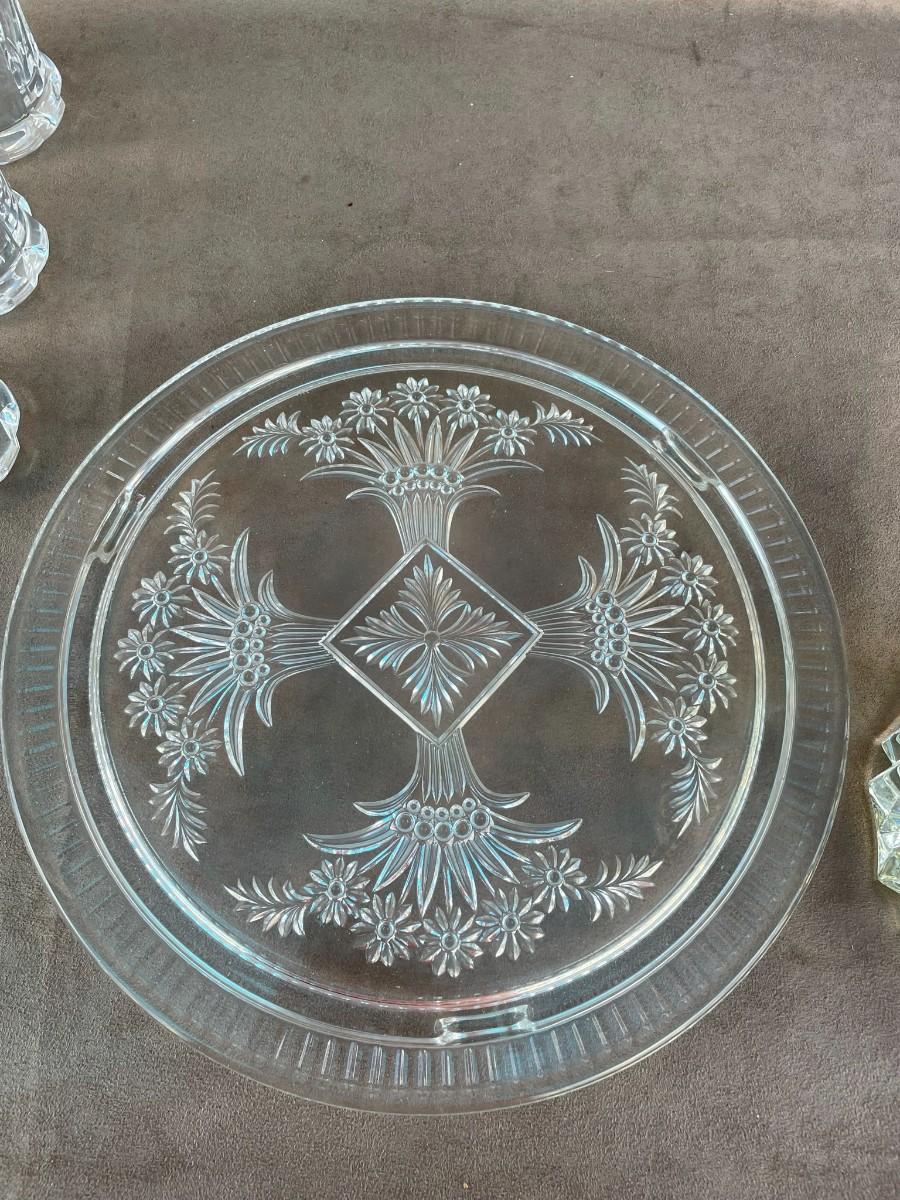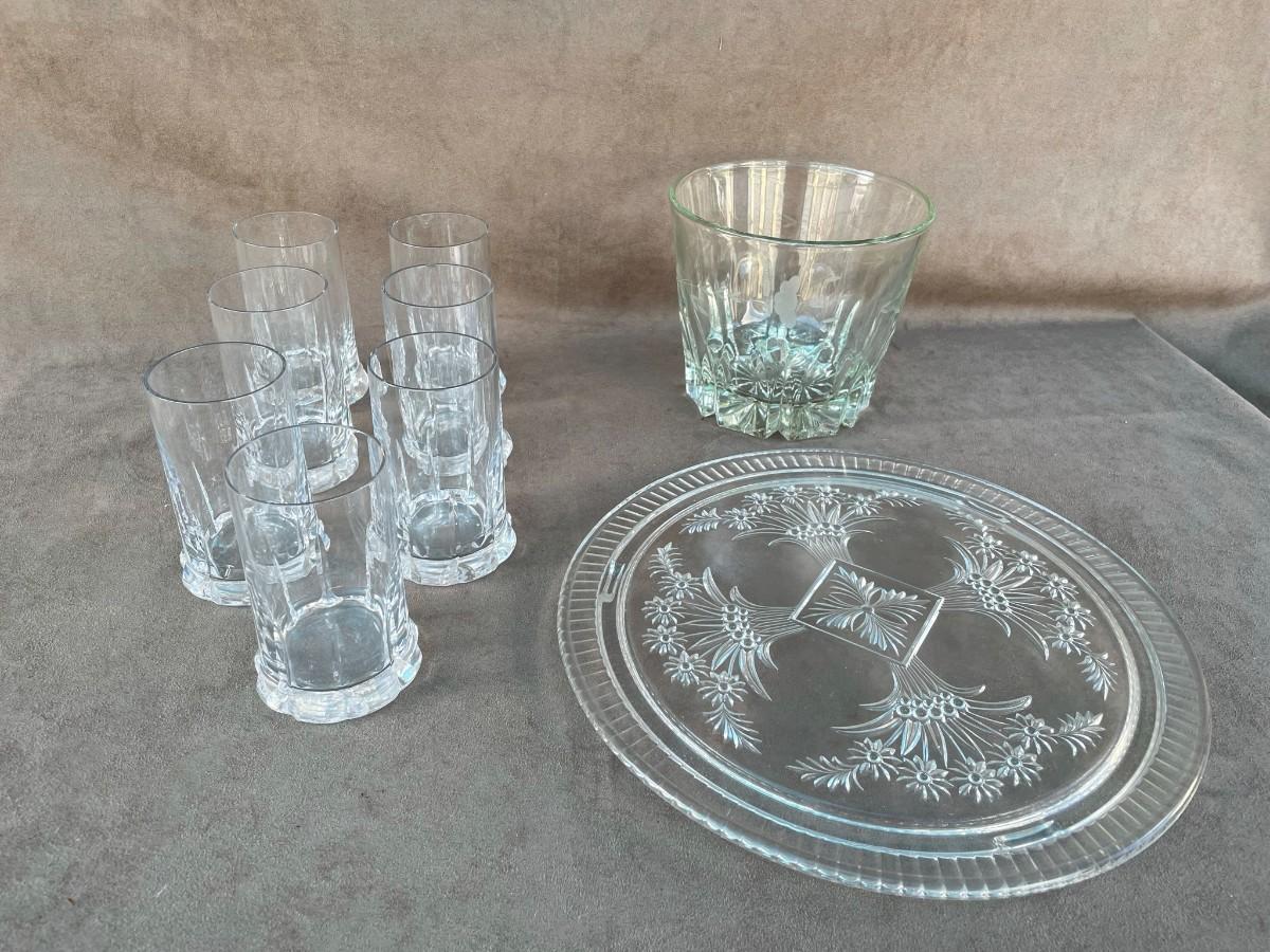 7 Glasses, Footed Cake Plate & Glass Ice Bucket