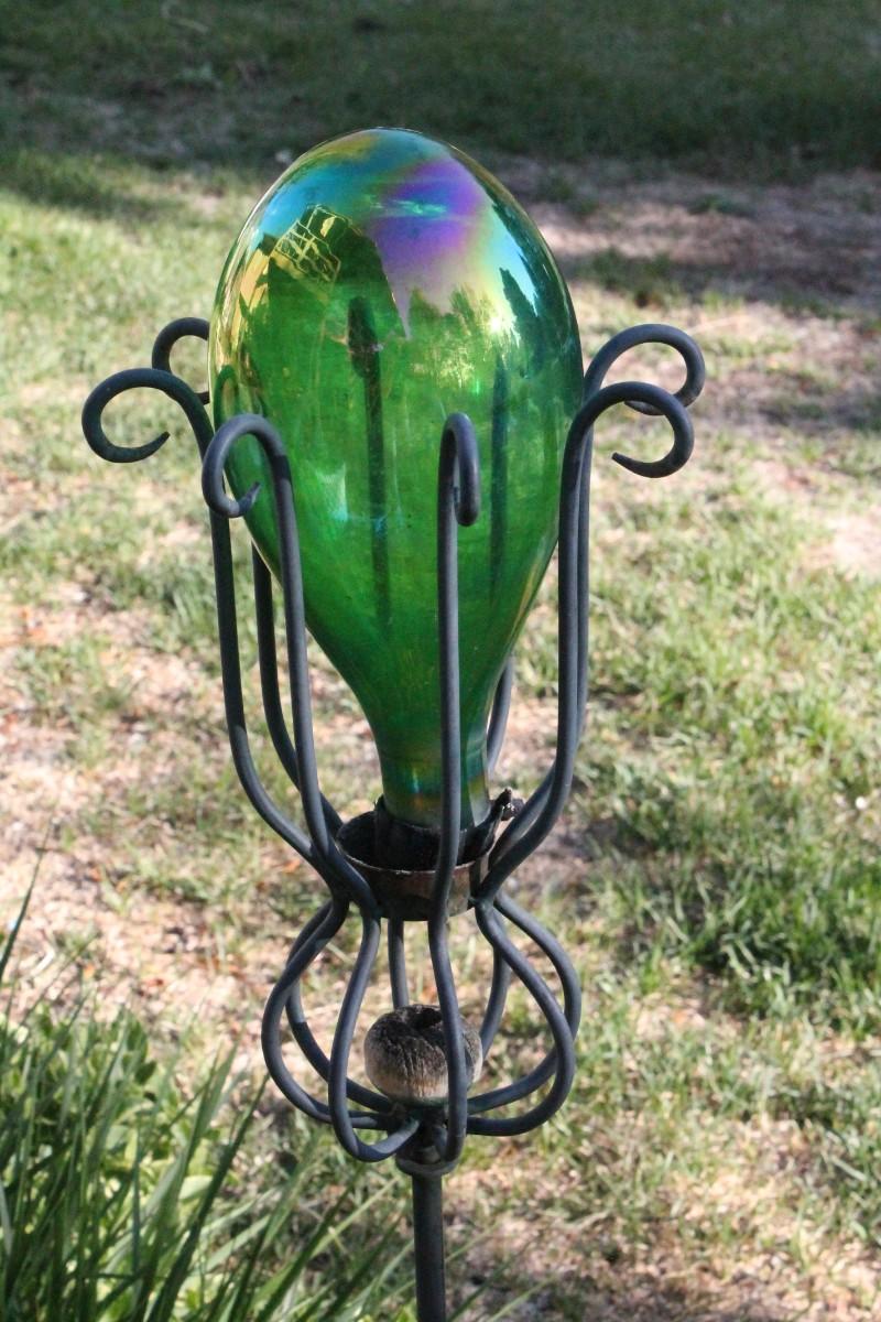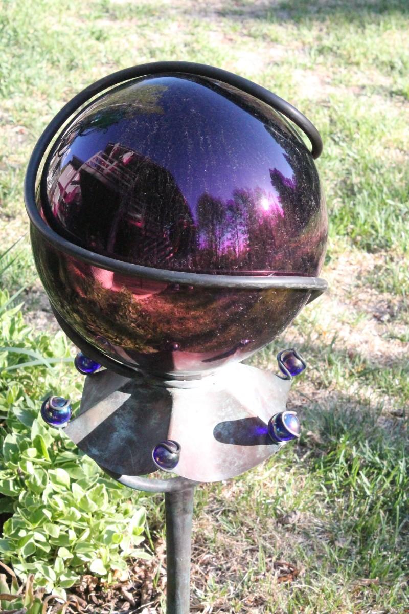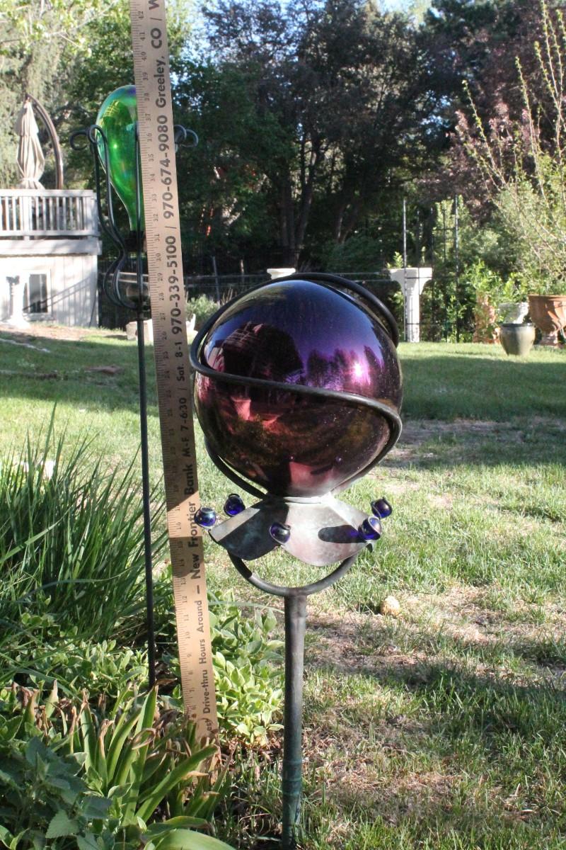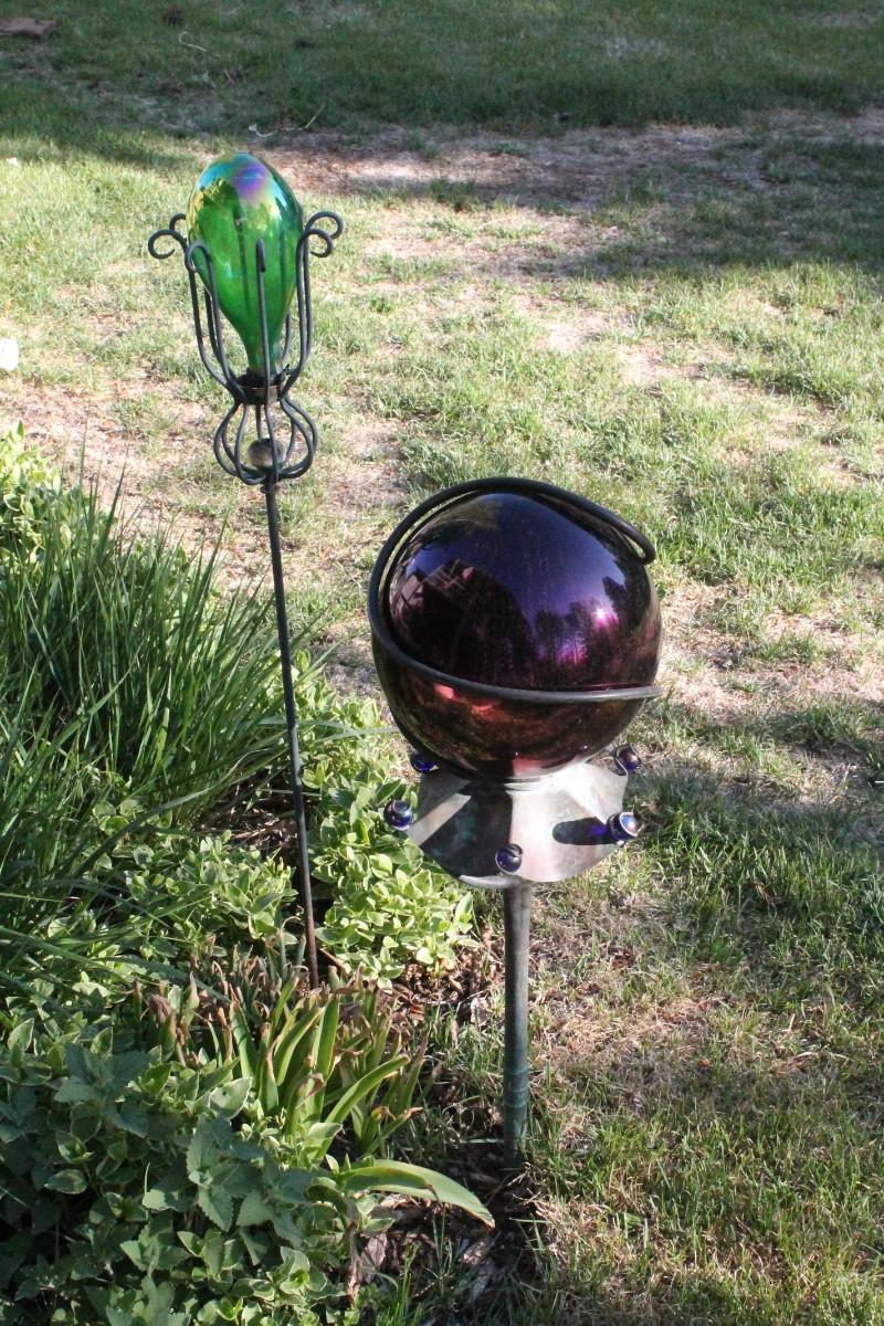This lot contains two different styles of garden gazing balls. One is Green and the other a dark purple.
