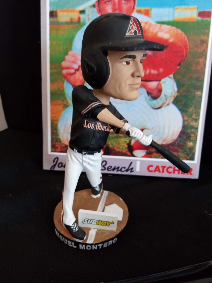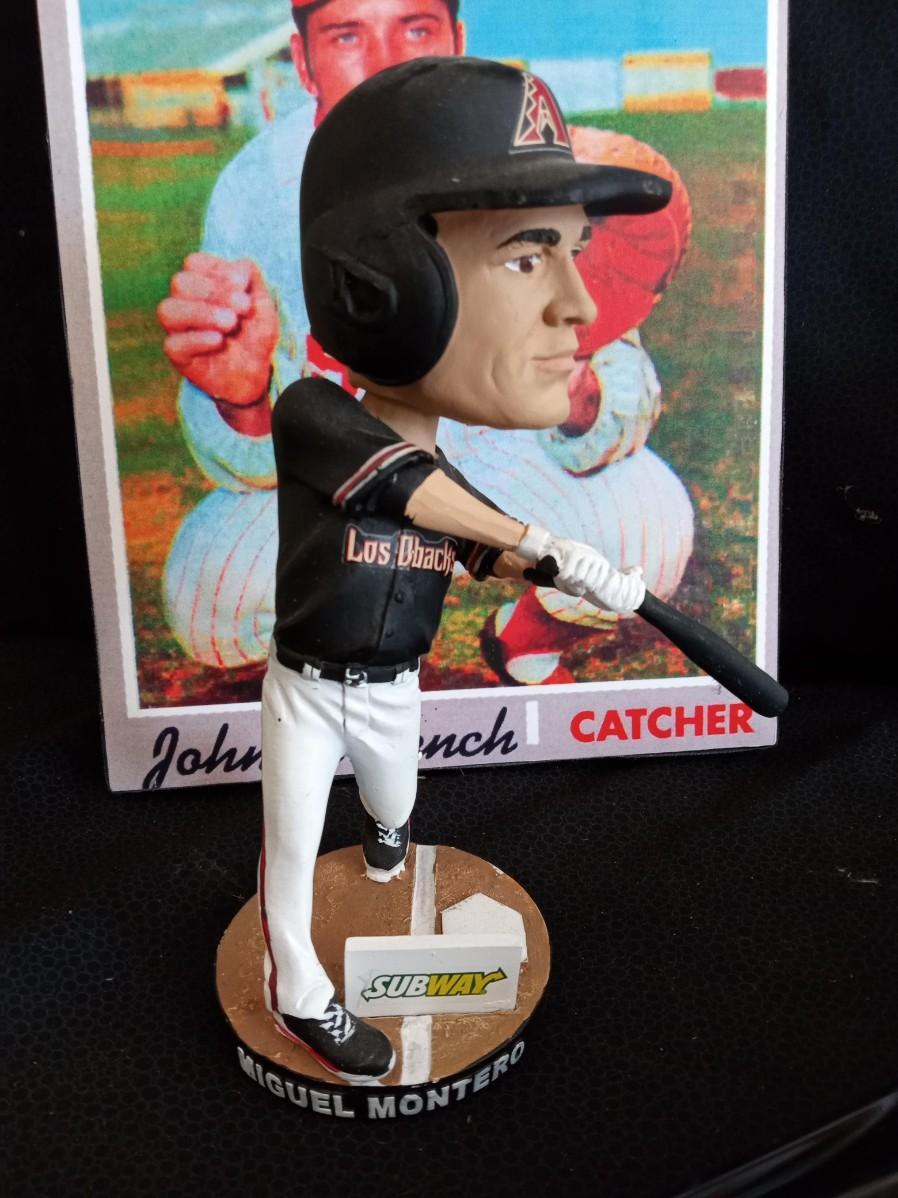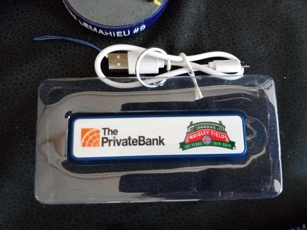 WINTER SCARF, SMALL WOODEN BASEBALL BAT, DJ LEMAHIEU AND MIGUEL MONTERO BOBBLEHEADS, VINTAGE PROGRAM, JOHNNY BENCH PICTURE, BASEBALL AND AN USB FOR WRIGLEY FIELD