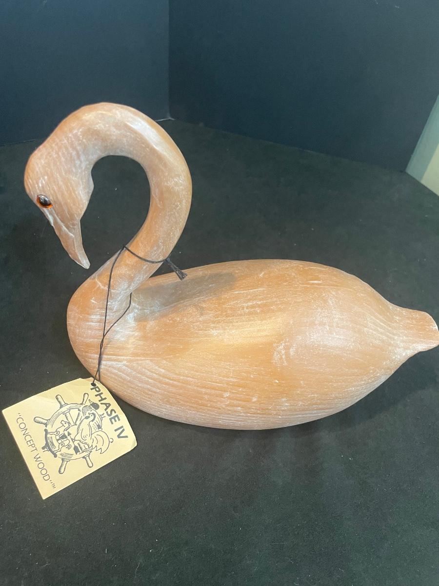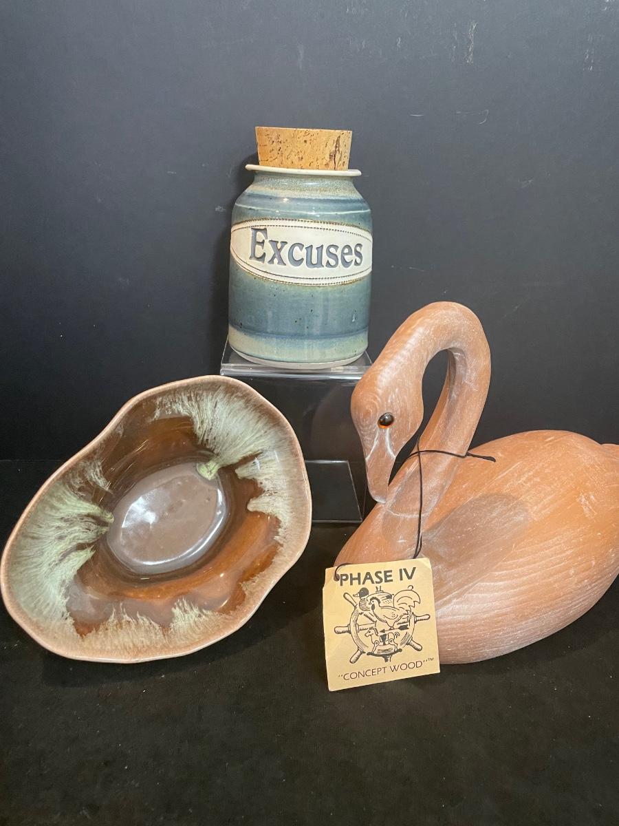 Wooden 9" x 9" swan, pottery vase and "Excuses" jar.