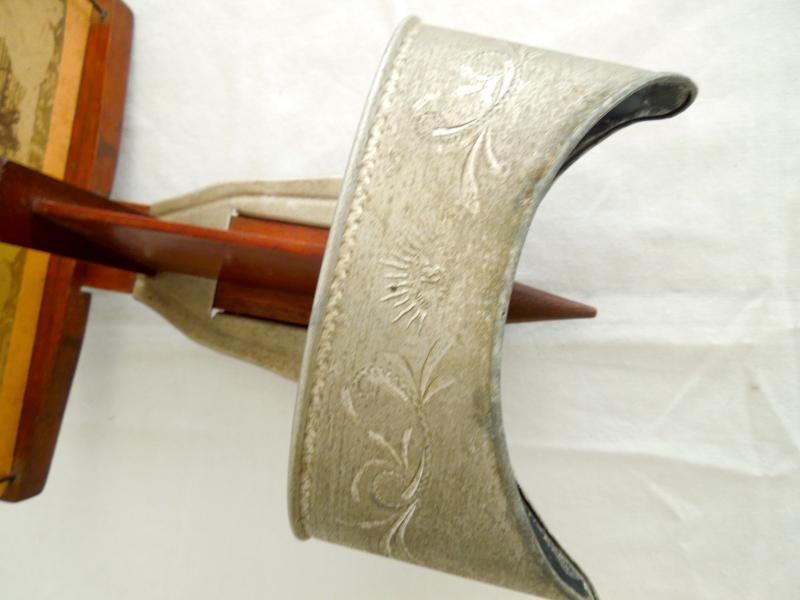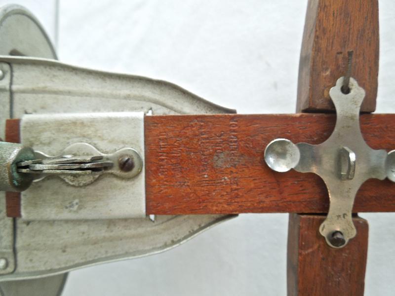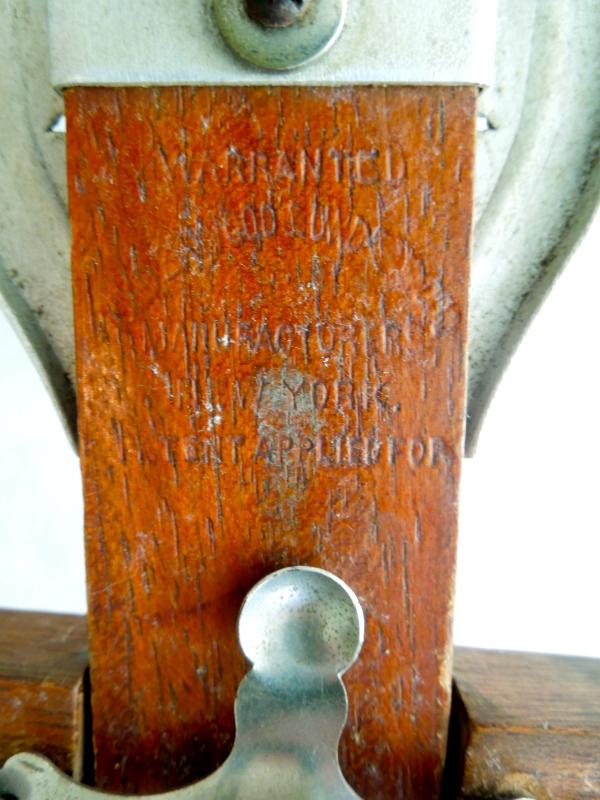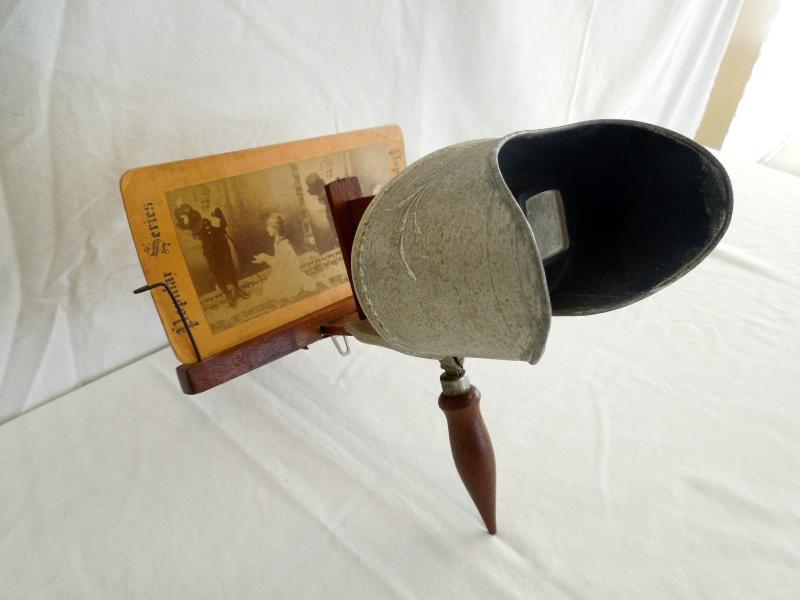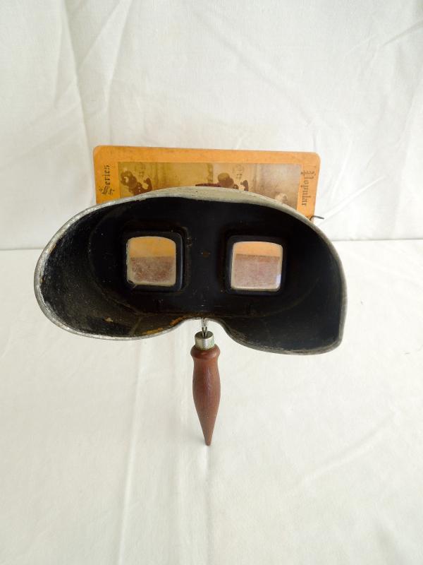 Scope is in very nice working condition. Made of embossed aluminum and wood. Handle folds. Cards have some damage and fading. Most recent card is stamped 1900. Cards measure 7" x 3.5"