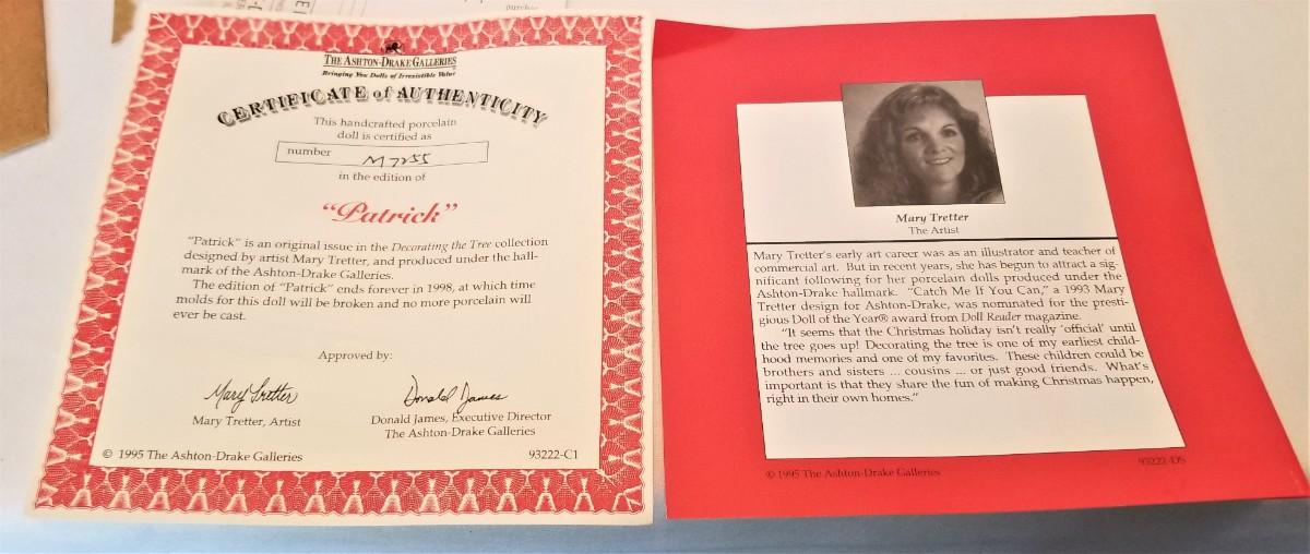 From the "Decorating the Tree" series - "Patrick" doll from Ashton Drake galleries. complete in box - never played with. Produced from 1995-1998. Ltd edition #M7255. The lights actually light up. These have been in storage, but they are like new. These were expensive dolls when they were purchased.